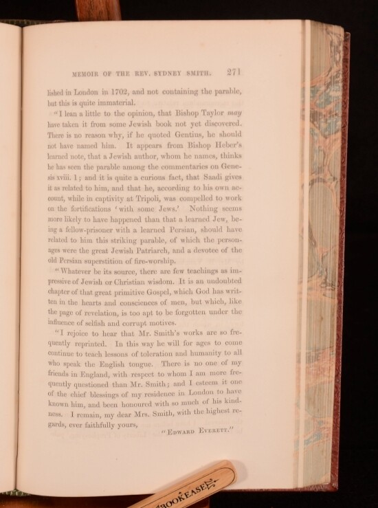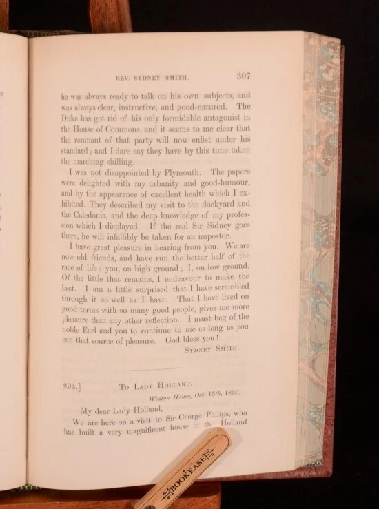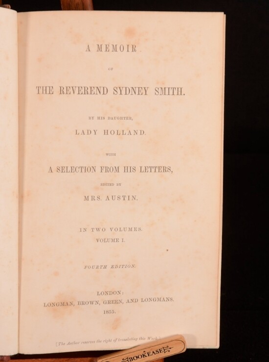 Click here to see our other books! A Memoir of the Reverend Sydney Smith With a Selection of his Letters Lady Holland, Mrs Austin (ed) 1855 Longmans, Brown, Green and Longmans : London 8" by 5" xvi, 486pp; xiv, 546pp. SUMMARY An affectionate memoir of wit, writer and cleric Sydney Smith. Leather Binding Overall Condition: Very Good This book weighs 2 KG when packed UK Postage: £ 3.99 US Postage: £ 29.99 EU Postage : £ 21.99 European Postage: £ 23.99 Asia Postage: £ 37.99 Worldwide Postage: £ 38.99 DESCRIPTION Written by his daughter, Lady Saba Holland, the second wife of Sir Henry Holland. Sydney Smith published several sermons and religious work. His reputation among contemporaries was that of a humorist. He was known to make jest of religious subjects. He is known in the United States for his rhyming recipe for salad dressing. CONDITION In full, diced calf prize bindings. Externally, generally smart. rubbing to boards and spine. Prize bookplate from Harrow school to front pastedown of Vol I addressed to E H Allen. Internally, generally firmly bound though strained in places. Pages are bright. Scattered spots to first and last few pages, otherwise generally clean. Overall Condition: Very Good GLOSSARY OF TERMS Overall Condition (Dustwrapper condition rating is shown after that for the book itself, where a dustwrapper is present) Fine - Very well preserved copy showing very little wear Very Good Indeed - Only one or two minor faults, really a very attractive copy Very Good - Quite a wide term meaning no major faults but probably several smaller ones often expected given the age of the book, but still a respectable copy Good - Meaning not very good. Some more serious faults as will be described in the condition report under 'condition' Good Only - Meaning one or more faults that could really do with repair Fair - As with good only above but with other faults leaving a compromised copy even after repair Poor - Really bad and possibly seriously incomplete. We only sell books in this condition where their rarity or value makes them attractive none the less. Major defects will be described. GUARANTEE We offer a full money back guarantee on our descriptions. Please ask for details and conditions. We prefer PAYPAL. If you pay via PAYPAL we will post the item off the same or the next working day with the postage you have selected. Please note we cannot accept USD cheques