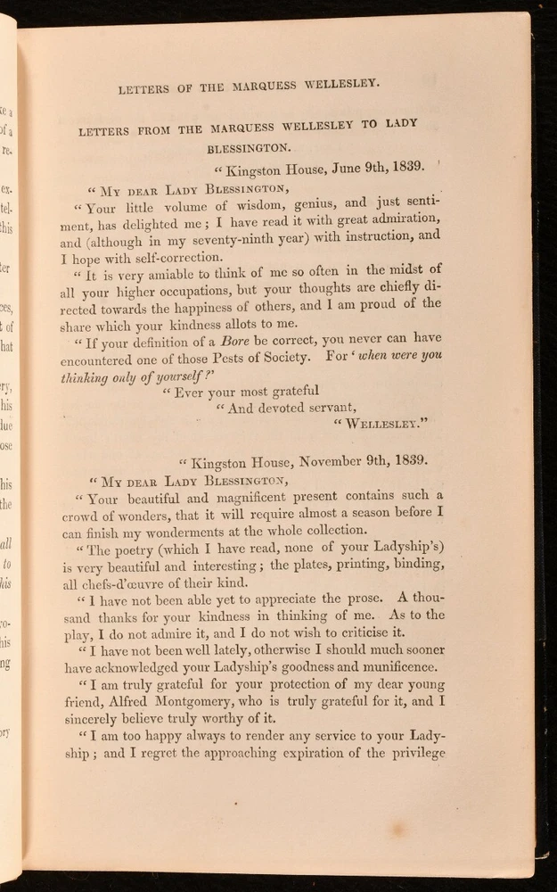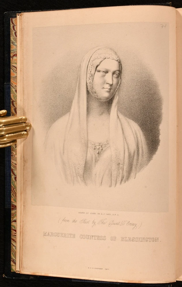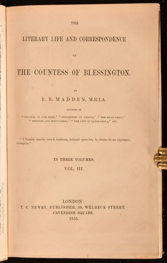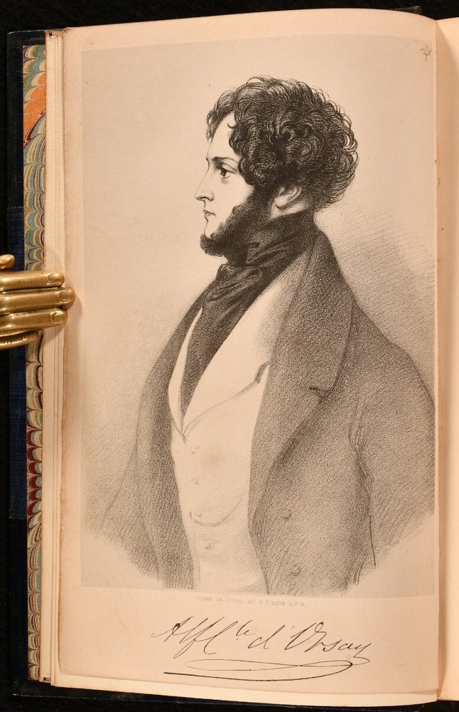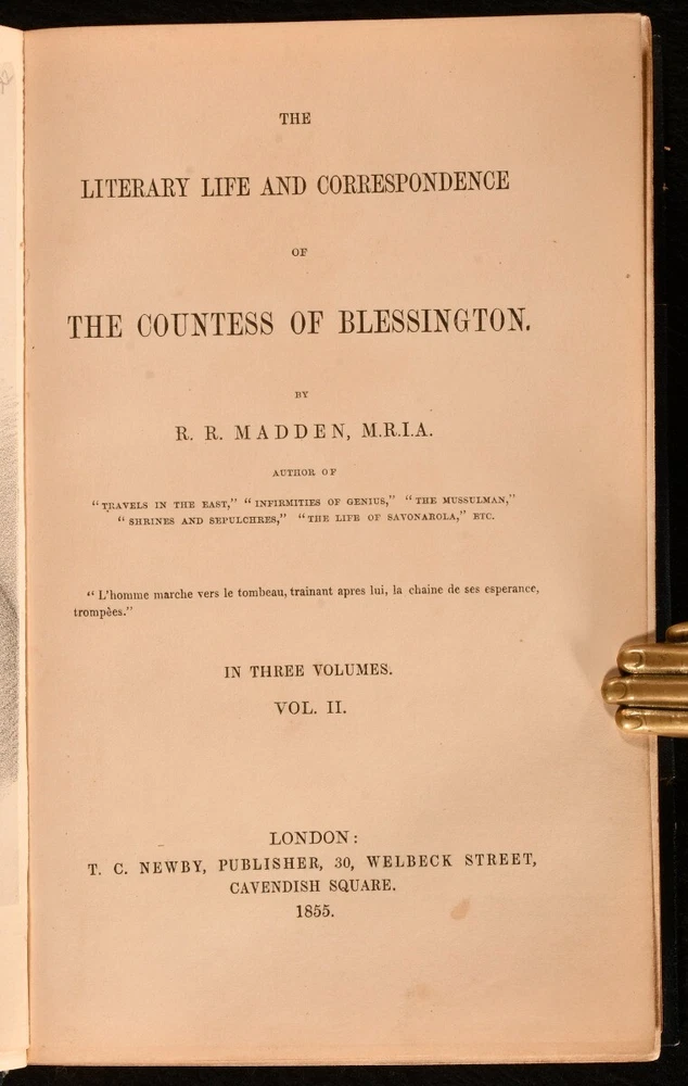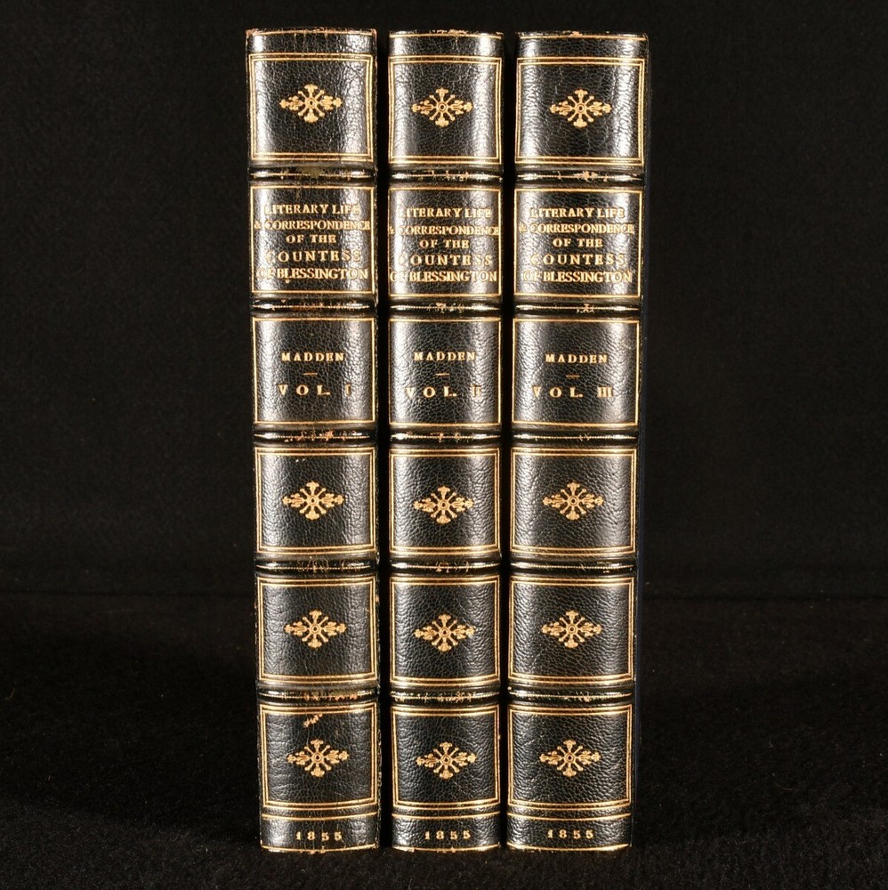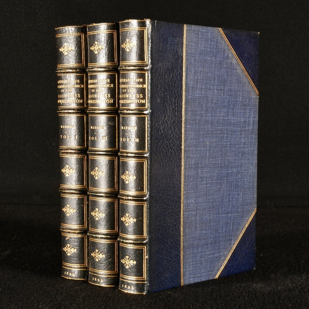 Click here to see our other books! The Literary Life and Correspondence of the Countess of Blessington R. R. Madden; Marguerite Gardiner, Countess of Blessington 1855 T. C. Newby : London 9" by 6" viii [1], 2-491; 484; 555 [1]pp SUMMARY A lovely copy of the first edition of R. R. Madden's account of the life and correspondence of the Countess of Blessington. In lovely half crushed morocco signed bindings from Henry Sotheran. Early Edition,First Edition,Leather Binding,Signed Binding Overall Condition: Very Good Indeed This book weighs 3 KG when packed UK Postage: £ 3.99 US Postage: £ 36.99 EU Postage : £ 25.99 European Postage: £ 27.99 Asia Postage: £ 47.99 Worldwide Postage: £ 69.99 DESCRIPTION With a frontispiece to each volume, and a further engraved portrait to volume II. Collated, complete. The Countess of Blessington, a known acquaintance of Lord Byron, was exceedingly beautiful and an accomplished hostess who shrugged off any attempt at conventional respectability. The Countess's name has been handwritten to the title page of volume III by a contemporary owner. The rumours surrounding the relationship between her, her husband the Earl of Blessington, and Count Alfred d'Orsay was memorably treated by Michael Sadleir in his 1937 study 'Blessington d'Orsay: A Masquerade', and the biography 'The Strange Life of Lady Blessington'. Author Richard Robert Madden was an Irish doctor, writer, abolitionist and historian, who made the acquaintance of Lady Blessington in 1823, and remained a close friend and confidant throughout her life, with access to her papers following her death. With the armorial bookplate of R. St. M. Delius to each front pastedown. Sadleir terms this work 'indispensable to any study of the life of Lady Blessington'. CONDITION In half crushed morocco signed bindings, with cloth covered boards. A touch of rubbing to joint heads and tails, with minor losses to leather in these regions. Armorial bookplates to front pastedowns. Internally, firmly bound. Significant spotting to blanks, with pages otherwise generally clean and bright. Overall Condition: Very Good Indeed GLOSSARY OF TERMS Overall Condition (Dustwrapper condition rating is shown after that for the book itself, where a dustwrapper is present) Fine - Very well preserved copy showing very little wear Very Good Indeed - Only one or two minor faults, really a very attractive copy Very Good - Quite a wide term meaning no major faults but probably several smaller ones often expected given the age of the book, but still a respectable copy Good - Meaning not very good. Some more serious faults as will be described in the condition report under 'condition' Good Only - Meaning one or more faults that could really do with repair Fair - As with good only above but with other faults leaving a compromised copy even after repair Poor - Really bad and possibly seriously incomplete. We only sell books in this condition where their rarity or value makes them attractive none the less. Major defects will be described. GUARANTEE We offer a full money back guarantee on our descriptions. Please ask for details and conditions. We prefer PAYPAL. If you pay via PAYPAL we will post the item off the same or the next working day with the postage you have selected. Please note we cannot accept USD cheques