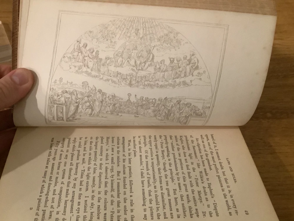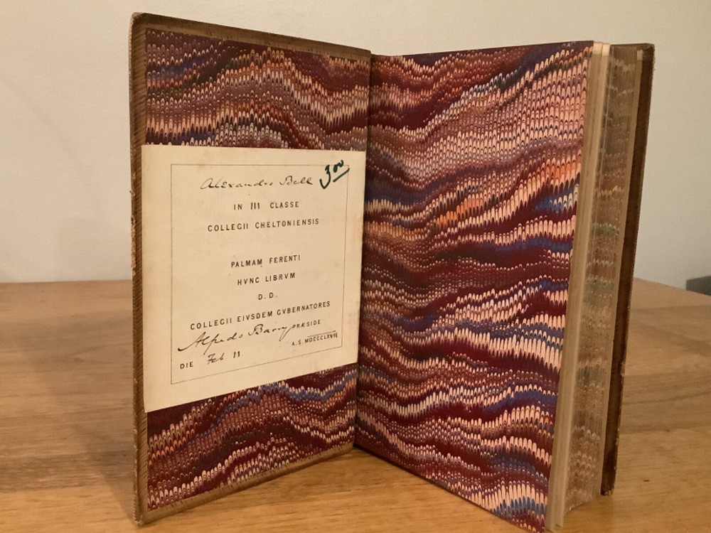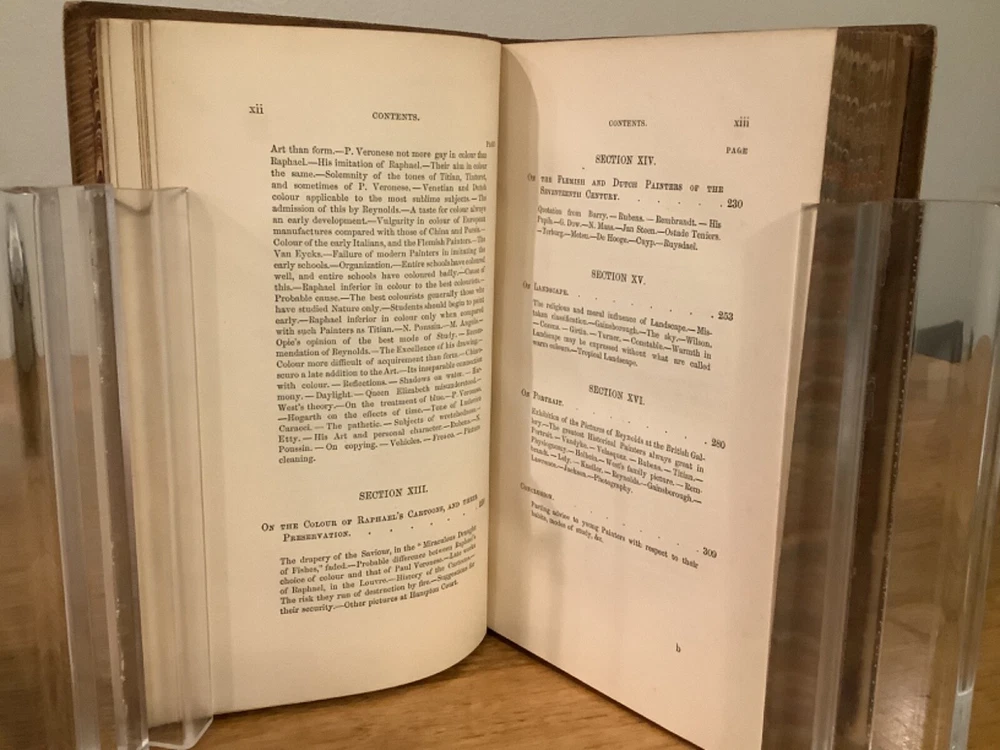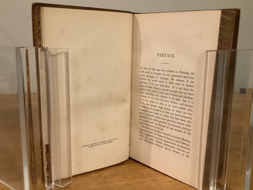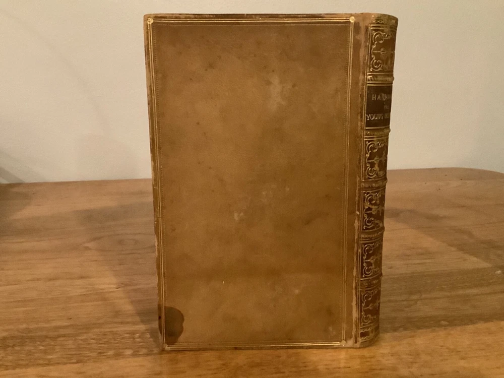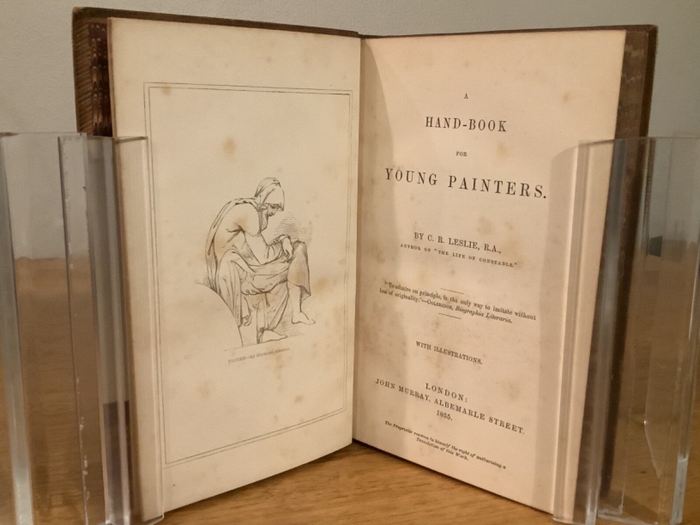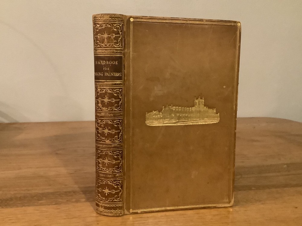 A Hand-Book For Young Painters. By Charles Robert Leslie and printed in London by John Murray. 1855, 313 pp, 7.5 x 5”, 8vo, full leather hardcover. In good condition, with minor scuffing and wear to boards and spine, primarily along edges and corners. Hinges are tight and text block is bound well. 1867 bookplate in Latin from Cheltenham College on front pastedown. Light marginalia. Includes occasional black-and-white plates throughout. General age-related toning to pages, along with periodic foxing and wear. Please see photographs and ask any questions prior to purchasing. A scarce and beautifully preserved reference tool for art students. COLA1855AFGB-0623-aj0166