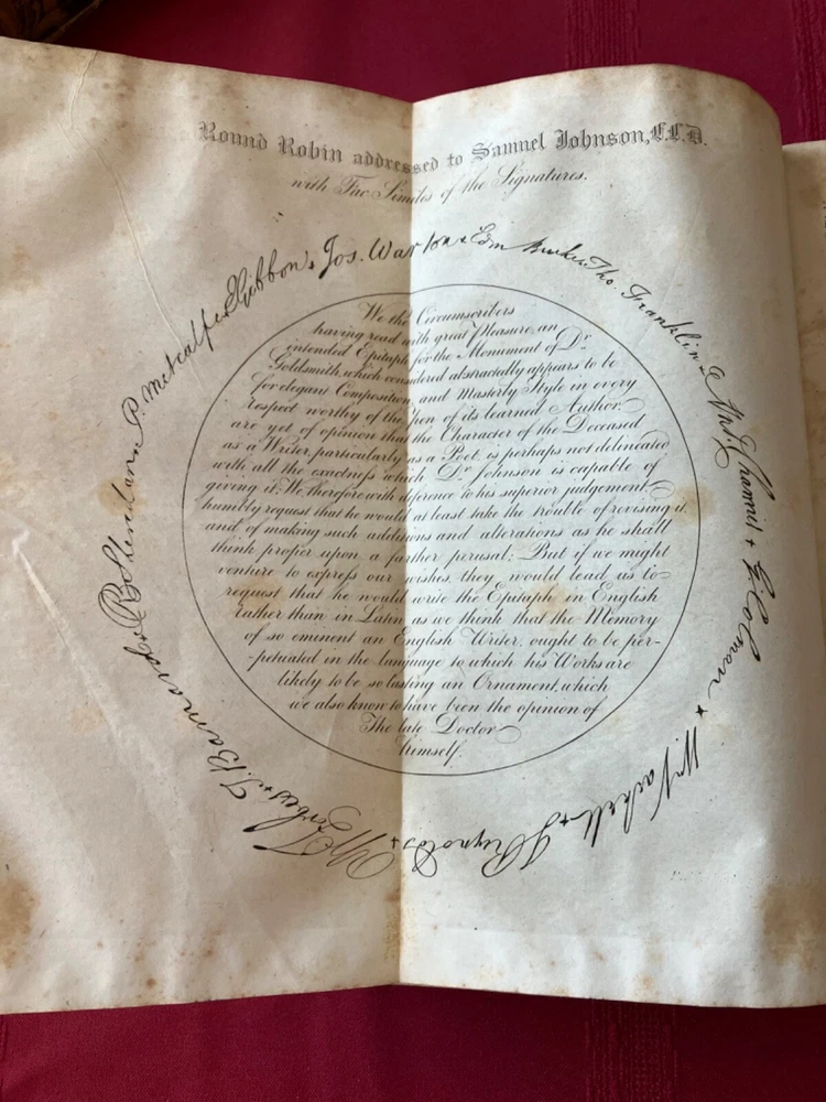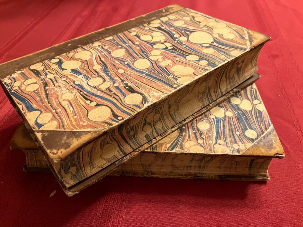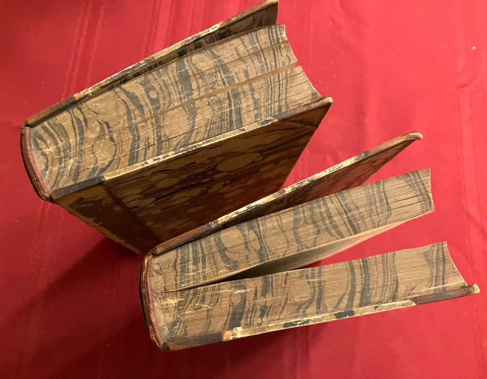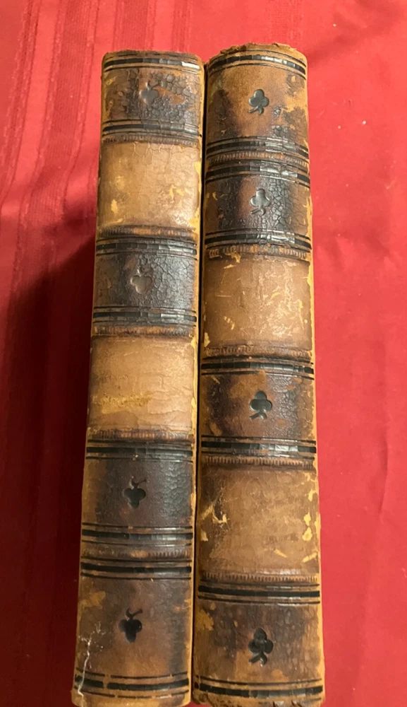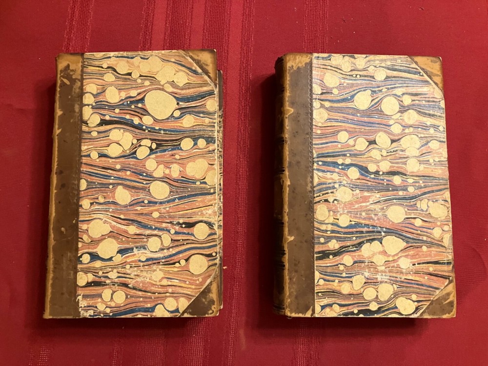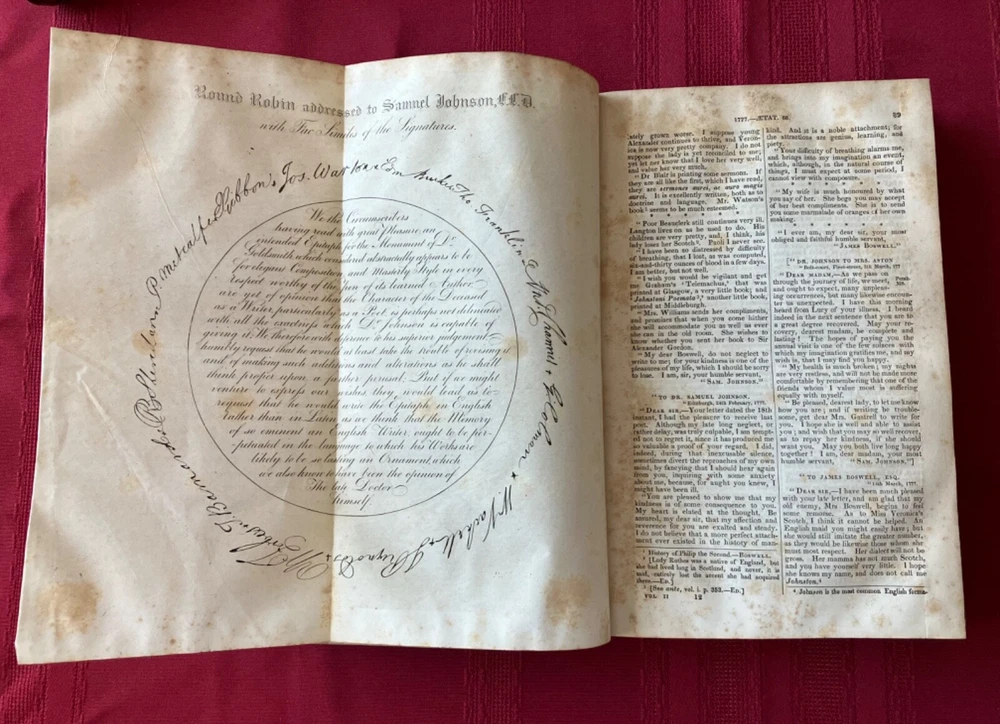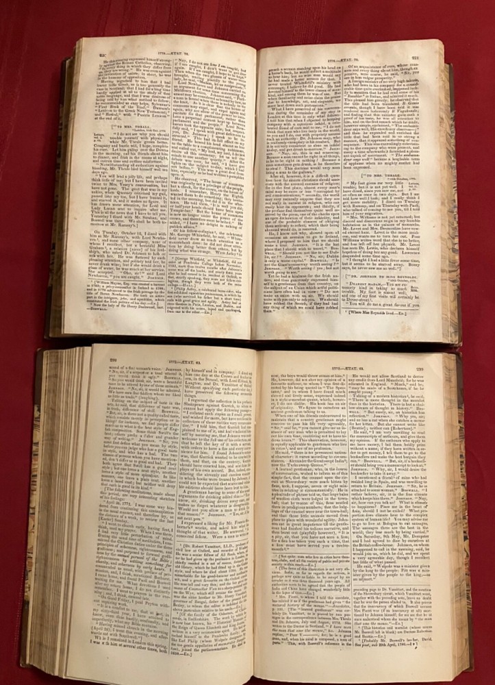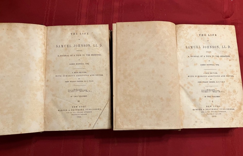 The Life of Samuel Johnson Including a Journal to the Tour of Hebrides by James Boswell. Numerous Additions and Notes by John Wilson Croker. Published by Harper & Brothers, New York, 1856. 2 volumes complete. Handsome books, with half-leather binding and marbled covers, endpages, and edges. Intact facsimile pull out of Round Robin addressed to Johnson with signatures. Please see condition description. Books measure approx. 6" x 9." Condition: Aged condition, with scuffed leather and boards and some cover peeling. Owner name and pencil notation on endpage. Notable foxing to endpages, title pages, and anterior and rear pages - but mild foxing for most of central text pages and highly readable. The hinges are cracked, but the pages are holding and tight, overall. There may have been some restoration at some point. Outside of the foxing, the pages may have some occasional stains or marks.