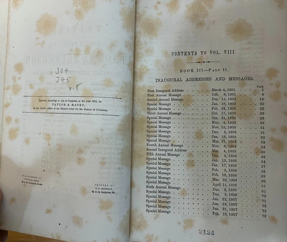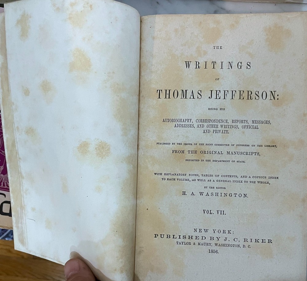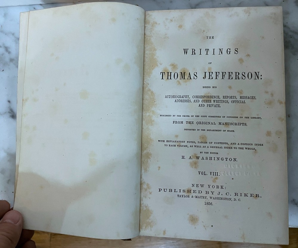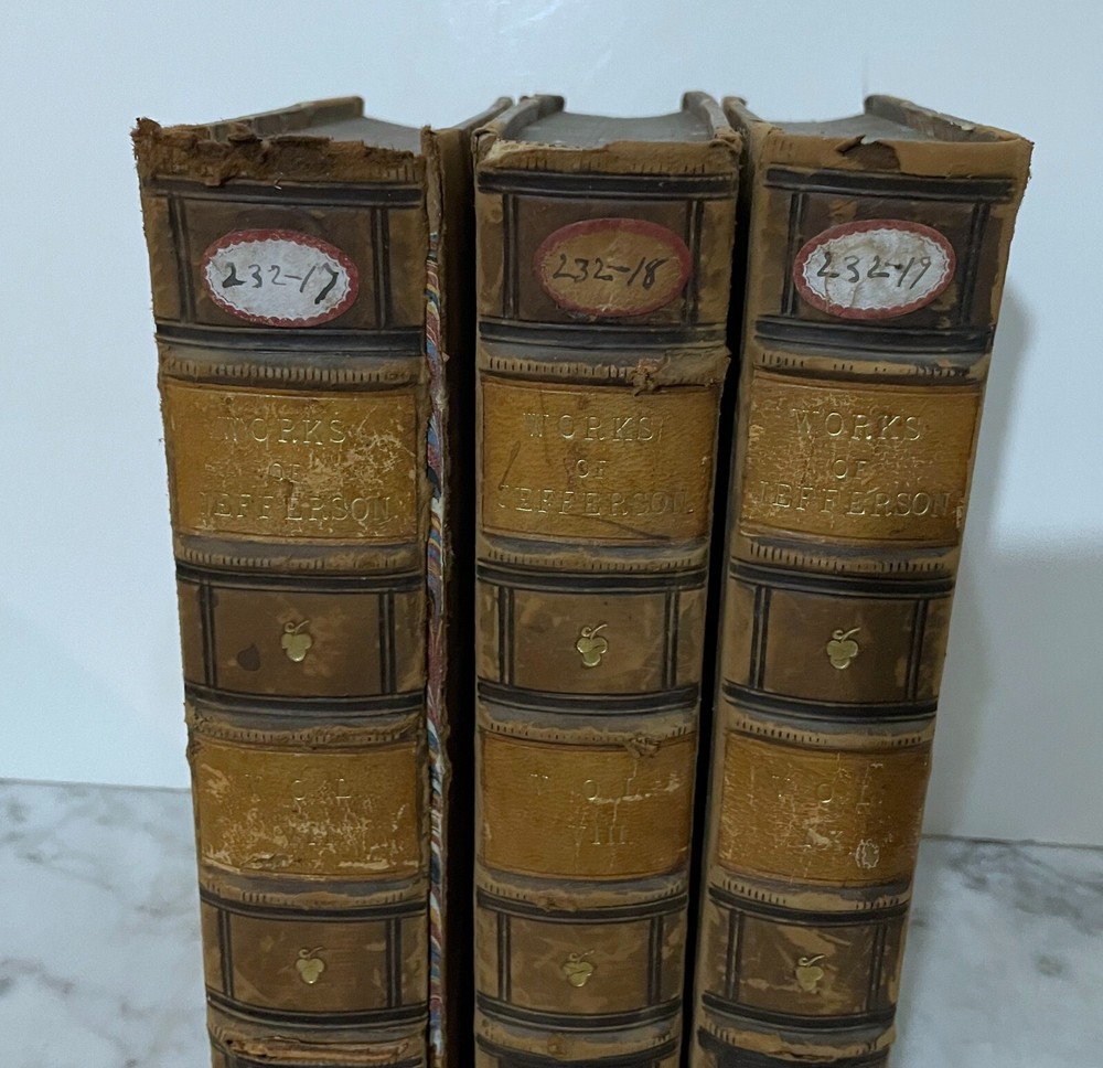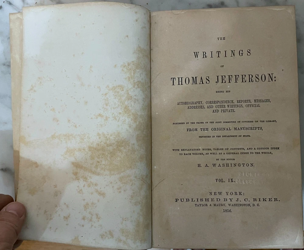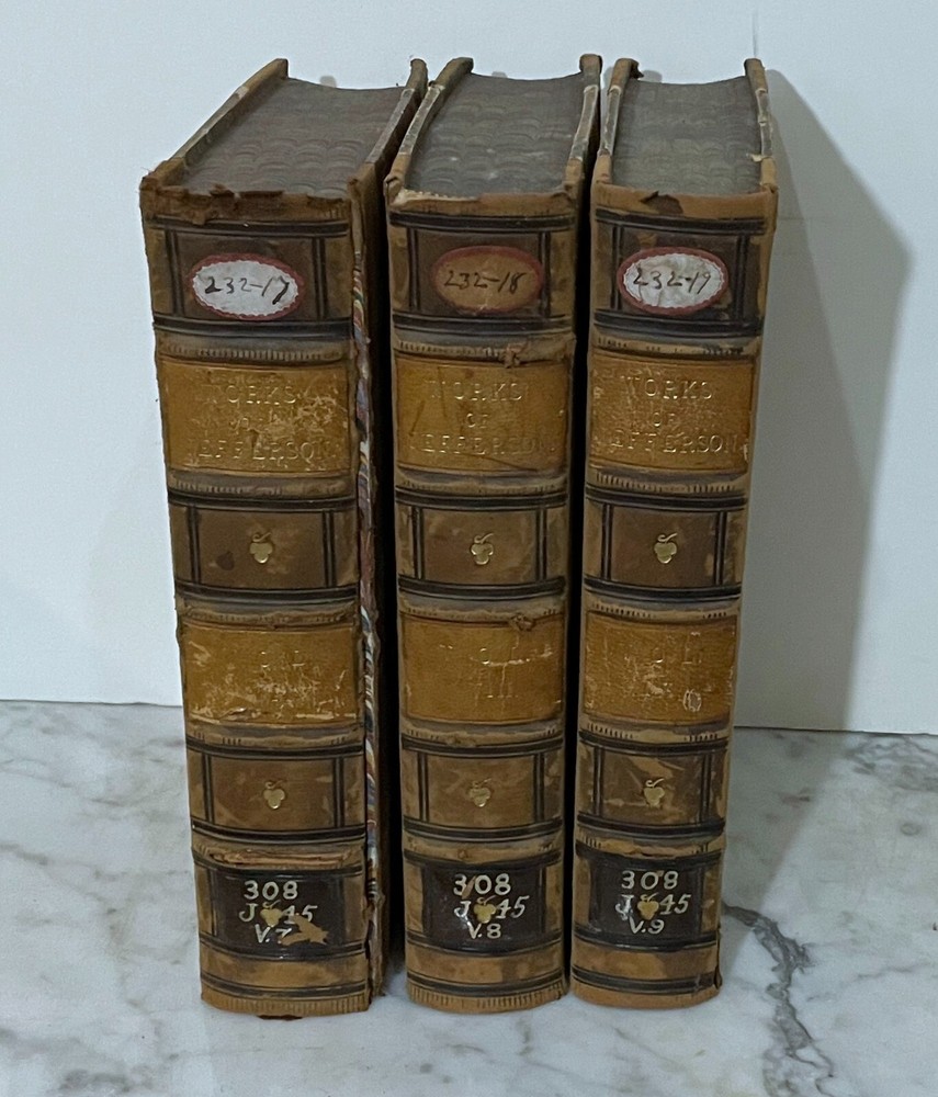 1856 VOLS VII, VII, IX - THE WRITTINGS OF THOMAS JEFFERSON - BY H. A. WASHINGTON The Writings of Thomas Jefferson: Being His Autobiography, Correspondence, Reports, Messages, Addresses, and Other Writings, Official and Private. Publisher: J. C. Ricker, 1856, Leatherbound, 3 volumes (VII, VII & IX) Author: H. A. Washington (as Editor) Condition: In antique condition, foxing throughout, vol VII has the cover dettached, some markings and old labels. Condition as shown in photos. I hope to make this a very happy and smooth transaction. Feel free to contact me with any questions