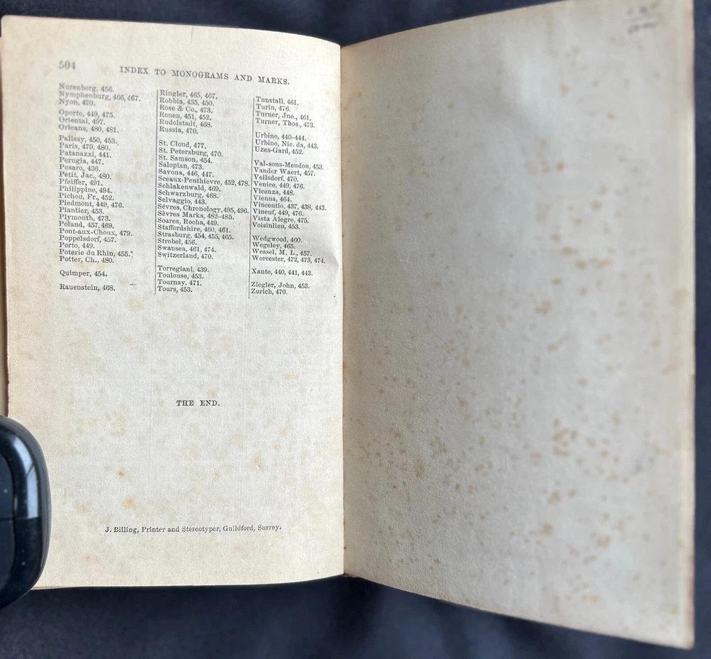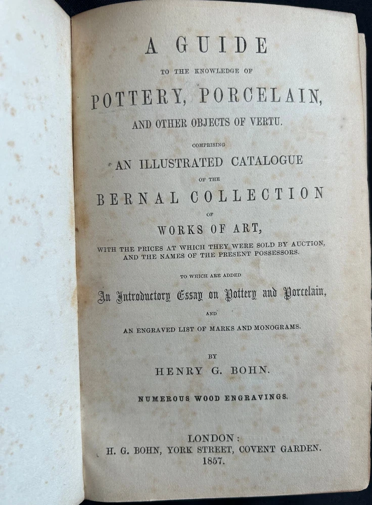 1857 A Guide To The Knowledge Of Pottery, Porcelain, And Other Objects Of Virtue. Comprising An Illustrated Catalogue Of The Bernal Collection Of Works Of Art, With The Prices At Which They Were Sold By Auction, And The Names Of The Present Possessors. To Which Are Added "An Introductory Essay On Pottery And Monograms". By Henry G. Bohn. Numerous Wood Engravings. London: H.G.Bohn, York Street, Covent Garden. 1857. 504 pages.