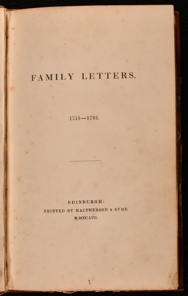 Click here to see our other books! Family Lettters 1745-1793 Ann Graeme; Eliza Fergusson 1857 Macpherson & Syme : Edinburgh 9" by 5.5" [2], 71pp SUMMARY A very scarce copy of this collection of Fergusson family letters. First Edition,Leather Binding,Very Scarce Overall Condition: Very Good This book weighs 0.5 KG when packed UK Postage: £ 3.99 US Postage: £ 15.99 EU Postage : £ 13.99 European Postage: £ 14.99 Asia Postage: £ 18.99 Worldwide Postage: £ 19.99 DESCRIPTION A very scarce copy of Family Letters between the years 1745-1793. The explanatory notes are supplied by Eliza Graeme Fergusson. There are letters from Ann Graeme's father Thomas Graeme when she was a young girl and her mother. With a bookplate for J. Maxtone Graham. CONDITION In half morocco binding with marbled covered boards. Externally, smart with some marks to the boards. With a bookplate for J. Maxtone Graham to the reverse of the front free endpaper. There is a small hole through the bottom of the first twenty pages. Internally, firmly bound with generally bright and clean pages. Overall Condition: Very Good GLOSSARY OF TERMS Overall Condition (Dustwrapper condition rating is shown after that for the book itself, where a dustwrapper is present) Fine - Very well preserved copy showing very little wear Very Good Indeed - Only one or two minor faults, really a very attractive copy Very Good - Quite a wide term meaning no major faults but probably several smaller ones often expected given the age of the book, but still a respectable copy Good - Meaning not very good. Some more serious faults as will be described in the condition report under 'condition' Good Only - Meaning one or more faults that could really do with repair Fair - As with good only above but with other faults leaving a compromised copy even after repair Poor - Really bad and possibly seriously incomplete. We only sell books in this condition where their rarity or value makes them attractive none the less. Major defects will be described. GUARANTEE We offer a full money back guarantee on our descriptions. Please ask for details and conditions. We prefer PAYPAL. If you pay via PAYPAL we will post the item off the same or the next working day with the postage you have selected. Please note we cannot accept USD cheques