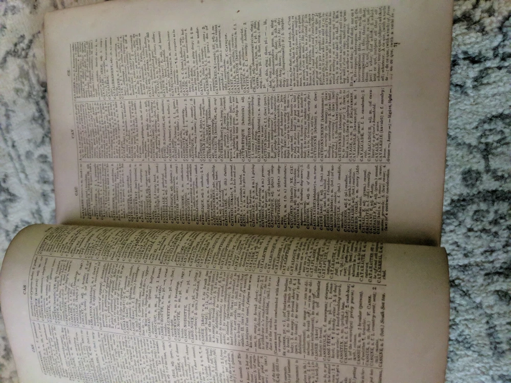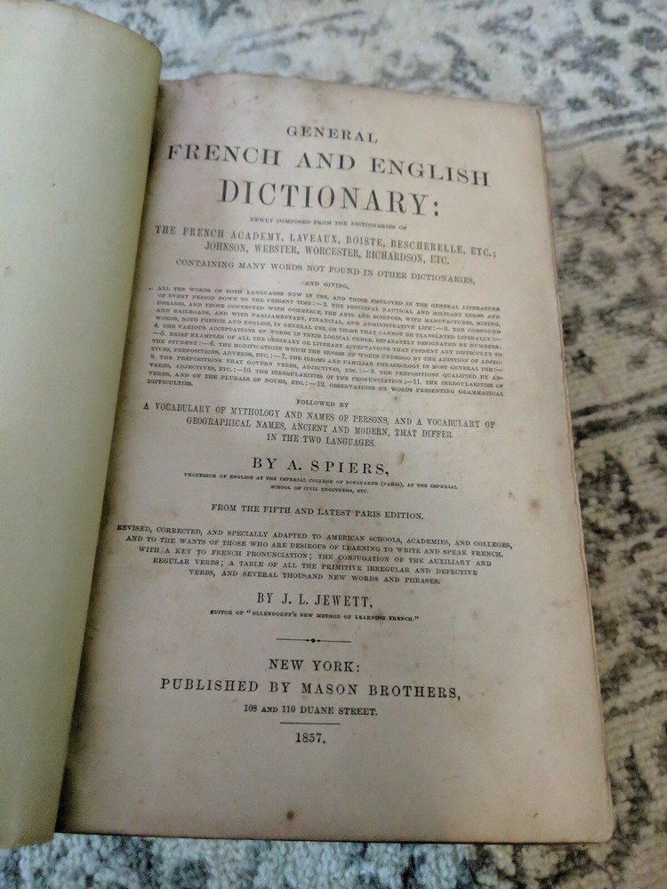 1857 General French & English Dictionary by Spiers & Jewett. Some wear. Spine is peeling away from book. Still good. Binding good Shipped with USPS Media Mail.