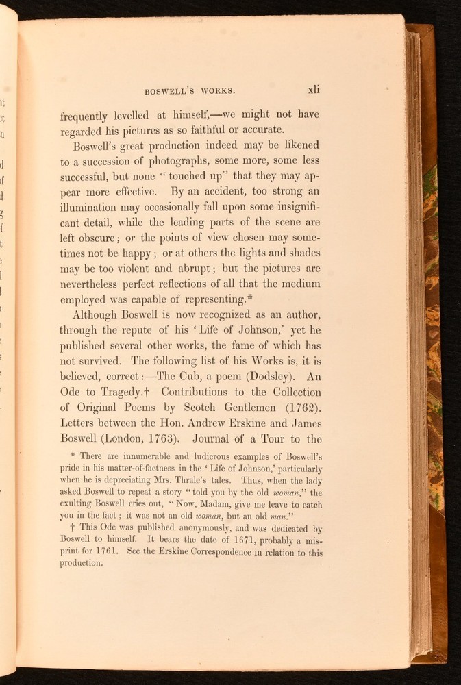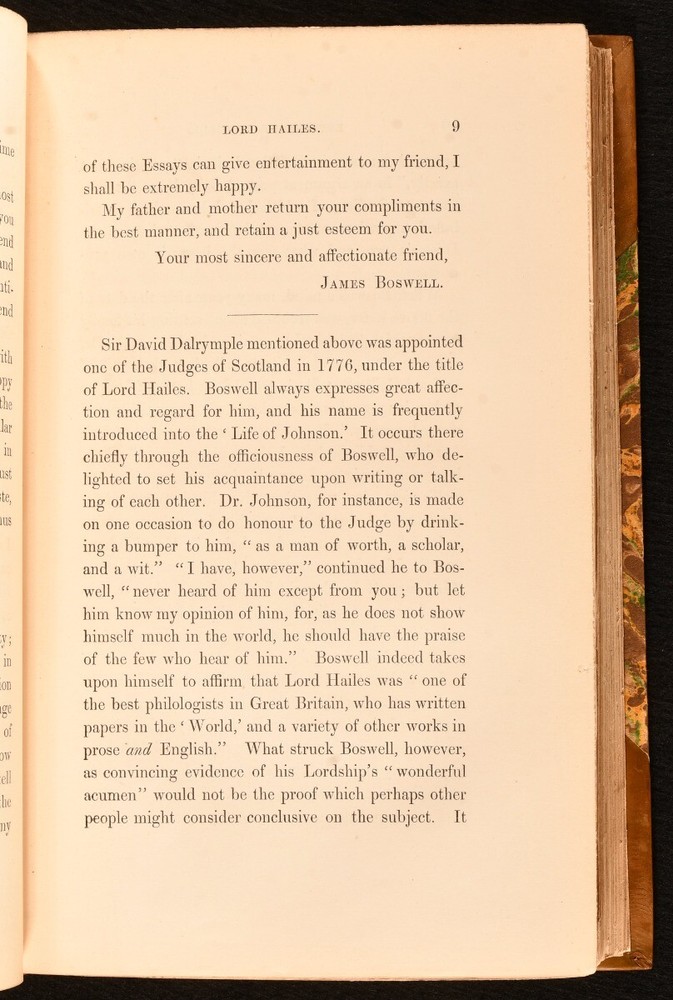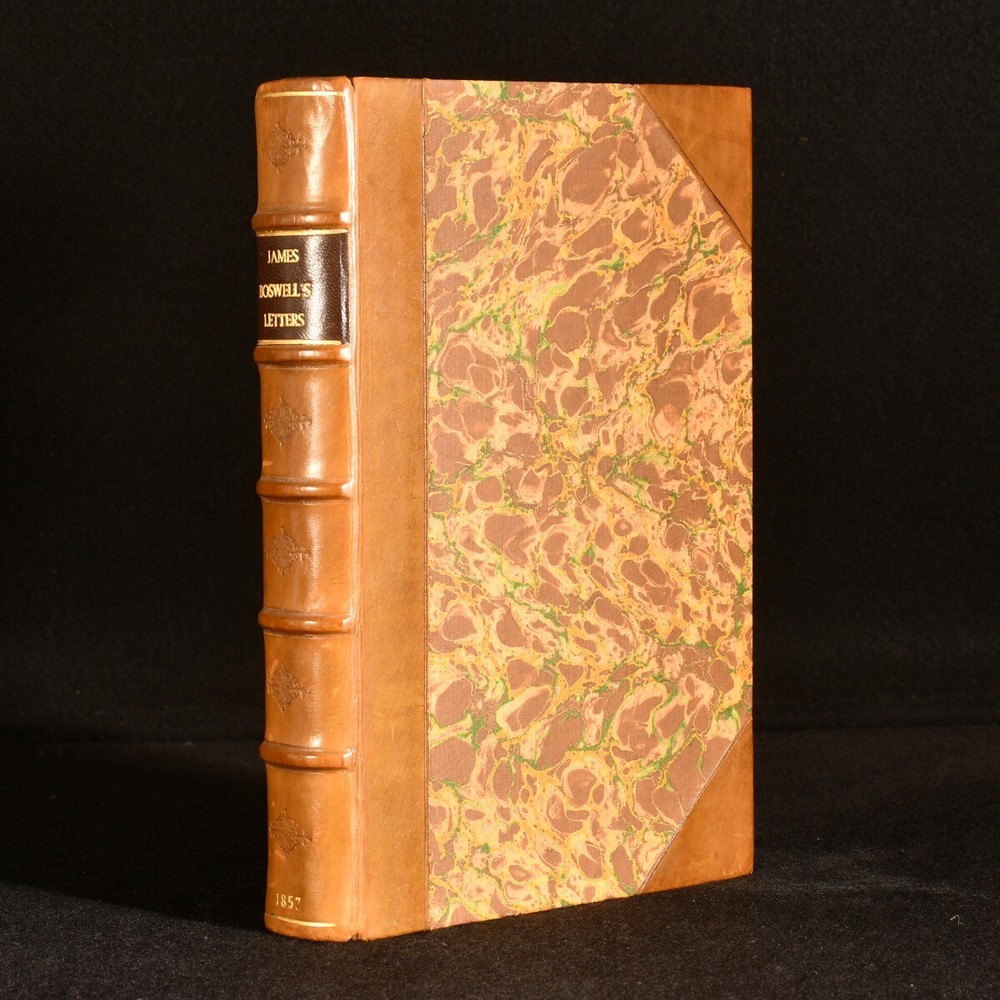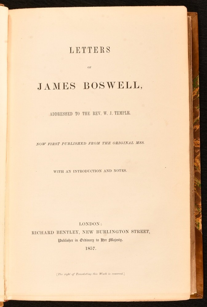 Click here to see our other books! Letters of James Boswell Addressed to the Rev. W. J. Temple James Boswell 1857 Richard Bentley : London 9" by 6" xlviii, 407pp. SUMMARY A smart first edition of this collection of letters written by James Boswell to the Reverend William Johnson Temple. First Edition,Leather Binding Overall Condition: Near Fine This book weighs 1 KG when packed UK Postage: £ 3.99 US Postage: £ 22.99 EU Postage : £ 16.99 European Postage: £ 17.99 Asia Postage: £ 22.99 Worldwide Postage: £ 28.99 DESCRIPTION First edition. Published from the original manuscripts. A collection of letters from James Boswell, a Scottish biographer, diarist, and lawyer, written to William Johnson Temple, an English cleric and essayist. Both figures are now remembered as correspondents of one another. With letters from 1758 to Boswell's death in 1795. CONDITION Bound in half brown calf with marbled boards. Externally, very smart with light fading to the spine. Internally, firmly bound. Pages are very bright and clean with the odd handling mark. Overall Condition: Near Fine GLOSSARY OF TERMS Overall Condition (Dustwrapper condition rating is shown after that for the book itself, where a dustwrapper is present) Fine - Very well preserved copy showing very little wear Very Good Indeed - Only one or two minor faults, really a very attractive copy Very Good - Quite a wide term meaning no major faults but probably several smaller ones often expected given the age of the book, but still a respectable copy Good - Meaning not very good. Some more serious faults as will be described in the condition report under 'condition' Good Only - Meaning one or more faults that could really do with repair Fair - As with good only above but with other faults leaving a compromised copy even after repair Poor - Really bad and possibly seriously incomplete. We only sell books in this condition where their rarity or value makes them attractive none the less. Major defects will be described. GUARANTEE We offer a full money back guarantee on our descriptions. Please ask for details and conditions. We prefer PAYPAL. If you pay via PAYPAL we will post the item off the same or the next working day with the postage you have selected. Please note we cannot accept USD cheques