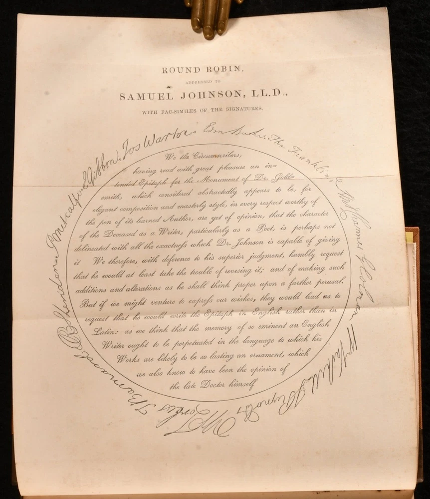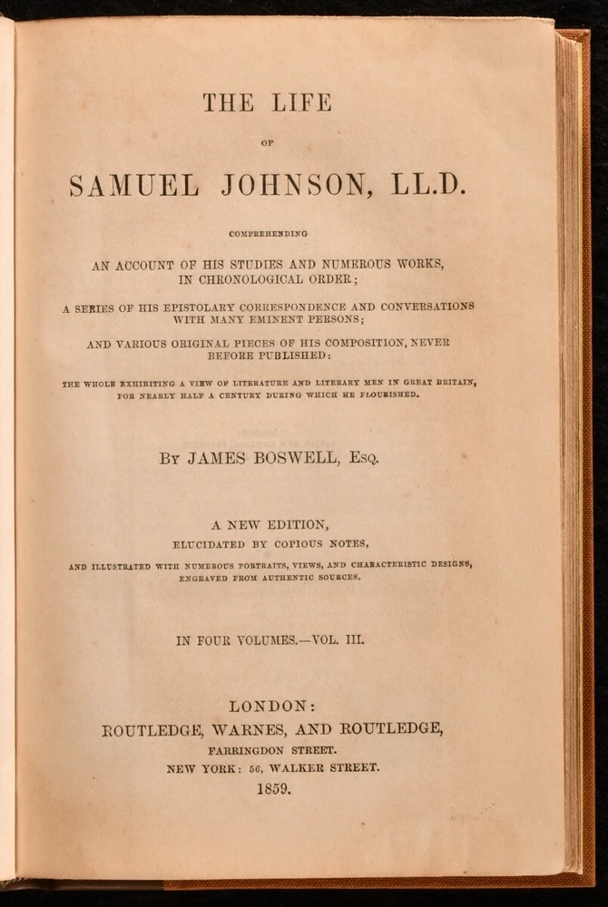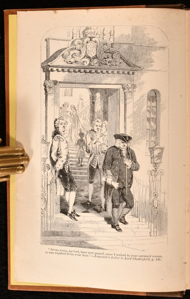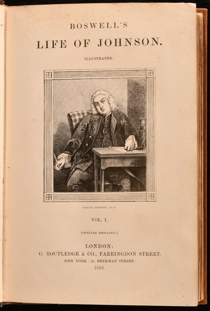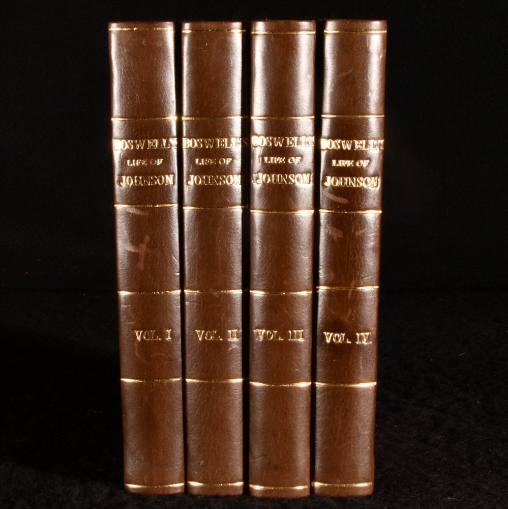 Click here to see our other books! The Life of Samuel Johnson James Boswell 1857-1859 G. Routledge & Co : London 7.5" by 5" xxxii, 291; viii, 298; viii, 298, [1]; viii, [1], 10-300, [4]pp SUMMARY A four volume set of one of the most famous biographical works by James Boswell, of his dear friend Samuel Johnson. Illustrated,Leather Binding Overall Condition: Near Fine This book weighs 2 KG when packed UK Postage: £ 3.99 US Postage: £ 29.99 EU Postage : £ 21.99 European Postage: £ 23.99 Asia Postage: £ 37.99 Worldwide Postage: £ 38.99 DESCRIPTION A complete four volume set of The Life of Samuel Johnson by James Boswell. New Edition copies which are elucidated by copious notes and illustrated with numerous portraits, views and characteristic designs, engraved from authentic sources. The volumes comprise of an account of his studies and numerous works, in chronological order, a series of his epistolary correspondence and conversations with many eminent persons, an dvarious original pieces of his composition. Samuel Johnson was an English writer, poet, playwright, critic and editor. This biography has been suggested at being 'the most famous single work of biographical art in the whole of literature.' James Boswell was a Scottish biographer and is best known for this biographical work of his friend Samuel Johnson. All four volume are extensively illustrated throughout the text and have a frontispiece and decorative title. Volume III has a folding plate and a page of adverts to the rear and Volume IV has four pages of adverts to the rear. CONDITION In quarter calf binding with cloth covered boards. Externally, smart with a few light marks to the boards. Internally, firmly bound with generally bright and clean pages. Overall Condition: Near Fine GLOSSARY OF TERMS Overall Condition (Dustwrapper condition rating is shown after that for the book itself, where a dustwrapper is present) Fine - Very well preserved copy showing very little wear Very Good Indeed - Only one or two minor faults, really a very attractive copy Very Good - Quite a wide term meaning no major faults but probably several smaller ones often expected given the age of the book, but still a respectable copy Good - Meaning not very good. Some more serious faults as will be described in the condition report under 'condition' Good Only - Meaning one or more faults that could really do with repair Fair - As with good only above but with other faults leaving a compromised copy even after repair Poor - Really bad and possibly seriously incomplete. We only sell books in this condition where their rarity or value makes them attractive none the less. Major defects will be described. GUARANTEE We offer a full money back guarantee on our descriptions. Please ask for details and conditions. We prefer PAYPAL. If you pay via PAYPAL we will post the item off the same or the next working day with the postage you have selected. Please note we cannot accept USD cheques