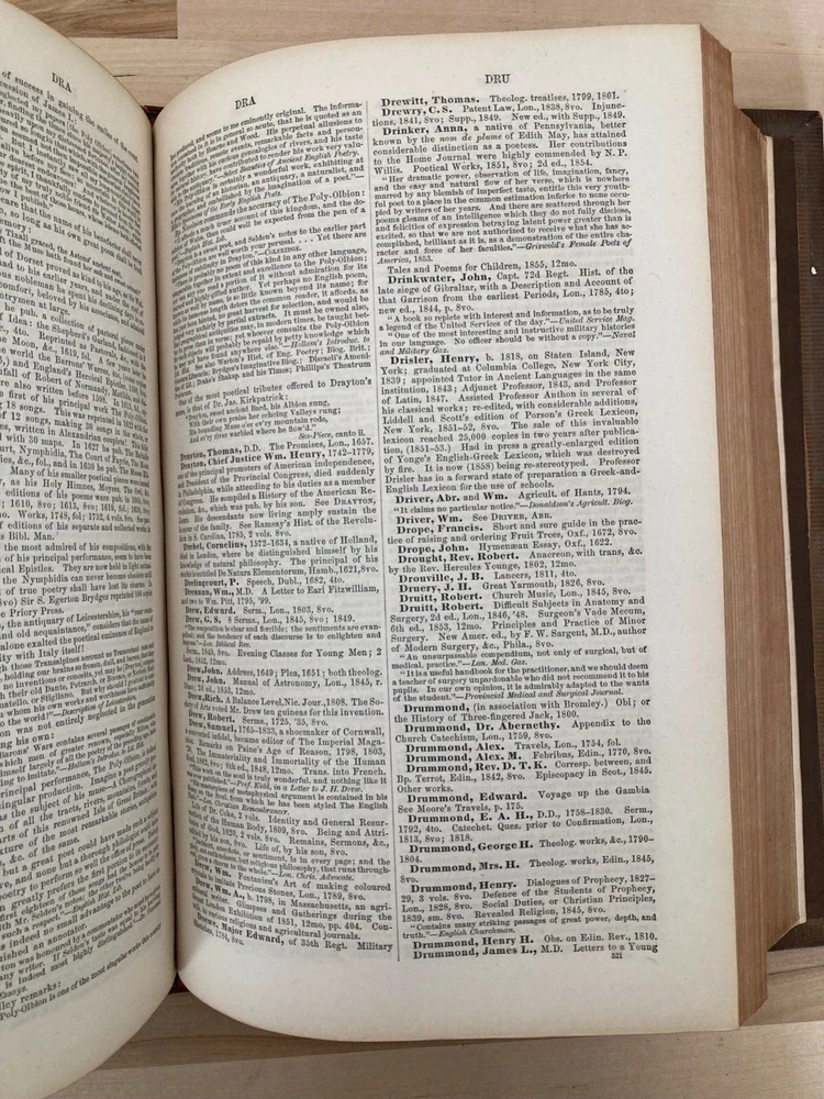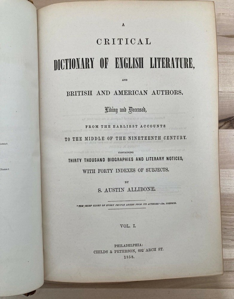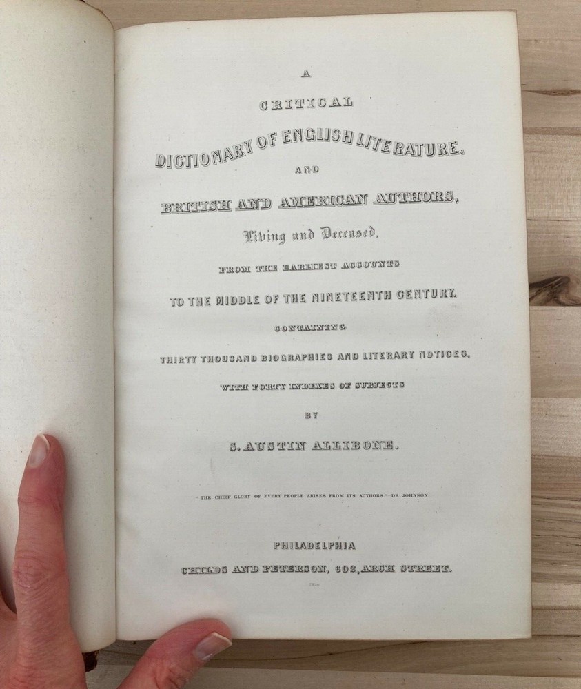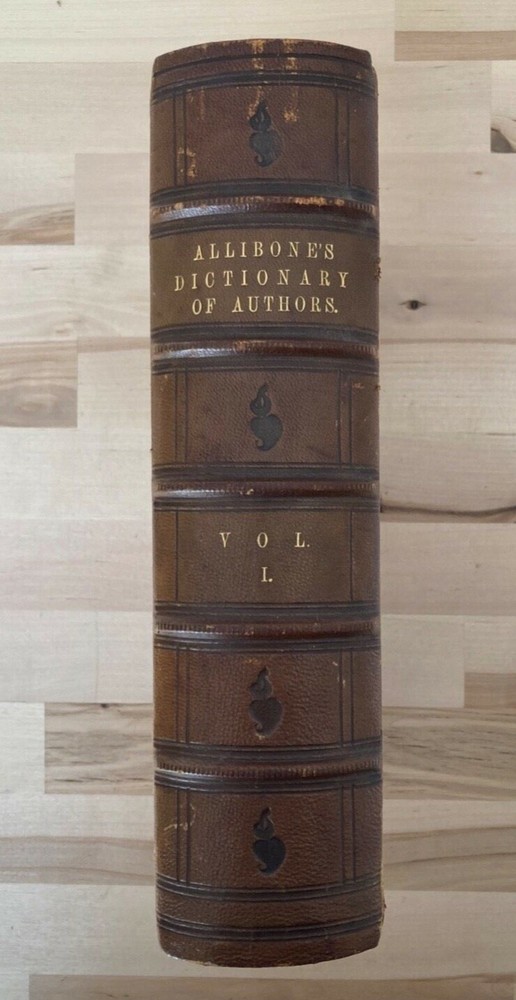 1858 Allibone's Dictionary of English Literature and British and American Authors In very good condition aside from some scuff marks on the leather. Please view all photos carefully and zoom in to see details. Items are to be sold as is and sale is final, no returns, so please feel free to contact me with any questions you might have. I will be happy to respond to any inquiries. I will ship within 2 business days of payment but can't be held responsible for any delays once I have posted the package.
