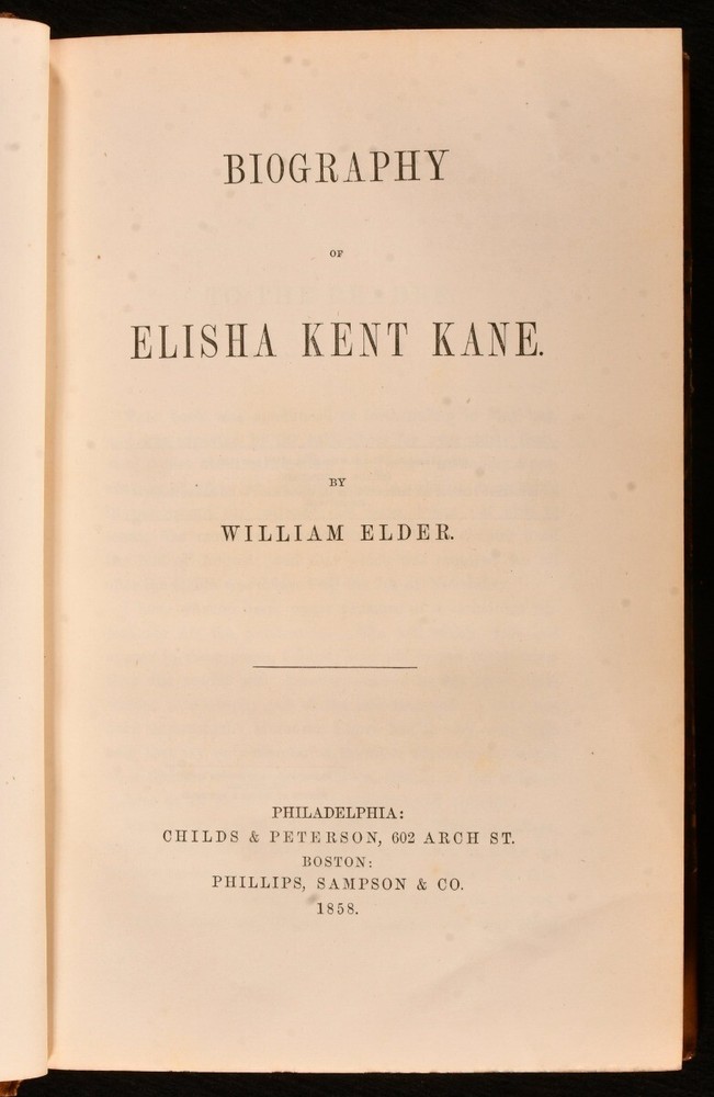 Click here to see our other books! Biography of Elisha Kent Kane William Elder 1858 Childs & Peterson : Philadelphia 9.5" by 6.5" 4-416pp SUMMARY The first edition of this illustrated biography of the life of United States Navy medical officer and Arctic explorer Elisha Kent Kane. First Edition,Illustrated,Leather Binding Overall Condition: Very Good Indeed This book weighs 1 KG when packed UK Postage: £ 3.99 US Postage: £ 22.99 EU Postage : £ 16.99 European Postage: £ 17.99 Asia Postage: £ 22.99 Worldwide Postage: £ 28.99 DESCRIPTION The first edition of this work. Illustrated with a frontispiece, engraved title page, and four further plates. Collated, complete. Elisha Kent Kane served as assistant surgeon during Caleb Cushing's journey to China to negotiate the Treaty of Wangxia, was senior medical officer in the First Grinnell expedition to rescue Sir John Franklin, and led the Second Grinnell expedition. His explorations of the Arctic went further North than any expedition at the time, and led to the eventual path to the North Pole taken by subsequent explorers. With a former owner's inscription to a front blank. CONDITION In a half calf binding, with marbled paper covered boards. Gilt detailing to back strip. A touch of rubbing to board perimeters, otherwise externally excellent. Inscription to a front blank. Internally, firmly bound. Pages clean and bright. Spotting and instances of foxing to plates. Overall Condition: Very Good Indeed GLOSSARY OF TERMS Overall Condition (Dustwrapper condition rating is shown after that for the book itself, where a dustwrapper is present) Fine - Very well preserved copy showing very little wear Very Good Indeed - Only one or two minor faults, really a very attractive copy Very Good - Quite a wide term meaning no major faults but probably several smaller ones often expected given the age of the book, but still a respectable copy Good - Meaning not very good. Some more serious faults as will be described in the condition report under 'condition' Good Only - Meaning one or more faults that could really do with repair Fair - As with good only above but with other faults leaving a compromised copy even after repair Poor - Really bad and possibly seriously incomplete. We only sell books in this condition where their rarity or value makes them attractive none the less. Major defects will be described. GUARANTEE We offer a full money back guarantee on our descriptions. Please ask for details and conditions. We prefer PAYPAL. If you pay via PAYPAL we will post the item off the same or the next working day with the postage you have selected. Please note we cannot accept USD cheques