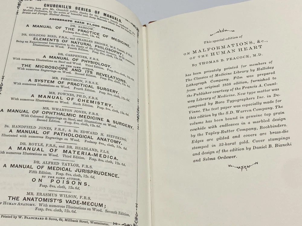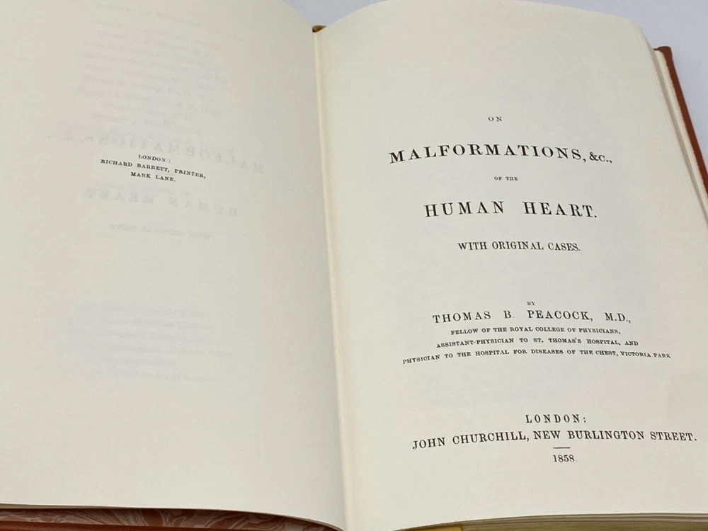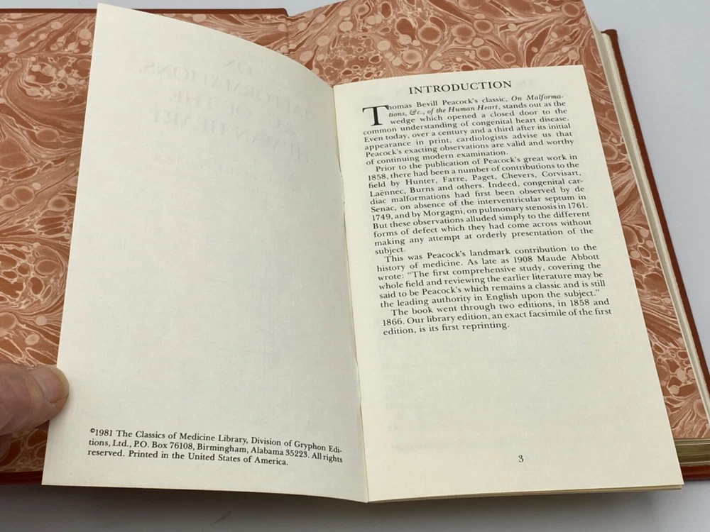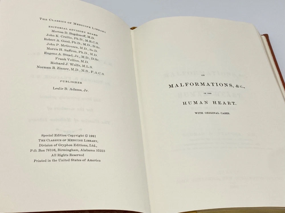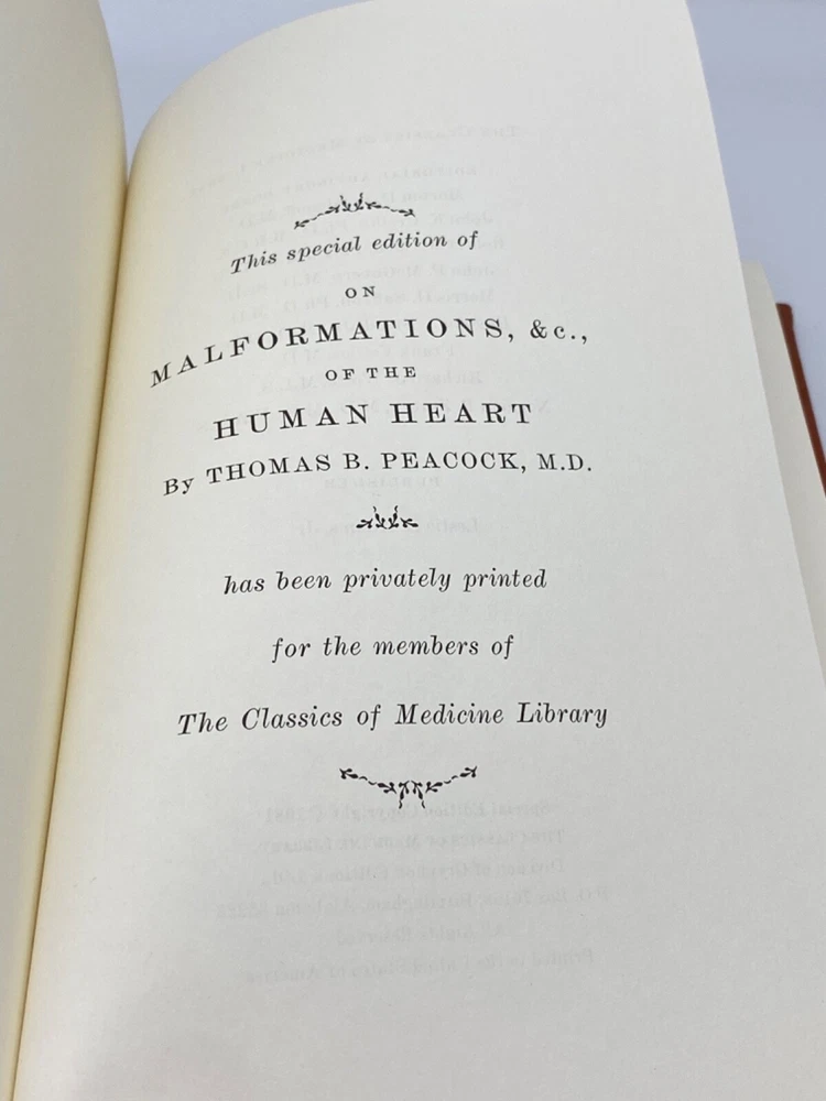MAKES THE PERFECT GIFT FOR ANY FAN OF MEDICINE / THE ANATOMY OF THE HEART / PHYSICIAN / ANY MEDICAL PROFESSIONAL ** PLEASE READ : Mahalo for taking the time to look at our listing. We truly appreciate it. We always do our BEST to give you the most accurate description of these beautiful books. If, however, you have any SPECIFIC questions about the SIZE of the book, NUMBER of pages, TYPE of leather, SMELL or FEEL of the book, PLEASE email us through EBay’s mail system BEFORE you bid, and we will be HAPPY to give you more information. We want you to be completely happy with your purchase and keep you as our customers for years to come!** DESCRIPTION: The Classics of Medicine (GRYPHON EDITIONS) full-leather binding, LONG OUT-OF-PRINT AND HIGHLY COLLECTIBLE REPRINT OF THE 1858 edition of MALFORMATIONS ETC. OF THE HUMAN HEART with ORIGINAL CASES by THOMAS B. PEACOCK, M.D. THIS IS A VINTAGE HEIRLOOM EDITION DONE EXACTLY LIKE EASTON PRESS OR FRANKLIN LIBRARY EDITIONS WITH LAVISH DEEP GILT IMPRESSIONS TO THE BOARDS AND SPINE with AMAZING VINTAGE ILLUSTRATIONS! IT IS ONE OF THE MOST HIGHLY-PRIZED EDITIONS OF THIS GREAT CLASSIC OF MEDICINE . SCARCE NOTES FROM THE EDITORS ARE INCLUDED . 🍍 NOT INCLUDED… 😃 Description ABOUT THE BOOK: Thomas Bevill Peacock’s classic On Malformations, &c., of the Human Heart , stands out as the wedge which opened a closed door to the common understanding of congenital heart disease. Even today, over a century and a half after its initial appearance in print, cardiologists advise us that Peacock’s enacting observations are valid and worth of continuing modern examination. This is a reproduction of a the book published in 1858 which may have occasional imperfections such as missing or blurred pages, poor pictures, errant marks, etc. that were either part of the original artifact, or were introduced by the scanning process. This work is culturally important, and despite the imperfections, have elected to bring it back into print as part of the continuing commitment to the preservation of printed works worldwide. IT IS A FASCINATING BOOK! CONDITION: Books is in LIKE NEW condition for its age with no discernible flaws (SEE PICS FOR BETTER DETAILS). NO ATTACHED BOOKPLATES, WRITING FROM PREVIOUS OWNER, ETC. It is an BEAUTIFUL edition. SHIPPING: FREE to US ADDRESSES ONLY. INTERNATIONAL $ based on location. WE SHIP PRIORITY MAIL & PACK VERY WELL. Please check out our other listings of Easton Press, Franklin Library, Limited Editions Club, First Edition Library, International Collectors Library, Heritage Press, and Folio Society editions. WE DO COMBINE SHIPPING IF YOU PURCHASE MORE THAN ONE COPY. Mahalo for looking at our listings! By bidding/purchasing this item, you are helping a very grateful family who sends you our WARMEST ALOHA & MAHALO!