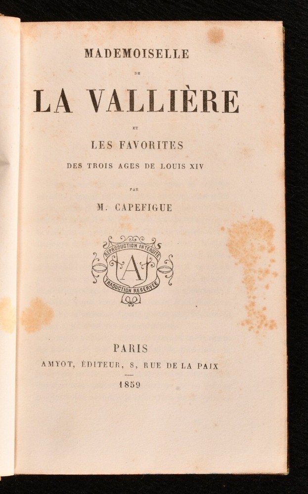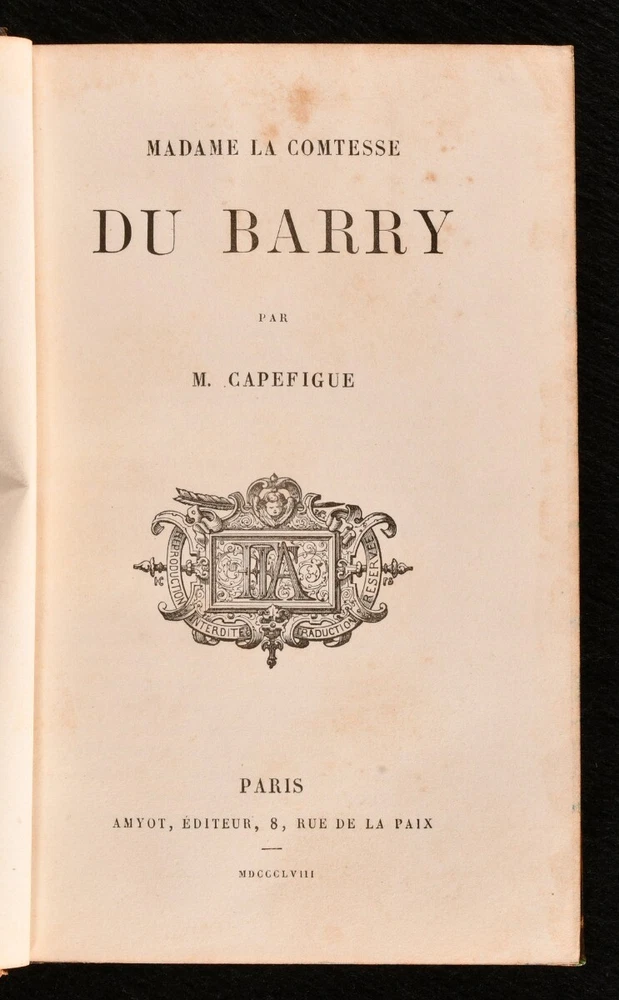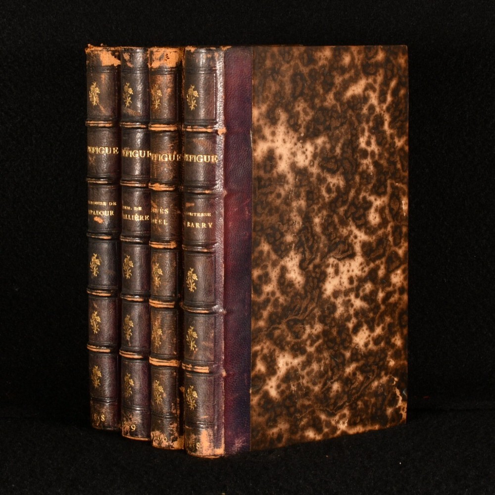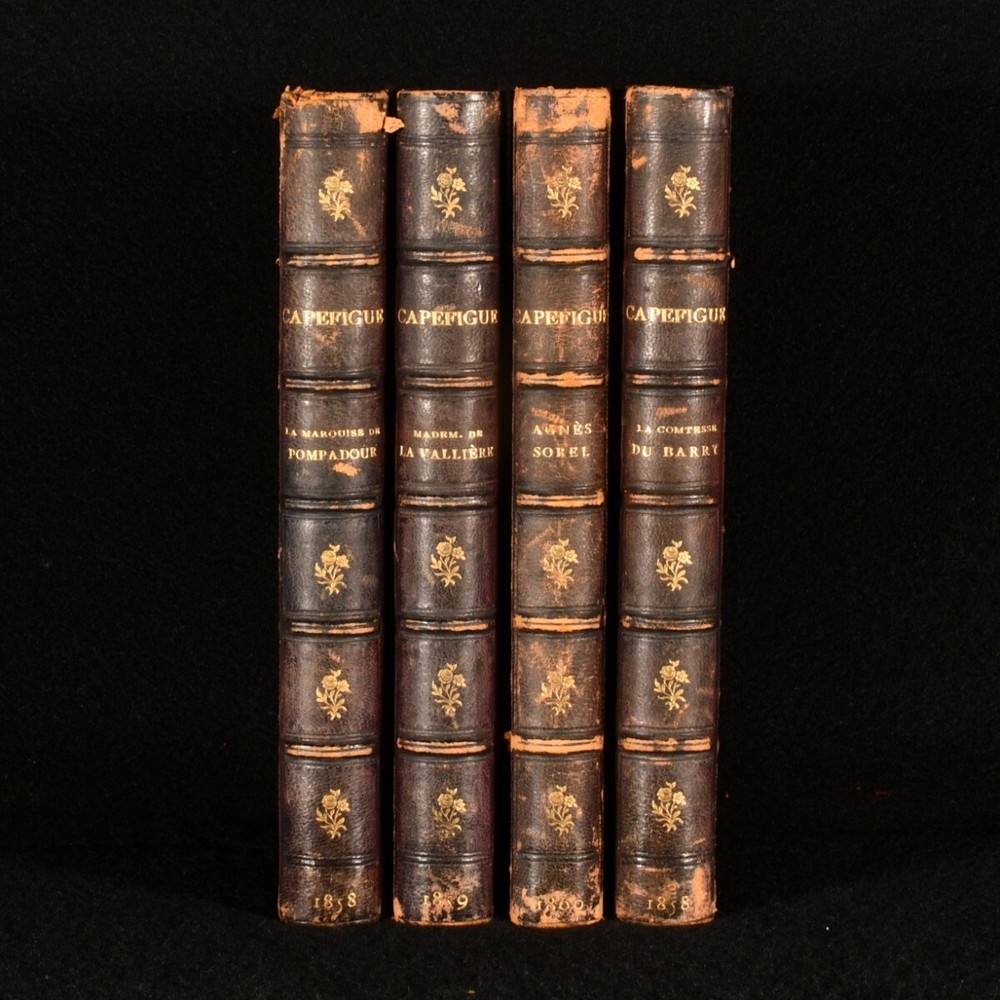 Click here to see our other books! Selected Biographical Works of Jean-Baptiste Capefigue Jean-Baptise Capefigue 1858-60 Amyot : Paris 7" by 4.5" iii, 296; v, 276; xi, 276; xi, 227pp SUMMARY A uniformly bound set of selected biographical works by noted French historian Jean-Baptiste Capefigure. In French. Leather Binding,Rebound,Uncommon Overall Condition: Good This book weighs 2 KG when packed UK Postage: £ 3.99 US Postage: £ 29.99 EU Postage : £ 21.99 European Postage: £ 23.99 Asia Postage: £ 37.99 Worldwide Postage: £ 38.99 DESCRIPTION Included in this set are the following works: La Marquise de Pompadour , published in 1858. The biography of noted member of the mid eighteenth-century French court, Jeanne Antoinette Poisson, Marquise de Pompadour. La Comtesse du Barry , published in 1858. The biography of the chief royal mistress of Louis XV of France, Jeanne Becu, Comtesse du Barry. She was one of the victims of the Reign of Terror during the French Revolution. Mademoiselle de la Valliere, et Les Favorites Des Trois Ages de Louise XIV , published in 1859. The biography of Louise de La Valliere, a mistress of King Louis XIV of France from 1661 to 1667. Agnes Sorel et La Chevalerie , published in 1860. The biography of King Charles II's favourite mistress, Agnes Sorel, known by the sobriquet Dame de Beaute. Jean-Baptiste Capefigue (1801-1872) was a French historian and biographer. Born in Marseille, he moved to Paris at age twenty to study journalism. He often wrote biographies of famous women, and his well known biographies, in addition to the ones in this set, include that of Catherine de'Medici, Anne of Austria, Maria Theresa of Austria, Catherine II of Russia, Elizabeth I of England, and more. CONDITION Uniformly bound in quarter morocco with paper covered boards. Externally, some rubbing to the spines and joints. This has resulted in a small amount of loss to the heads and tails of the spines, most notable to 'Agnes Sorel' and 'La Marquise de Pompadour'. Numbered bookplates to the half title pages of each volume. Internally, hinges slightly strained but firm. All volumes firmly bound. Scattered spots to the first few pages of each volume, and the odd spot and handling mark throughout, otherwise pages are generally bright and clean. Overall Condition: Good GLOSSARY OF TERMS Overall Condition (Dustwrapper condition rating is shown after that for the book itself, where a dustwrapper is present) Fine - Very well preserved copy showing very little wear Very Good Indeed - Only one or two minor faults, really a very attractive copy Very Good - Quite a wide term meaning no major faults but probably several smaller ones often expected given the age of the book, but still a respectable copy Good - Meaning not very good. Some more serious faults as will be described in the condition report under 'condition' Good Only - Meaning one or more faults that could really do with repair Fair - As with good only above but with other faults leaving a compromised copy even after repair Poor - Really bad and possibly seriously incomplete. We only sell books in this condition where their rarity or value makes them attractive none the less. Major defects will be described. GUARANTEE We offer a full money back guarantee on our descriptions. Please ask for details and conditions. We prefer PAYPAL. If you pay via PAYPAL we will post the item off the same or the next working day with the postage you have selected. Please note we cannot accept USD cheques