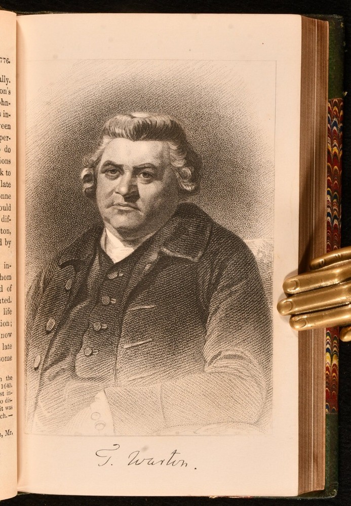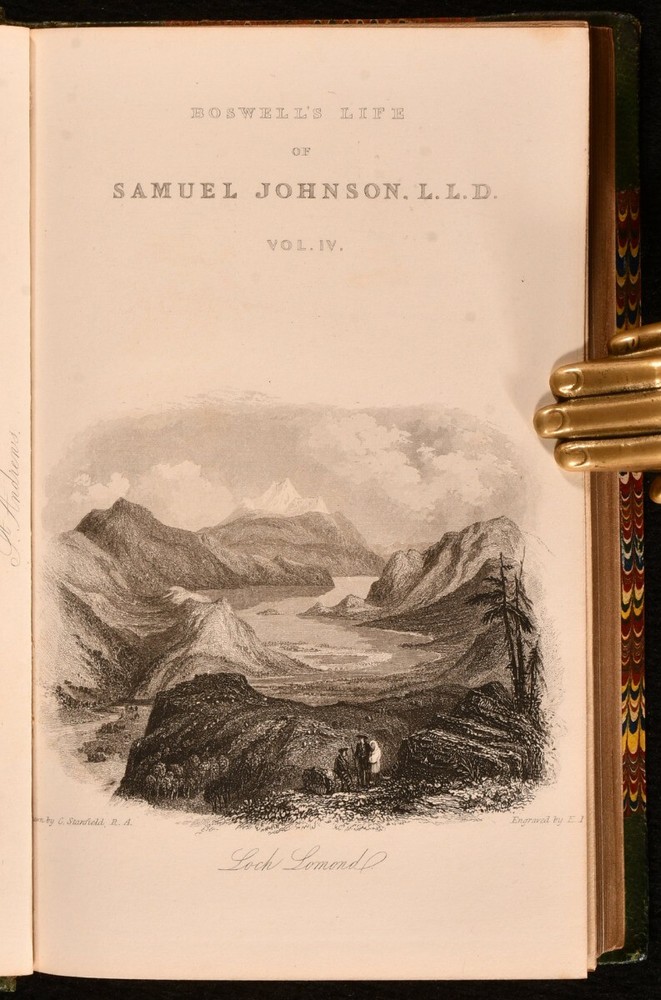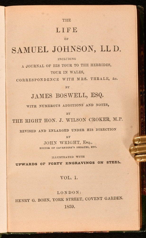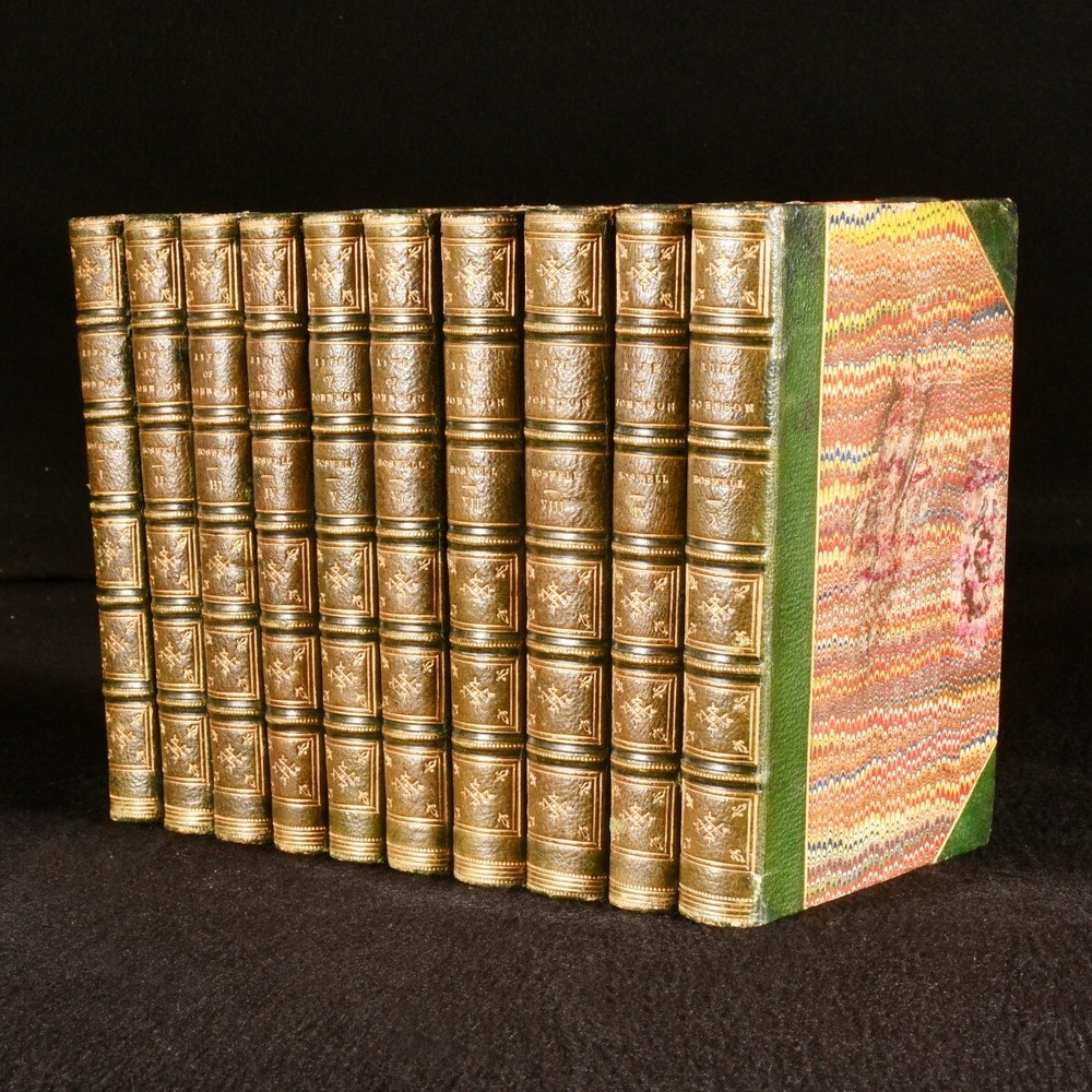 Click here to see our other books! The Life of Samuel Johnson James Boswell; J. Wilson Croker [ed.]; John Wright [ed.] 1859 Henry G. Bohn : London 7" by 4.5" 325; 344; 323; 343; 341; 342; 381; 431; 335; 376pp SUMMARY A lovely ten volume edition of Boswell's life of Johnson, in half morocco bindings, and illustrated throughout. Folding Plates,Illustrated,Leather Binding Overall Condition: Very Good Indeed This book weighs 5 KG when packed UK Postage: £ 4.49 US Postage: £ 42.99 EU Postage : £ 27.99 European Postage: £ 45.99 Asia Postage: £ 74.99 Worldwide Postage: £ 129.99 DESCRIPTION An attractively bound ten volume edition of this work by James Boswell, featuring additions from J. Wilson Croker and John Wright. Illustrated with an engraved title page and frontispiece to all volumes aside from volume IX, which has a frontispiece only, and with five plates to volume I, two of which are folding; four to volume II, two of which are folding; two to volume III, one of which is folding; two to volume IV; two to volume V; two to volume VI, one of which is folding; four to volume VII, two of which are folding; three to volume VIII, one of which is folding; two plates to volume IX, one of which is folding, and two folding plates to volume X. Collated, lacking only an engraved title page, to volume IX. Whilst Boswell's personal acquaintance with his subject began in 1763, when Johnson was fifty four years old, Boswell covered the entirety of Johnson's life by means of additional research. The most admired and best remembered portions of the book are Boswell's first-hand accounts of Johnson from the last twenty-one years of the subject's life. A landmark work in the development of the modern biography in English, many have claimed this to be the greatest biography ever written. Nevertheless, this biography takes many critical liberties with Johnson's life, with Boswell making various changes to Johnson's quotations and even censoring his comments. With the inscription of G. Bell to the front free endpaper of each volume. CONDITION In half calf bindings, with marbled paper covered boards. Gilt detailing to back strip. Externally, very smart, with rubbing to centre of front board of volume X. Inscription to head of front free endpaper. Internally, firmly bound. Pages bright and generally clean, with only the odd spot. Overall Condition: Very Good Indeed GLOSSARY OF TERMS Overall Condition (Dustwrapper condition rating is shown after that for the book itself, where a dustwrapper is present) Fine - Very well preserved copy showing very little wear Very Good Indeed - Only one or two minor faults, really a very attractive copy Very Good - Quite a wide term meaning no major faults but probably several smaller ones often expected given the age of the book, but still a respectable copy Good - Meaning not very good. Some more serious faults as will be described in the condition report under 'condition' Good Only - Meaning one or more faults that could really do with repair Fair - As with good only above but with other faults leaving a compromised copy even after repair Poor - Really bad and possibly seriously incomplete. We only sell books in this condition where their rarity or value makes them attractive none the less. Major defects will be described. GUARANTEE We offer a full money back guarantee on our descriptions. Please ask for details and conditions. We prefer PAYPAL. If you pay via PAYPAL we will post the item off the same or the next working day with the postage you have selected. Please note we cannot accept USD cheques