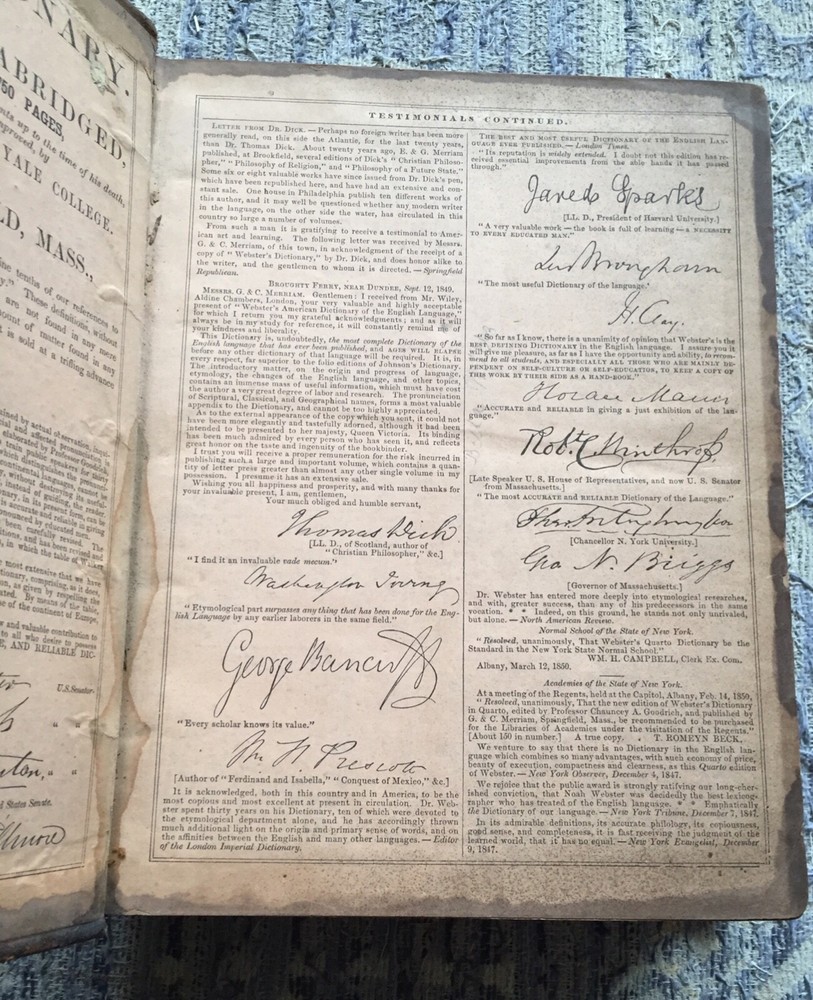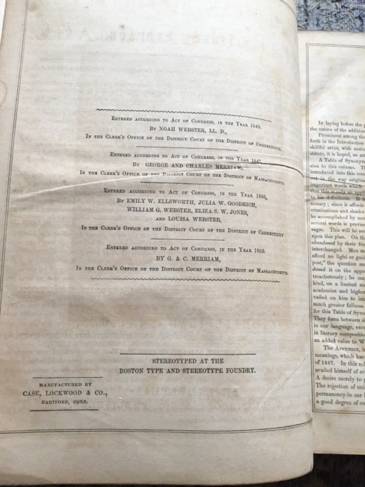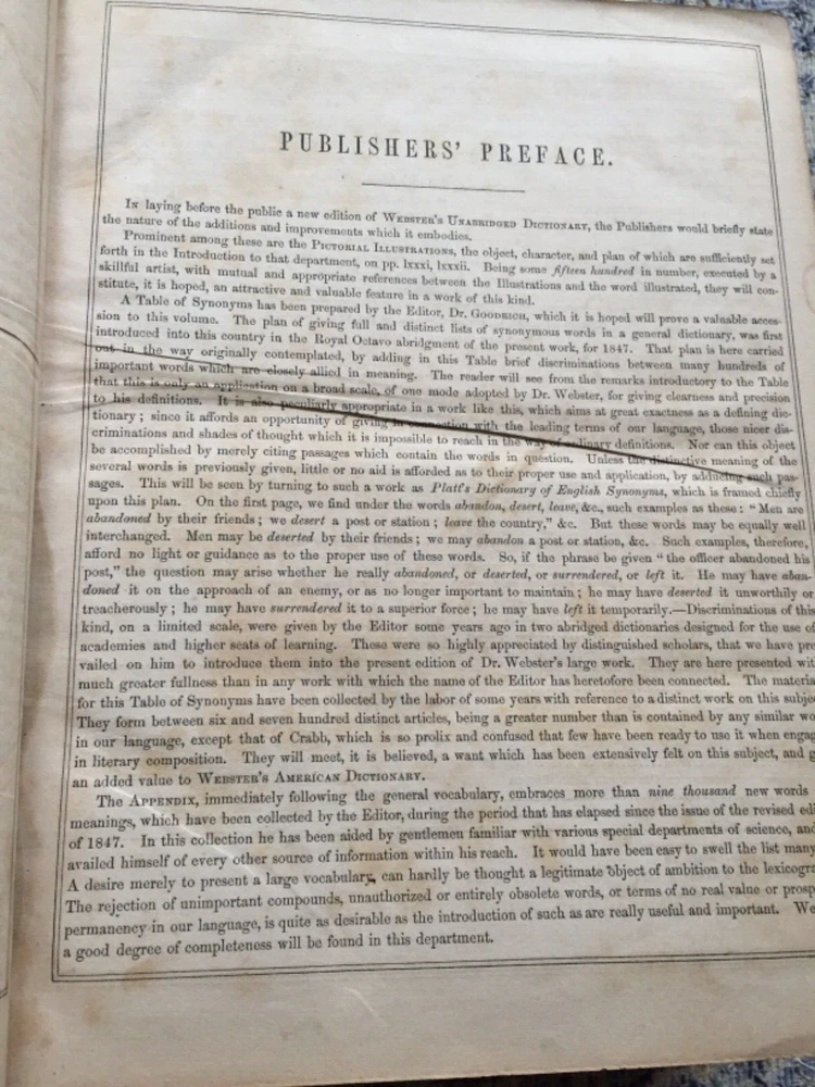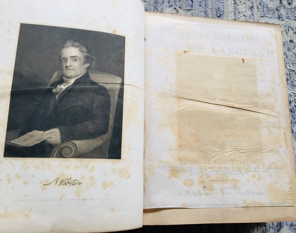 American Dictionary of the English Language. Noah Webster 1860 Lippincott Philadelphia 11" x 4.5" x 9" see pictures. Pages are all attached....