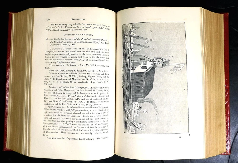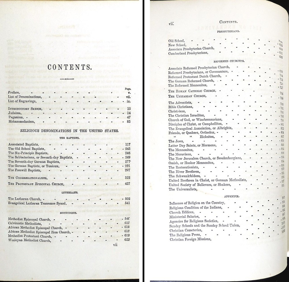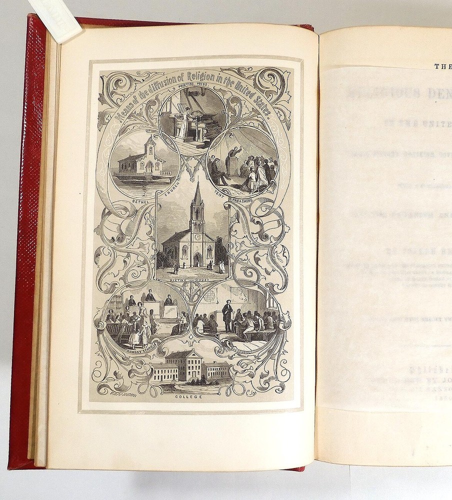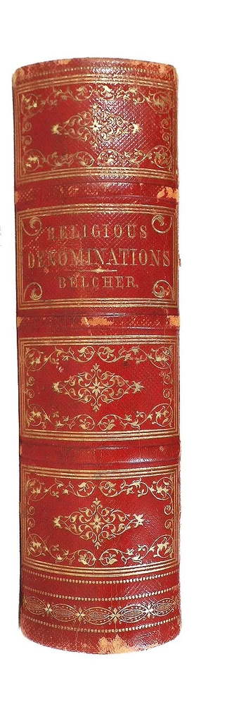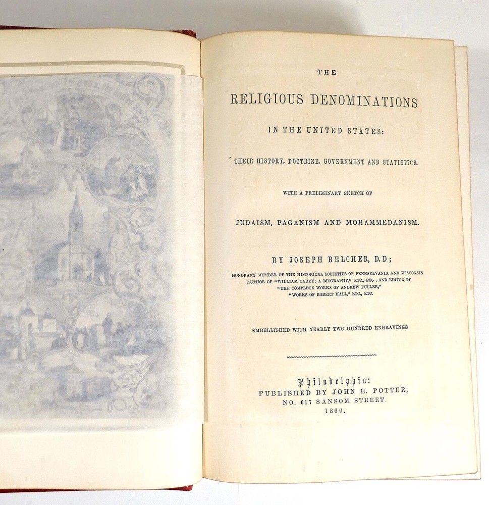 Religious Denominations In The United States by Joseph Belcher, 1860 printing. The leather book is in very good condition. It has a little scuffing of the leather, browning on the end papers. There is some faint writing on the front end paper but it's hard to read, looks like a name AF B?… and Westmoreland, O. The rest of the 1024 page book is in fine condition with gilt edges on 3 sides and nearly 200 engravings. The pages are tightly bound, clean and bright with no odors.