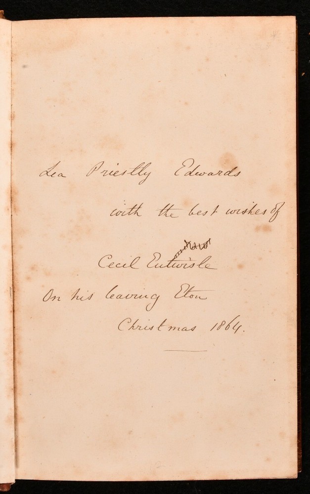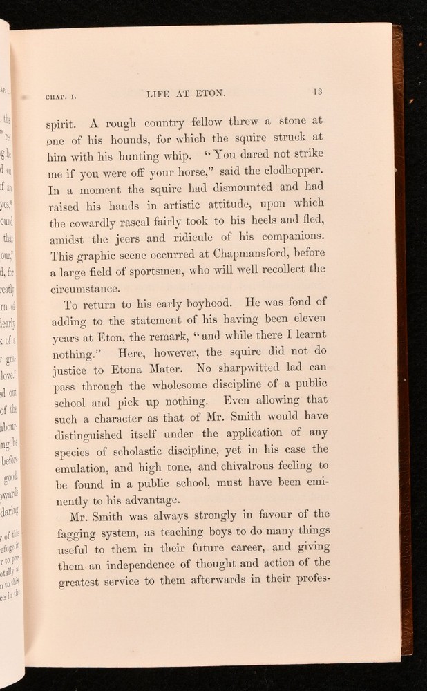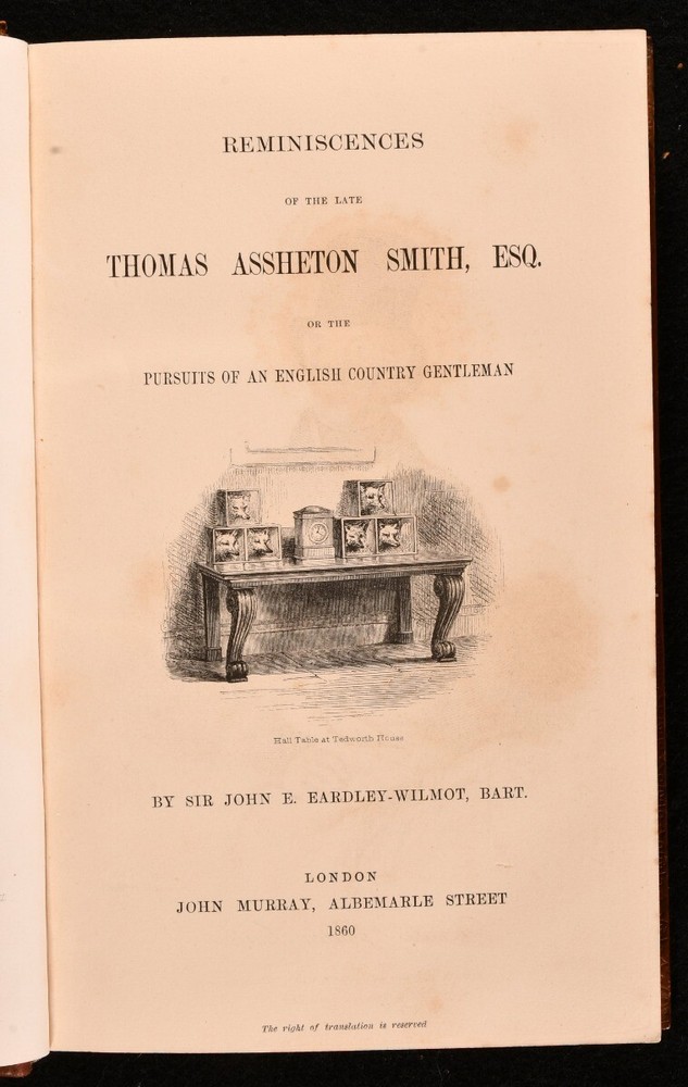 Click here to see our other books! Reminiscences of the Late Thomas Assheton Smith, or the Pursuits of an English Country Gentleman Sir John E. Eardley-Wilmot 1860 John Murray : London 9" by 5.5" [7], vi-xiii, [3], 307pp SUMMARY - Early Edition,Illustrated,Leather Binding Overall Condition: Very Good Indeed This book weighs 1 KG when packed UK Postage: £ 3.99 US Postage: £ 22.99 EU Postage : £ 16.99 European Postage: £ 17.99 Asia Postage: £ 22.99 Worldwide Postage: £ 28.99 DESCRIPTION Second edition, bound in full-calf. Illustrations include a frontispiece, a vignette illustration to the title page and the preface, as well as seven black-and-white plates. Prior owner's ink inscription to front endpaper, which says 'Lea Priestly Edwards with the best wishes of Cecil Eutistle On his leaving Eton Christmas 1864'. 'Reminiscences of the Late Thomas Assheton Smith, Esq.' is a memoir written by Sir John E. Eardley-Wilmot, Bart. It chronicles the life of a famous fox-hunter and sportsman, especially in the realm of cricket. He was also a Tory politician who sat in the House of Commons from 1821 to 1837. Sir John E. Eardley-Wilmot (1810-1892) was a politician and judge, who was also a member of parliament for South Warwickshire. Collated, complete. CONDITION Bound in full-calf with gilt illustration around margins of boards and on spine. Externally, smart. A few marks to boards as well as some edge wear to extremities. Rubbing to head and tail of spine, as well as bands of joints. Fading to rear board, along spine edge. Internally, firmly bound. Pages are very bright throughout, with some spotting to the first and last few pages of text. Plates are very bright and clean. Prior owner's ink inscription to recto of front end paper. Overall Condition: Very Good Indeed GLOSSARY OF TERMS Overall Condition (Dustwrapper condition rating is shown after that for the book itself, where a dustwrapper is present) Fine - Very well preserved copy showing very little wear Very Good Indeed - Only one or two minor faults, really a very attractive copy Very Good - Quite a wide term meaning no major faults but probably several smaller ones often expected given the age of the book, but still a respectable copy Good - Meaning not very good. Some more serious faults as will be described in the condition report under 'condition' Good Only - Meaning one or more faults that could really do with repair Fair - As with good only above but with other faults leaving a compromised copy even after repair Poor - Really bad and possibly seriously incomplete. We only sell books in this condition where their rarity or value makes them attractive none the less. Major defects will be described. GUARANTEE We offer a full money back guarantee on our descriptions. Please ask for details and conditions. We prefer PAYPAL. If you pay via PAYPAL we will post the item off the same or the next working day with the postage you have selected. Please note we cannot accept USD cheques