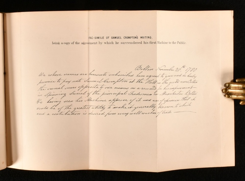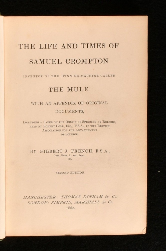 Click here to see our other books! The Life and Times of Samuel Crompton Inventor of the Spinning Machine Called the Mule Gilbert J. French 1860 Thomas Dinham : Manchester 7" by 4.5" [5], viii-xiv, 299pp SUMMARY A lovely second edition of Gilbert French's biography on the life and work of the inventor Samuel Crompton, illustrated with folding plates. Folding Plates,Illustrated,Leather Binding Overall Condition: Very Good This book weighs 0.75 KG when packed UK Postage: £ 3.99 US Postage: £ 19.99 EU Postage : £ 15.99 European Postage: £ 16.99 Asia Postage: £ 21.99 Worldwide Postage: £ 25.99 DESCRIPTION The second edition of this work. A biography on the life of Samuel Crompton. Crompton was an English inventor, best known for inventing the spinning mule, which revolutionised the industry. Illustrated with a frontispiece, three folding plates, and three plates. Collated, complete. Written by Gilbert J. French. CONDITION In a half calf binding with marbled paper to the boards. Externally, generally smart, with light rubbing to the boards and spine. A little bumping to the head and tail of the spine and to the extremities. Crack to the head of the front joint. Hinges are starting but firm. Some spots to the endpapers. Internally, firmly bound. Pages are bright and clean with just the odd light spot. Overall Condition: Very Good GLOSSARY OF TERMS Overall Condition (Dustwrapper condition rating is shown after that for the book itself, where a dustwrapper is present) Fine - Very well preserved copy showing very little wear Very Good Indeed - Only one or two minor faults, really a very attractive copy Very Good - Quite a wide term meaning no major faults but probably several smaller ones often expected given the age of the book, but still a respectable copy Good - Meaning not very good. Some more serious faults as will be described in the condition report under 'condition' Good Only - Meaning one or more faults that could really do with repair Fair - As with good only above but with other faults leaving a compromised copy even after repair Poor - Really bad and possibly seriously incomplete. We only sell books in this condition where their rarity or value makes them attractive none the less. Major defects will be described. GUARANTEE We offer a full money back guarantee on our descriptions. Please ask for details and conditions. We prefer PAYPAL. If you pay via PAYPAL we will post the item off the same or the next working day with the postage you have selected. Please note we cannot accept USD cheques
