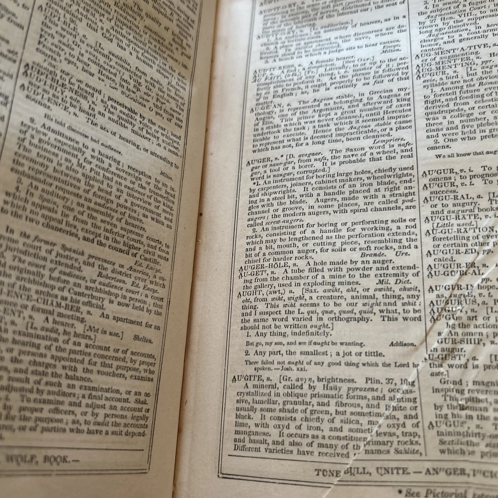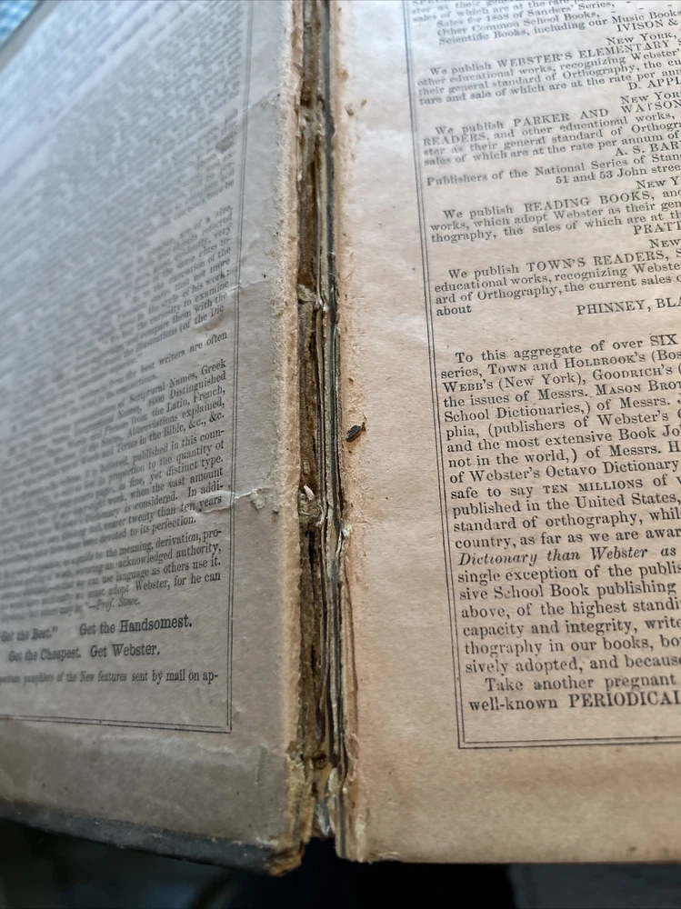 This 1860 edition of Webster's Unabridged Dictionary is a valuable addition to any collection, featuring leather binding and original pages. The book was published by George and Charles Merriam in Springfield, Massachusetts and contains a wealth of reference information on a variety of topics. The dictionary is in English language and is illustrated with special attributes that make it stand out from other editions. The book is region-specific to North America and was printed in 1860. The topic is reference and it is a great addition to any antiquarian and collectible book collection. While the book is not signed, it remains a timeless piece of literature that has been preserved for over a century. This dictionary is very old, it’s leather spine cover has known a better life, the leather is crumbling due to time, please see the pictures for a better understanding of the shape of this beautiful piece