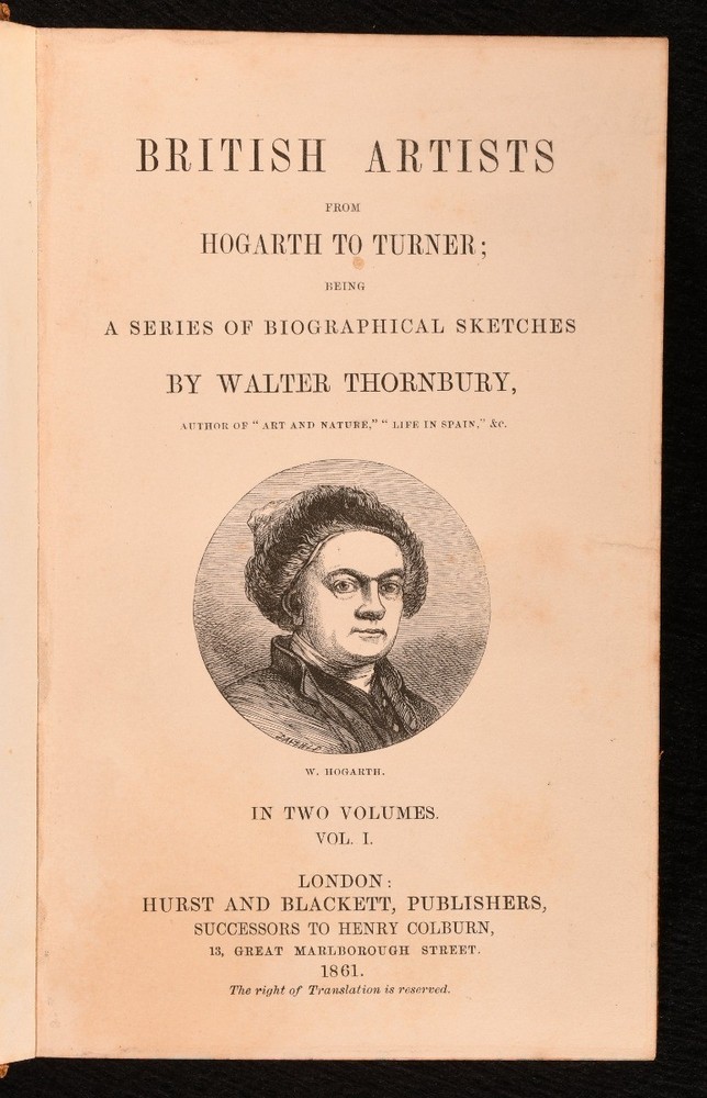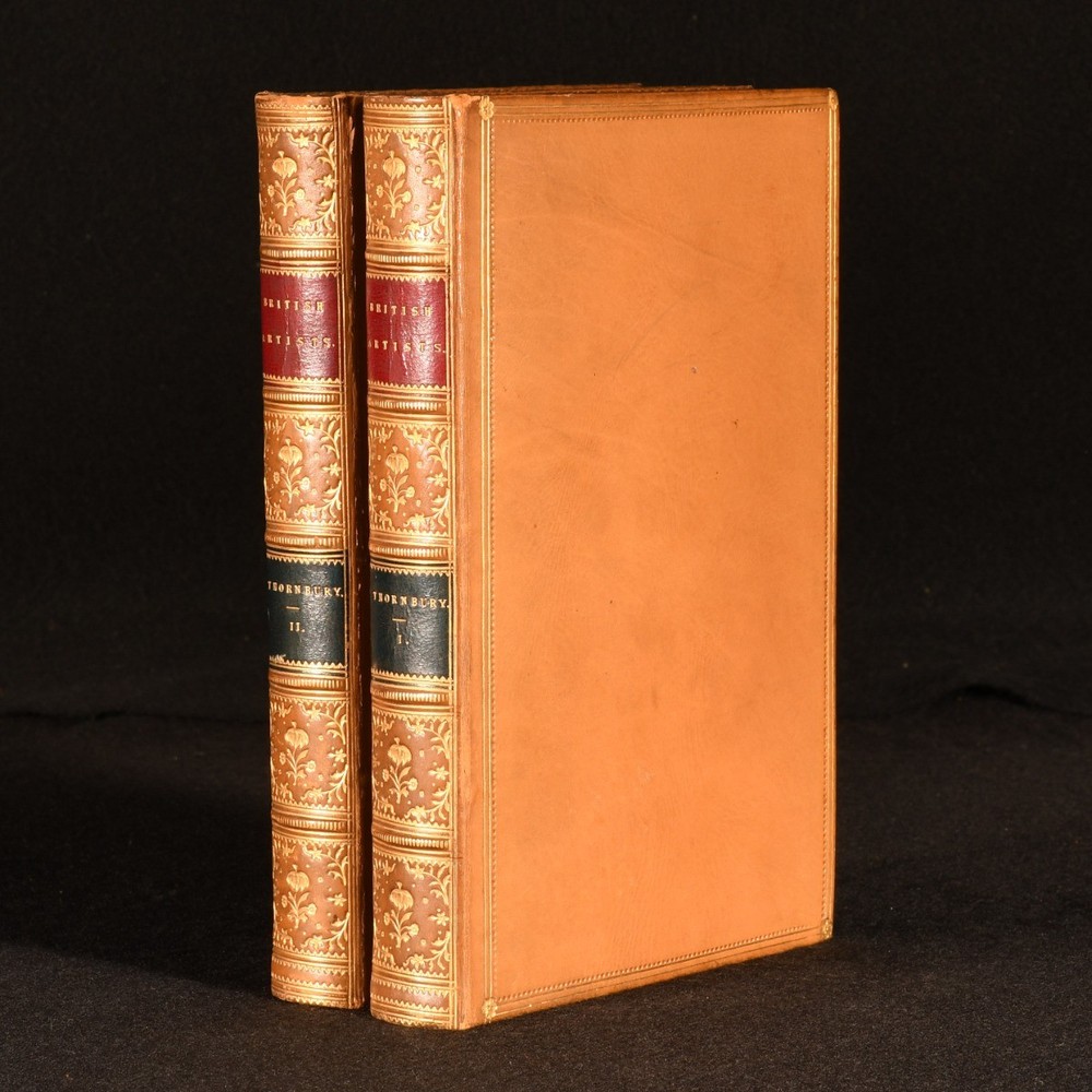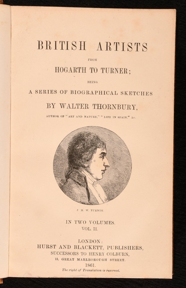 Click here to see our other books! British Artists from Hogarth to Turner: Being a Series of Biographical Sketches Walter Thornbury 1861 Hurts and Blackett : London 7.5" by 4.5" viii, 343; iv, 318pp. SUMMARY The two volume first edition of this biographical work on notable British artists such as Turner and Hogarth, written by Walter Thornbury and bound in full calf with decorative gilt spines. First Edition,Leather Binding,Original Binding Overall Condition: Very Good Indeed This book weighs 1 KG when packed UK Postage: £ 3.99 US Postage: £ 22.99 EU Postage : £ 16.99 European Postage: £ 17.99 Asia Postage: £ 22.99 Worldwide Postage: £ 28.99 DESCRIPTION The first edition. A two volume, complete set. Bound in full calf with decorative gilt details to the spines. This work was written by Walter Thornbury and provides a series of biographical works on notable British artists. The work discusses the art of J. M. W. Turner, Stothard, Cruikshank, gothic artists, Greek art and more. CONDITION In full calf. Externally, very smart, slight marks to the boards, very minimal rubbing to the joints and extremities, and very slightly pulled at the head to 'Vol II'. Internally firmly bound, with an owner's stamp to the front blanks, very minimal age toning, and generally clean pages with only light spotting to the front and rears. Overall Condition: Very Good Indeed GLOSSARY OF TERMS Overall Condition (Dustwrapper condition rating is shown after that for the book itself, where a dustwrapper is present) Fine - Very well preserved copy showing very little wear Very Good Indeed - Only one or two minor faults, really a very attractive copy Very Good - Quite a wide term meaning no major faults but probably several smaller ones often expected given the age of the book, but still a respectable copy Good - Meaning not very good. Some more serious faults as will be described in the condition report under 'condition' Good Only - Meaning one or more faults that could really do with repair Fair - As with good only above but with other faults leaving a compromised copy even after repair Poor - Really bad and possibly seriously incomplete. We only sell books in this condition where their rarity or value makes them attractive none the less. Major defects will be described. GUARANTEE We offer a full money back guarantee on our descriptions. Please ask for details and conditions. We prefer PAYPAL. If you pay via PAYPAL we will post the item off the same or the next working day with the postage you have selected. Please note we cannot accept USD cheques