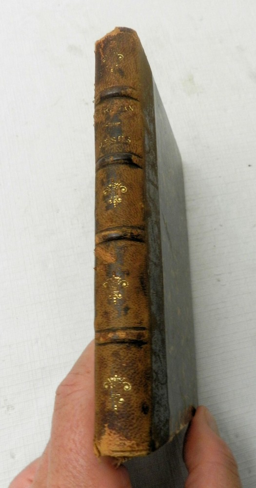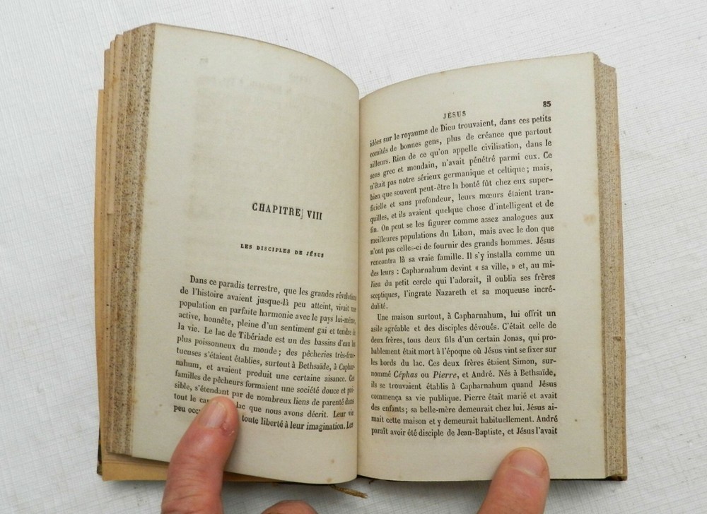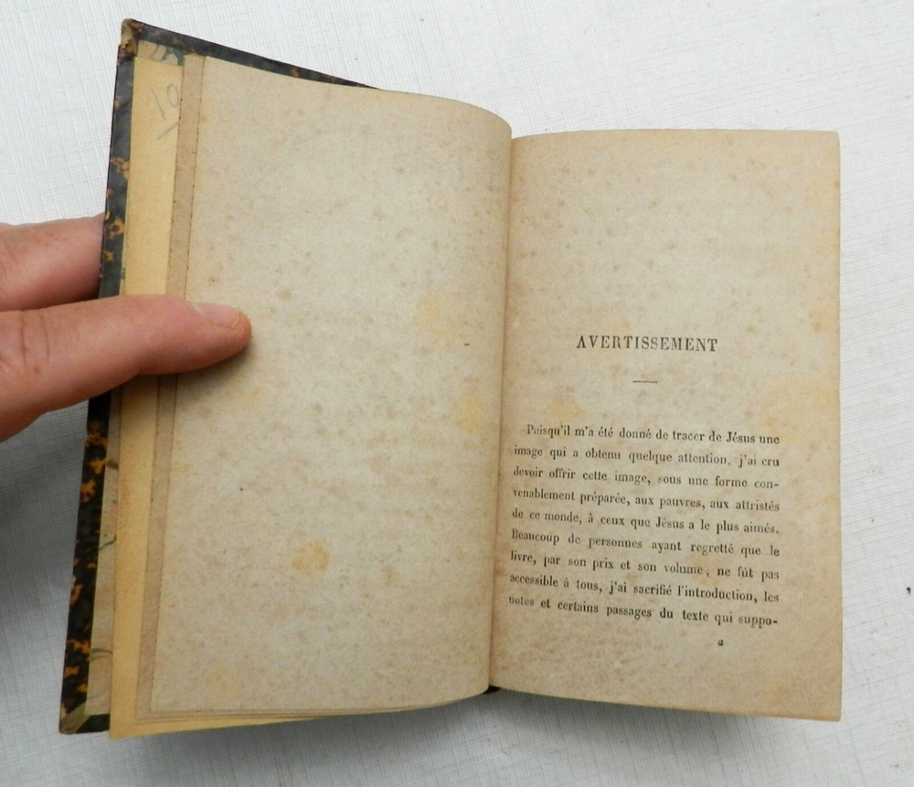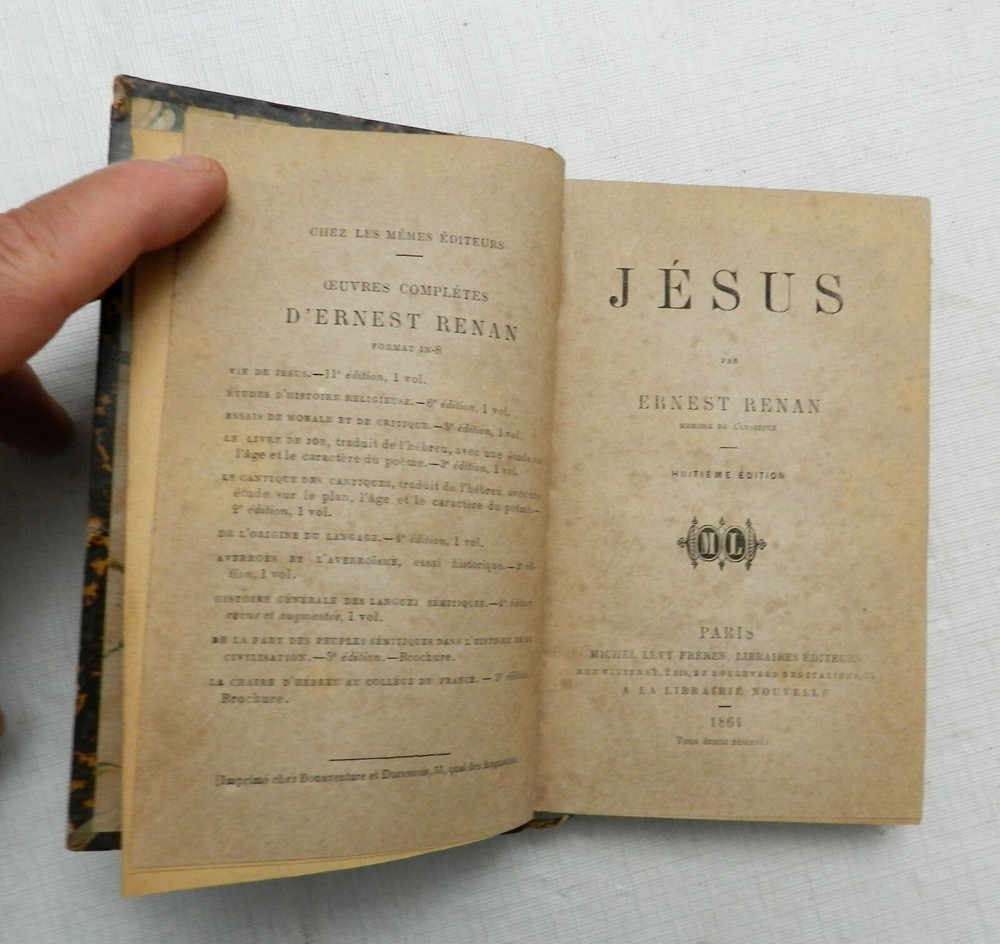 FULLY IN FRENCH. I do not believe this is a version of the more common, Vie de Jesus, also by Ernest Renan. It is the Eighth Edition of "Jesus", authored by Ernest Renan and published by Michel Levy Freres of Paris. HALF LEATHER with four raised spine bands, rubbed gilt letters. Marble boards with moderate corner and top/bottom spine wear, decorative marble (not same pattern) endpapers, light browned initial pages before the book, lighter pages thereafter, attached ribbon, light foxing throughout with heavier foxing near the end, but only marks on the pages not affecting text and readability at all. 262 solidly bound pages, no interior marks of any kind. On the author from Wikipedia: "Joseph Ernest Renan (French: [ʁənɑ̃]; 27 February 1823 – 2 October 1892) was a French Orientalist and Semitic scholar, expert of Semitic languages and civilizations, historian of religion, philologist, philosopher, biblical scholar and critic. He is best known for his influential and pioneering historical works on the origins of early Christianity, and his political theories, especially concerning nationalism and national identity. Renan is credited as being among the first scholars to advance the now-discredited Khazar theory, which held that Ashkenazi Jews were descendants of the Khazars, Turkic peoples who had adopted Jewish religion and migrated to Western Europe following the collapse of their khanate." B16