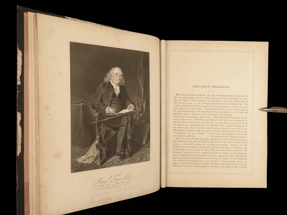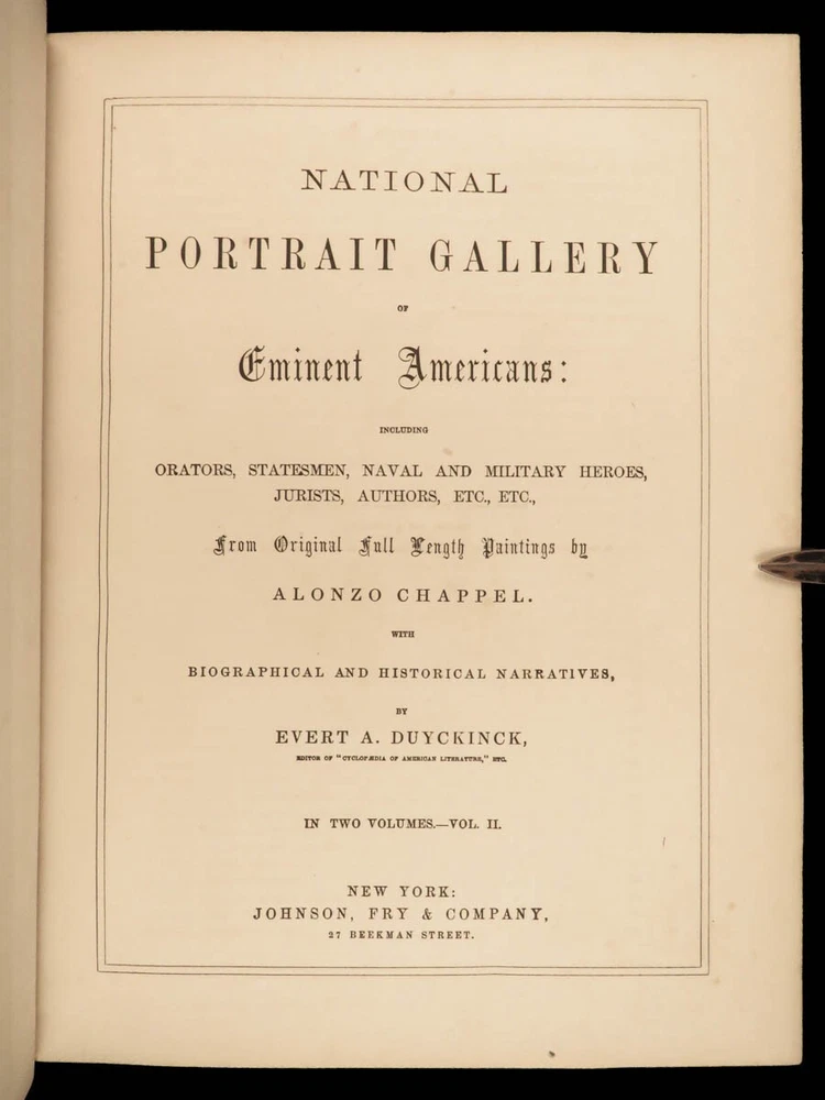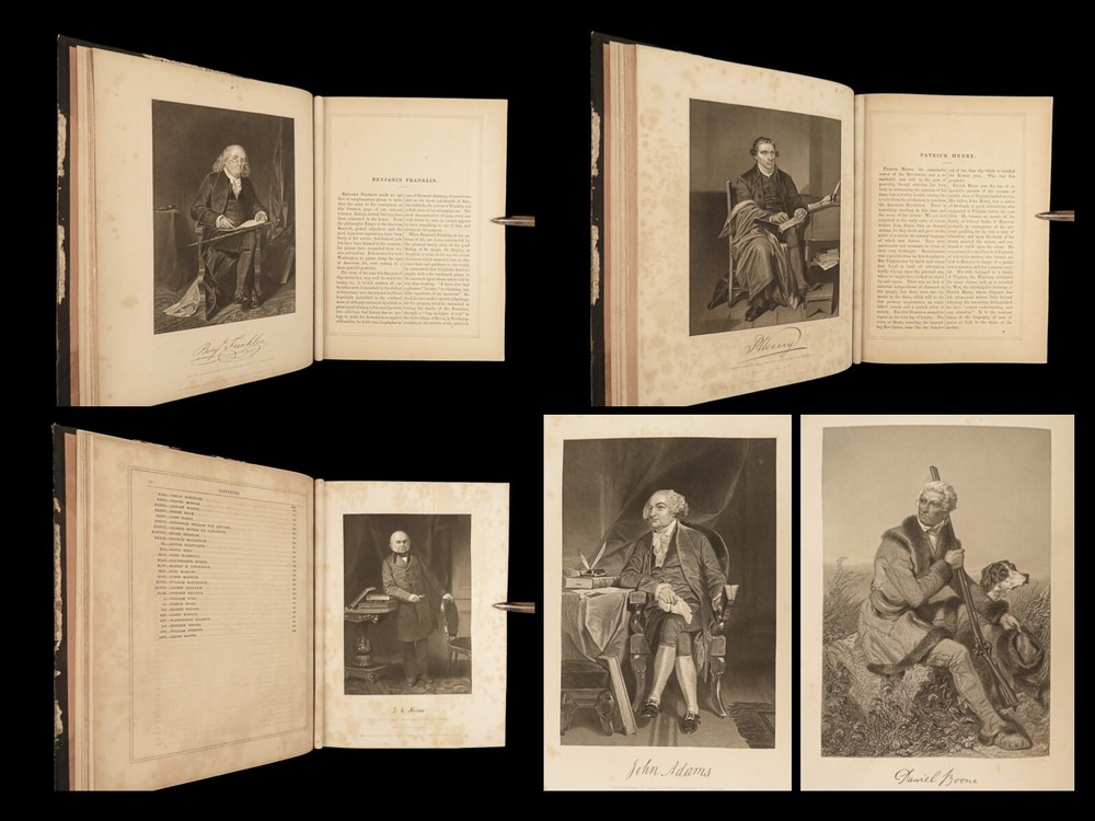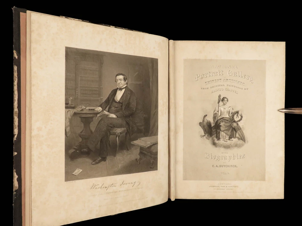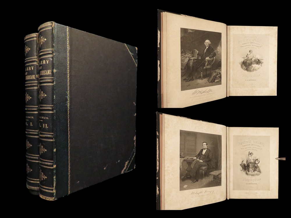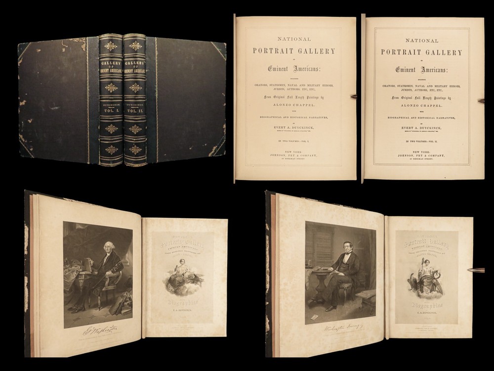 1862 National 119 Portraits 1 ed ART Gallery Washington Thomas Jefferson Chappel Illustrated by “perhaps one of the best historical illustrators in the United States,” Alonzo Chappel. (Metropolitan Museum of Art, N.Y.) ‘National Portrait Gallery’ is one of the most impressive collections of biographies of famous Americans with portraits of leading figures from American History. This incredible set contains biographies of American leaders such as George Washington, Benjamin Franklin, Thomas Jefferson, and Alexander Hamilton. The appeal of this work, however, is the 119 portrait engravings by Alonzo Chappel. Item number: #30568 Price: $599 DUYCKINCK, Evert National portrait gallery of eminent Americans: including orators, statesman, naval and military heroes, jurists, authors, etc., etc. from original full-length paintings by Alonzo Chappel, with biographical and historical narratives. New York: Johnson, Fry & Company, 1862. First edition Details : · Collation: Complete with all pages; 2 volumes o Vol. I –viii, 9-488 o Vol. II – iv, [2], 5-470 § Table of Contents for Volume I is bound behind table of contents in Volume II o 100+ portraits & vignette titles · Provenance: Handwritten – Ruth E. Legg · Language: English · Binding: Leather; tight and secure · Size : ~11.25 in X 8.75in (28.5cm x 22cm) Our Guarantee: Very Fast. Very Safe. Free Shipping Worldwide. Customer satisfaction is our priority! Notify us with 7 days of receiving, and we will offer a full refund without reservation! 30568