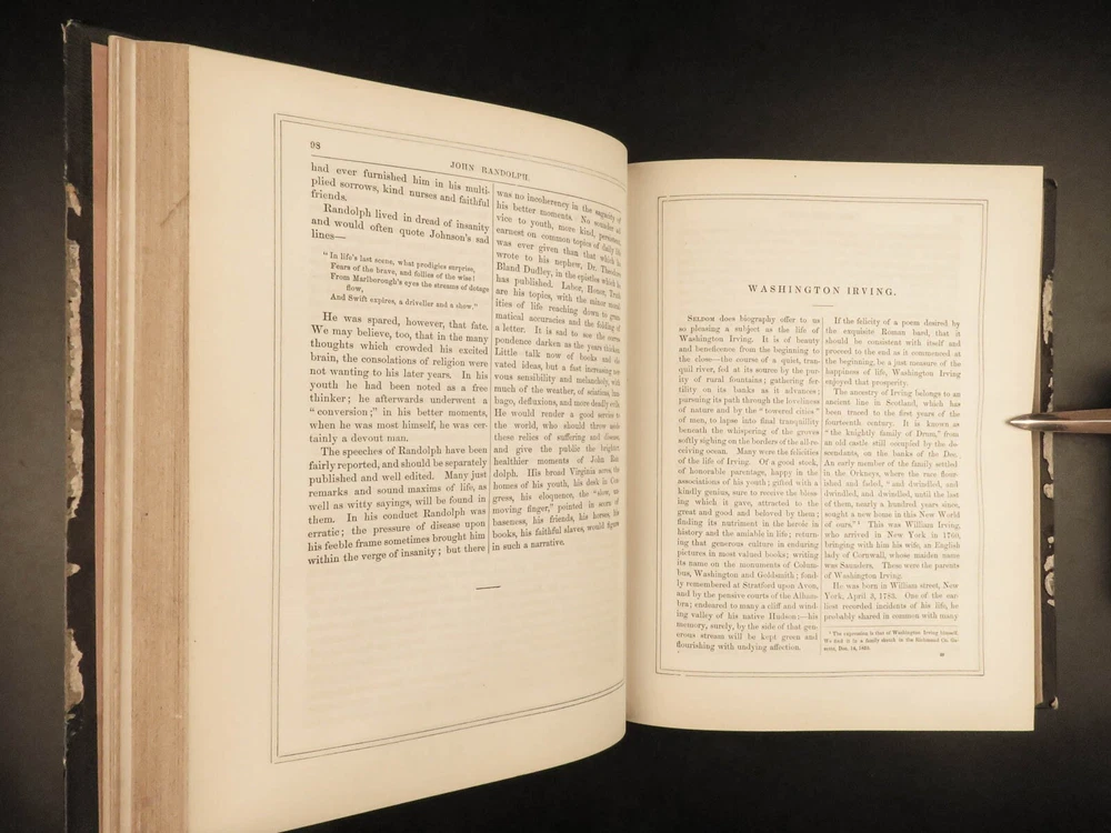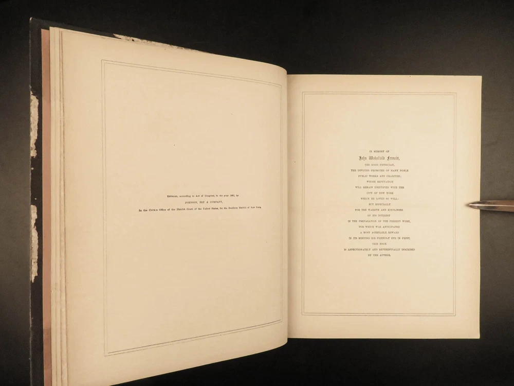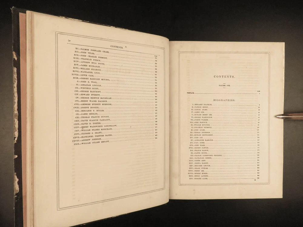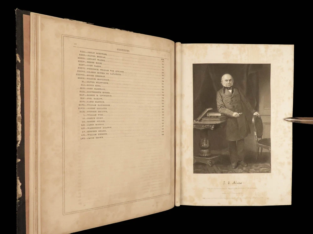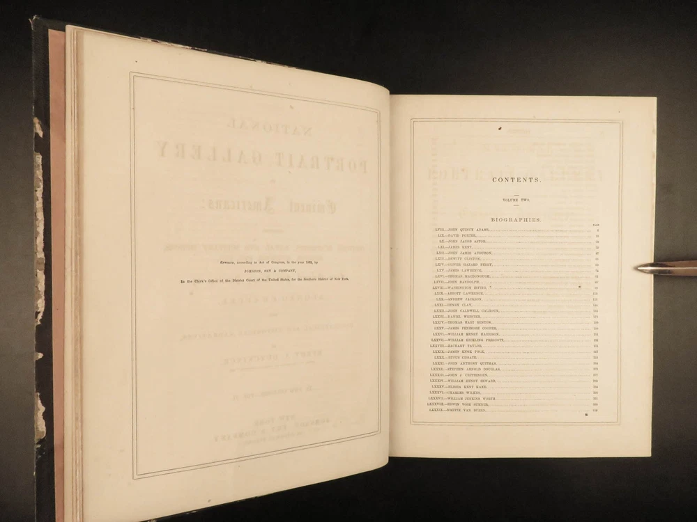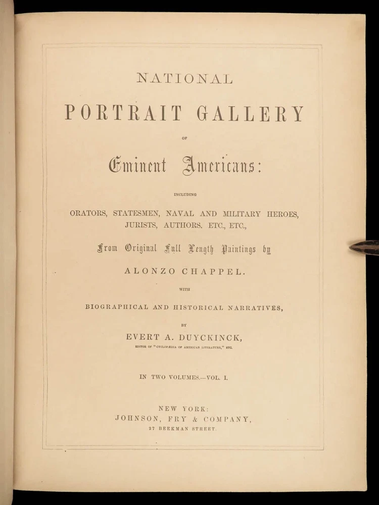 1862 National 119 Portraits 1 ed ART Gallery Washington Thomas Jefferson Chappel Illustrated by “perhaps one of the best historical illustrators in the United States,” Alonzo Chappel. (Metropolitan Museum of Art, N.Y.) ‘National Portrait Gallery’ is one of the most impressive collections of biographies of famous Americans with portraits of leading figures from American History. This incredible set contains biographies of American leaders such as George Washington, Benjamin Franklin, Thomas Jefferson, and Alexander Hamilton. The appeal of this work, however, is the 119 portrait engravings by Alonzo Chappel. Item number: #30568 Price: $599 DUYCKINCK, Evert National portrait gallery of eminent Americans: including orators, statesman, naval and military heroes, jurists, authors, etc., etc. from original full-length paintings by Alonzo Chappel, with biographical and historical narratives. New York: Johnson, Fry & Company, 1862. First edition Details : · Collation: Complete with all pages; 2 volumes o Vol. I –viii, 9-488 o Vol. II – iv, [2], 5-470 § Table of Contents for Volume I is bound behind table of contents in Volume II o 100+ portraits & vignette titles · Provenance: Handwritten – Ruth E. Legg · Language: English · Binding: Leather; tight and secure · Size : ~11.25 in X 8.75in (28.5cm x 22cm) Our Guarantee: Very Fast. Very Safe. Free Shipping Worldwide. Customer satisfaction is our priority! Notify us with 7 days of receiving, and we will offer a full refund without reservation! 30568