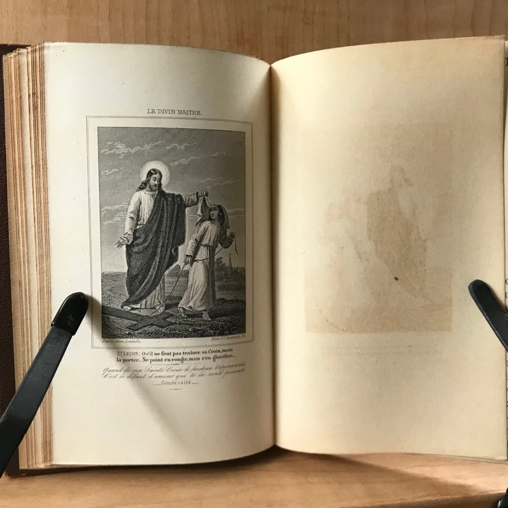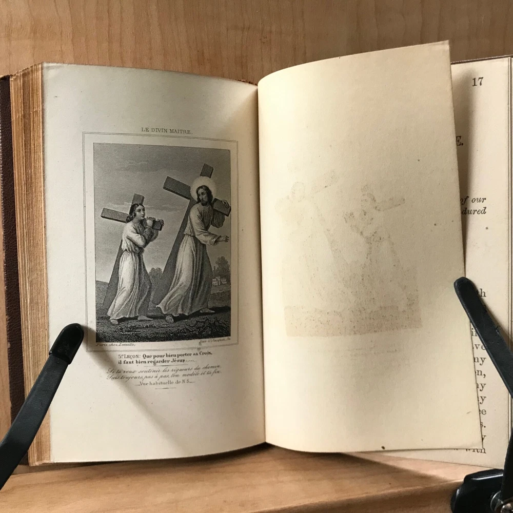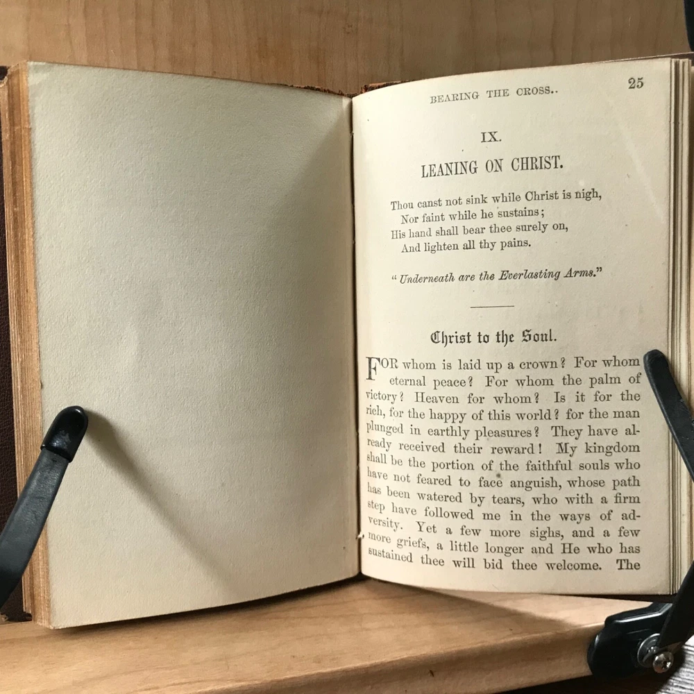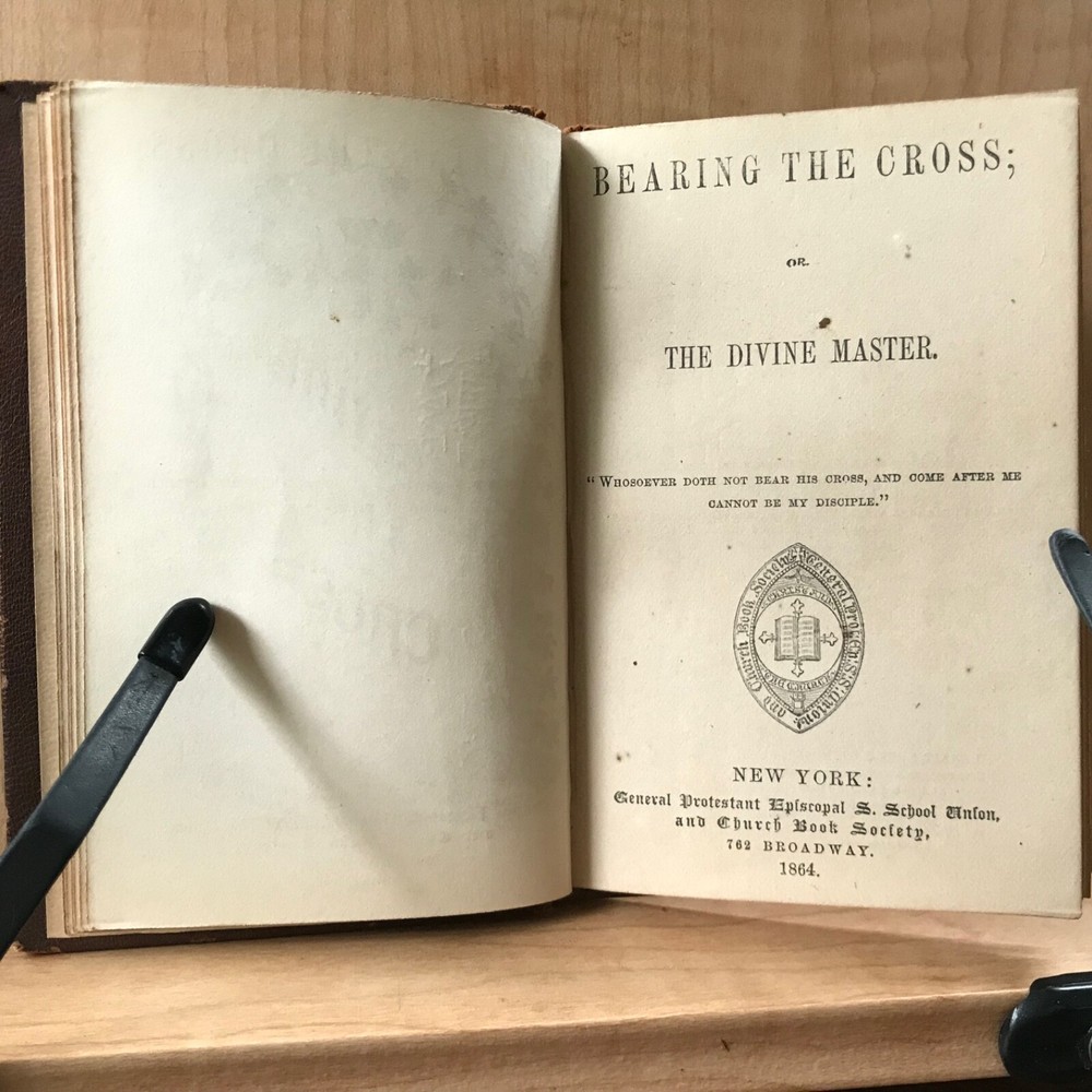 Bearing the Cross; Or, The Diving Master, General Protestant Episcopal S. School Union and Church Book Society, New York, 1864, 28 pp, illustrated, full leather, 5.75 x 3.75”, 32mo. In good condition. Light wear to extremities with minor scuffing along corners. More heavier scuffing and rubbing along spine with dryness and light red rot. Deborah Adams tooled in gilt on front board. End papers clean. Quote in old hand graphite on second fly leaf. Interior lightly toned. Minimal foxing. Light offsetting from plates. Binding tight and intact. Please see photos. A personalized book of Christian living with insights on hope and patience taught by Christ. COLR1864ABBN