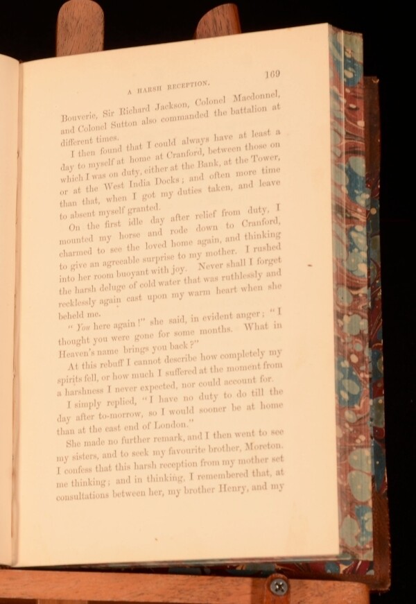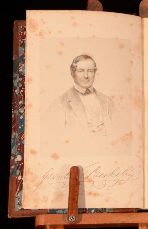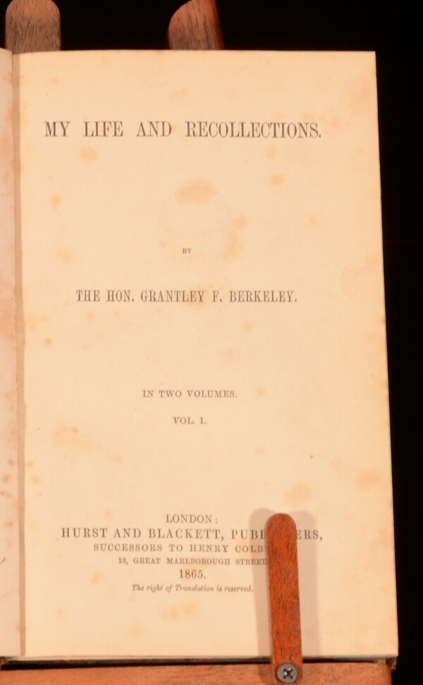 Click here to see our other books! My Life and Recollections Grantley F Berkley 1865 Hurst and Blackett Publishers : London 8.5" by 5" (xi) 383pp.; (xi) 358pp. SUMMARY An autobiographical work by politician and author Grantley F. Berkeley. Leather Binding Overall Condition: Very Good Indeed This book weighs 2 KG when packed UK Postage: £ 3.99 US Postage: £ 29.99 EU Postage : £ 21.99 European Postage: £ 23.99 Asia Postage: £ 37.99 Worldwide Postage: £ 38.99 DESCRIPTION Berkeley was the author of a number of books, including Berkeley Castle, Sandron Hall, or the Days of Queen Anne, 1840, and My Life and Recollections, 4 volumes, 1865-66. In 1836 he proposed the admission of ladies to the gallery of the House of Commons; this was granted in 1841. After 1852 he devoted himself largely to field sports and writing. Bookplate of Charles Vaughan to front pastedown. Complete in two volumes. CONDITION In half-morocco bindings with marbled boards. Externally, smart, though with some slight rubbing. Internally, generally firmly bound. Pages are bright and clean, with just the occasional spot. Overall Condition: Very Good Indeed GLOSSARY OF TERMS Overall Condition (Dustwrapper condition rating is shown after that for the book itself, where a dustwrapper is present) Fine - Very well preserved copy showing very little wear Very Good Indeed - Only one or two minor faults, really a very attractive copy Very Good - Quite a wide term meaning no major faults but probably several smaller ones often expected given the age of the book, but still a respectable copy Good - Meaning not very good. Some more serious faults as will be described in the condition report under 'condition' Good Only - Meaning one or more faults that could really do with repair Fair - As with good only above but with other faults leaving a compromised copy even after repair Poor - Really bad and possibly seriously incomplete. We only sell books in this condition where their rarity or value makes them attractive none the less. Major defects will be described. GUARANTEE We offer a full money back guarantee on our descriptions. Please ask for details and conditions. We prefer PAYPAL. If you pay via PAYPAL we will post the item off the same or the next working day with the postage you have selected. Please note we cannot accept USD cheques