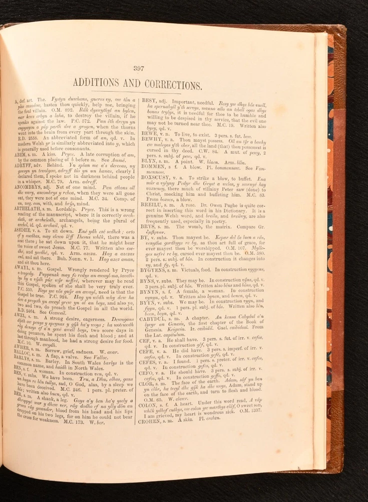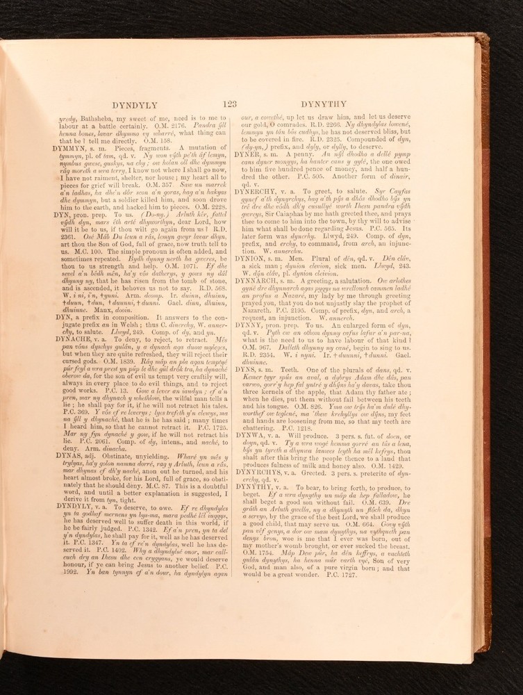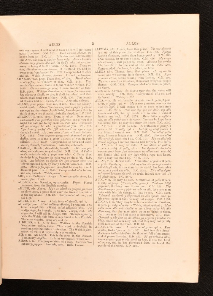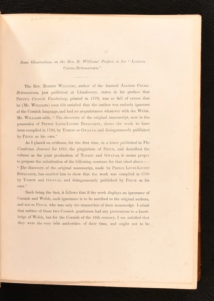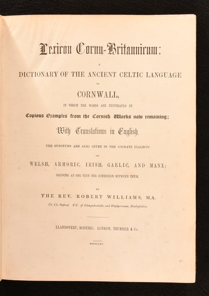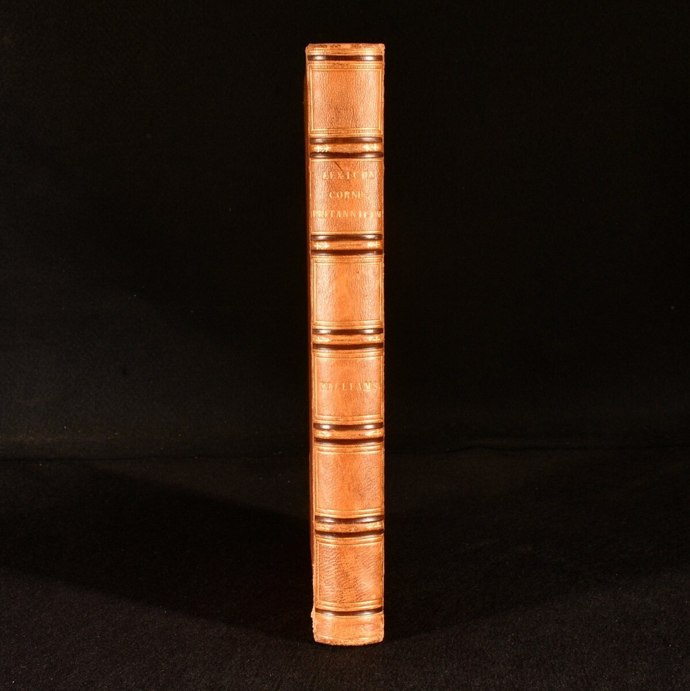 Click here to see our other books! Lexicon Cornu-Britannicum: Dictionary of the Ancient Celtic Language of Cornwall The Rev. Robert Williams 1865 Roderic : Llandovery 11" by 8.5" [4], 2, 400pp. SUMMARY The first edition of this exceptionally scarce dictionary of the ancient Celtic language of Cornwall, compiled by the Rev. Robert Williams. First Edition,Leather Binding,Very Scarce Overall Condition: Very Good This book weighs 2 KG when packed UK Postage: £ 3.99 US Postage: £ 29.99 EU Postage : £ 21.99 European Postage: £ 23.99 Asia Postage: £ 37.99 Worldwide Postage: £ 38.99 DESCRIPTION The first edition. Bound in half crushed morocco with cloth boards. A comprehensive dictionary of the ancient Celtic language of Cornwall, with copious examples from original Cornish works, accompanied by translations in English. With synonyms given in the cognate dialects of Welsh, Armoric, Irish, Gaelic and Manx, demonstrating the connection between them. Written by the Rev. Robert Williams, the incumbent of Llandovery in Wales. From the late seventeenth century, the slow disappearance of the traditional Cornish language attracted the interest of scholars and antiquarians, leading to a series of publications on the subject, including this one. With two bookplates; one of English literary critic and Shakespearean scholar, C. M. Ingleby and the other of F. Arthur Wadsworth. CONDITION Bound in half crushed morocco with cloth boards. Externally, very good, with light bumping to the extremities and the odd mark, including a black pen mark to the front. Slight rubbing to joints and extremities. A little fading to the spine. Hinges are a touch strained, but holding firm. Bookplates to front paste down and front endpaper, with bookseller label to front paste down. Internally, firmly bound. Pages are bright and clean. Overall Condition: Very Good GLOSSARY OF TERMS Overall Condition (Dustwrapper condition rating is shown after that for the book itself, where a dustwrapper is present) Fine - Very well preserved copy showing very little wear Very Good Indeed - Only one or two minor faults, really a very attractive copy Very Good - Quite a wide term meaning no major faults but probably several smaller ones often expected given the age of the book, but still a respectable copy Good - Meaning not very good. Some more serious faults as will be described in the condition report under 'condition' Good Only - Meaning one or more faults that could really do with repair Fair - As with good only above but with other faults leaving a compromised copy even after repair Poor - Really bad and possibly seriously incomplete. We only sell books in this condition where their rarity or value makes them attractive none the less. Major defects will be described. GUARANTEE We offer a full money back guarantee on our descriptions. Please ask for details and conditions. We prefer PAYPAL. If you pay via PAYPAL we will post the item off the same or the next working day with the postage you have selected. Please note we cannot accept USD cheques