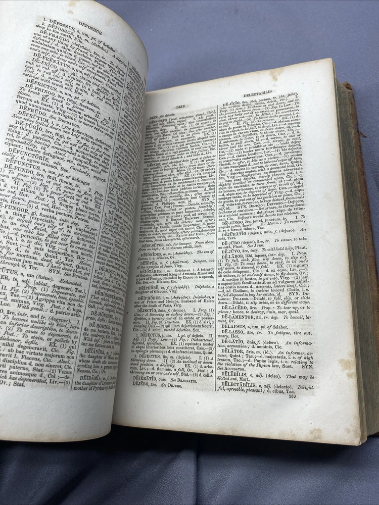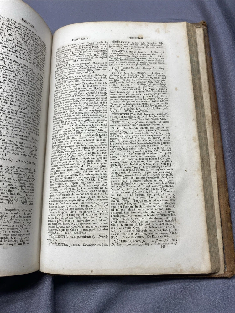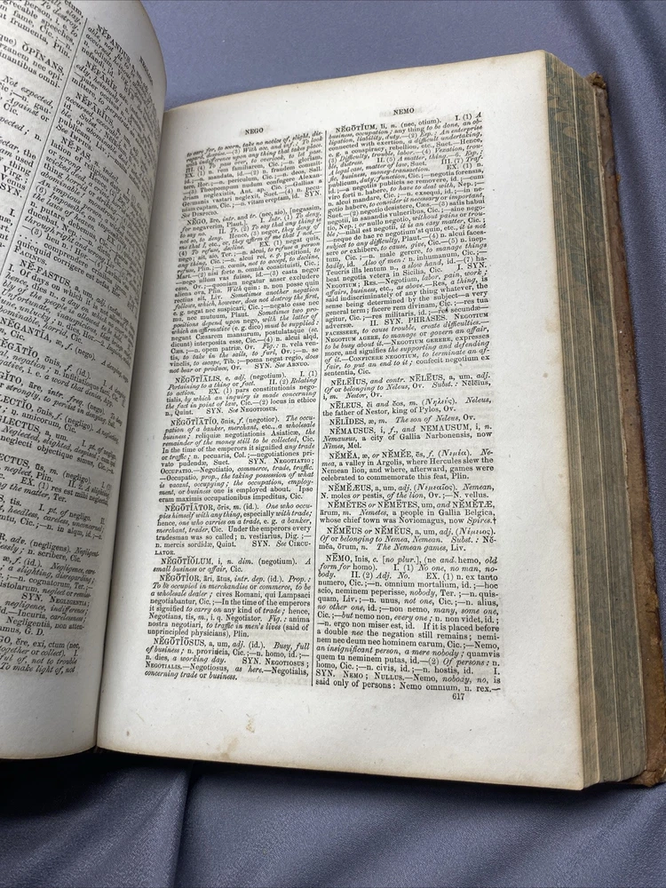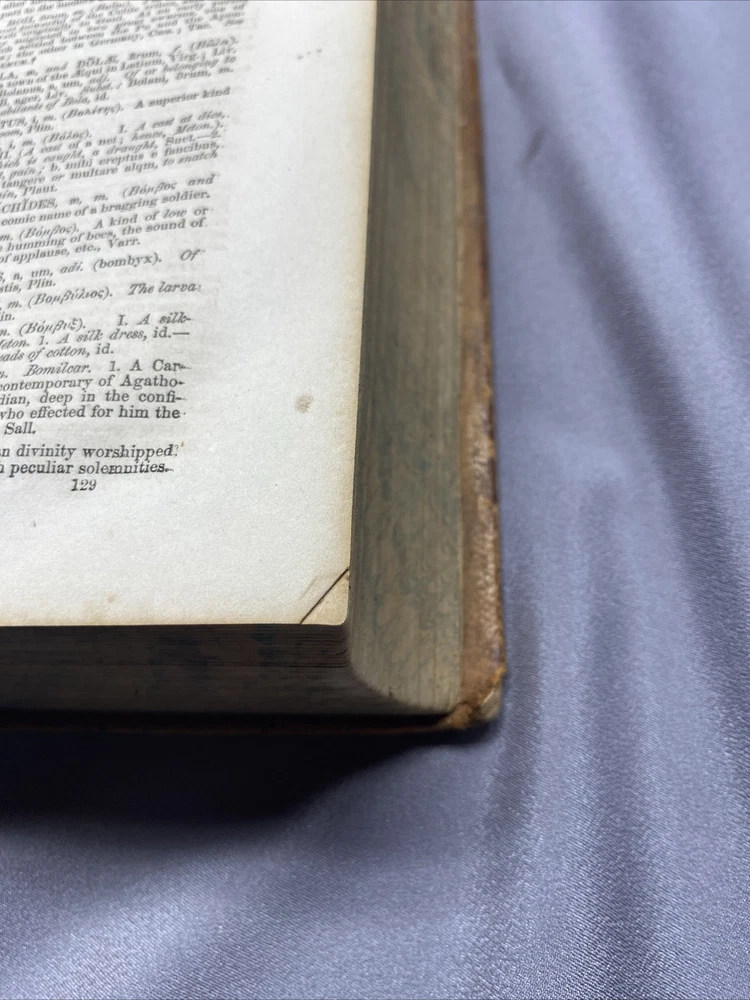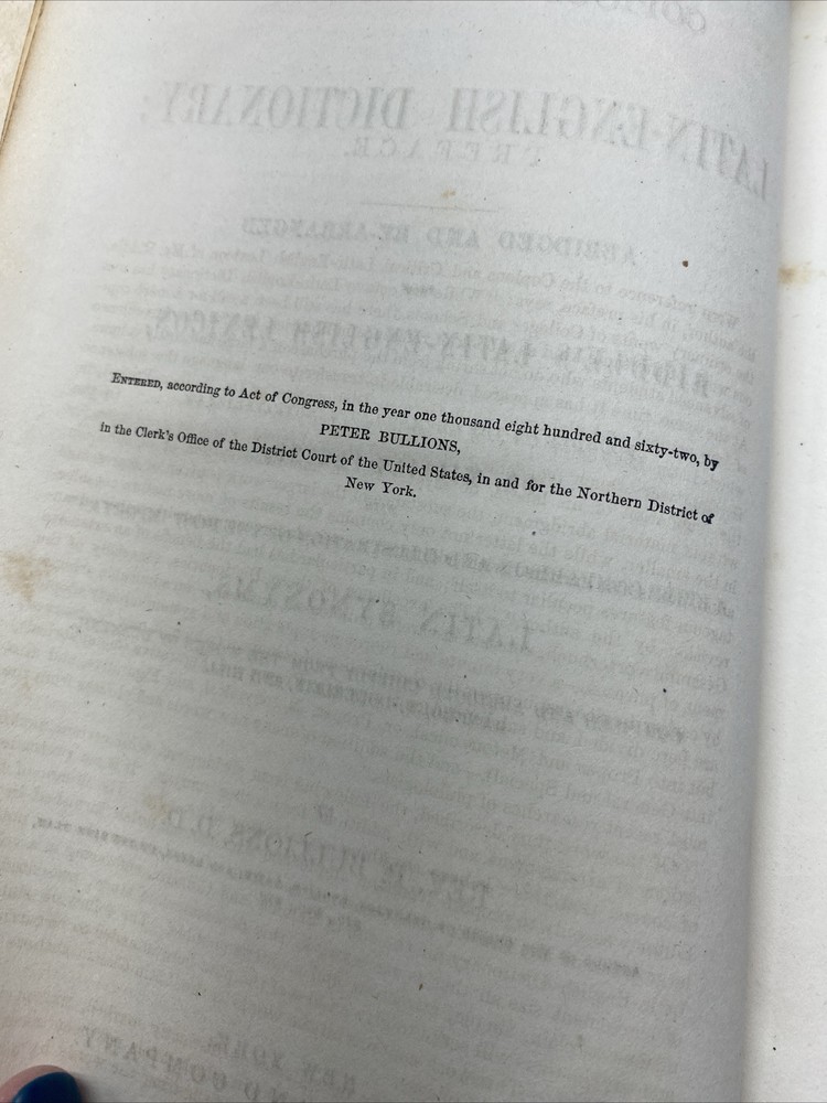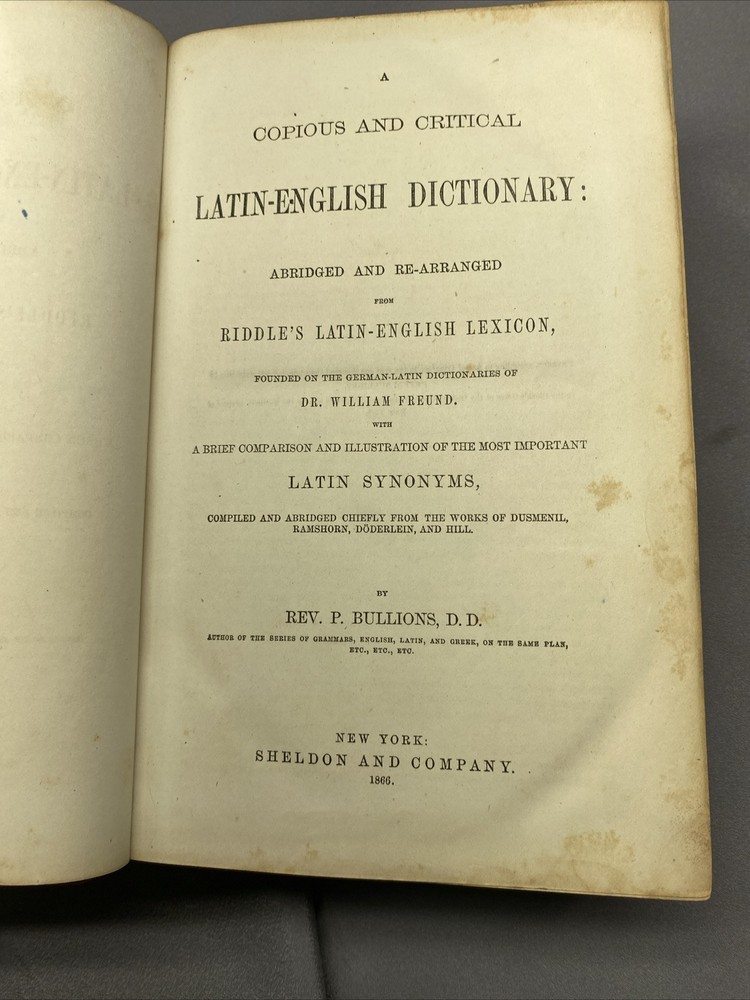 A leather-bound antique book published in New York in 1866 by Sheldon & Co., written by Rev. P. Bullions. It is a Latin-English dictionary with critical commentary, intended for reference purposes. The book is an original edition and part of the antique books character family. Smoke free. Pages still intact to binding. Shows some wear. See photos.
