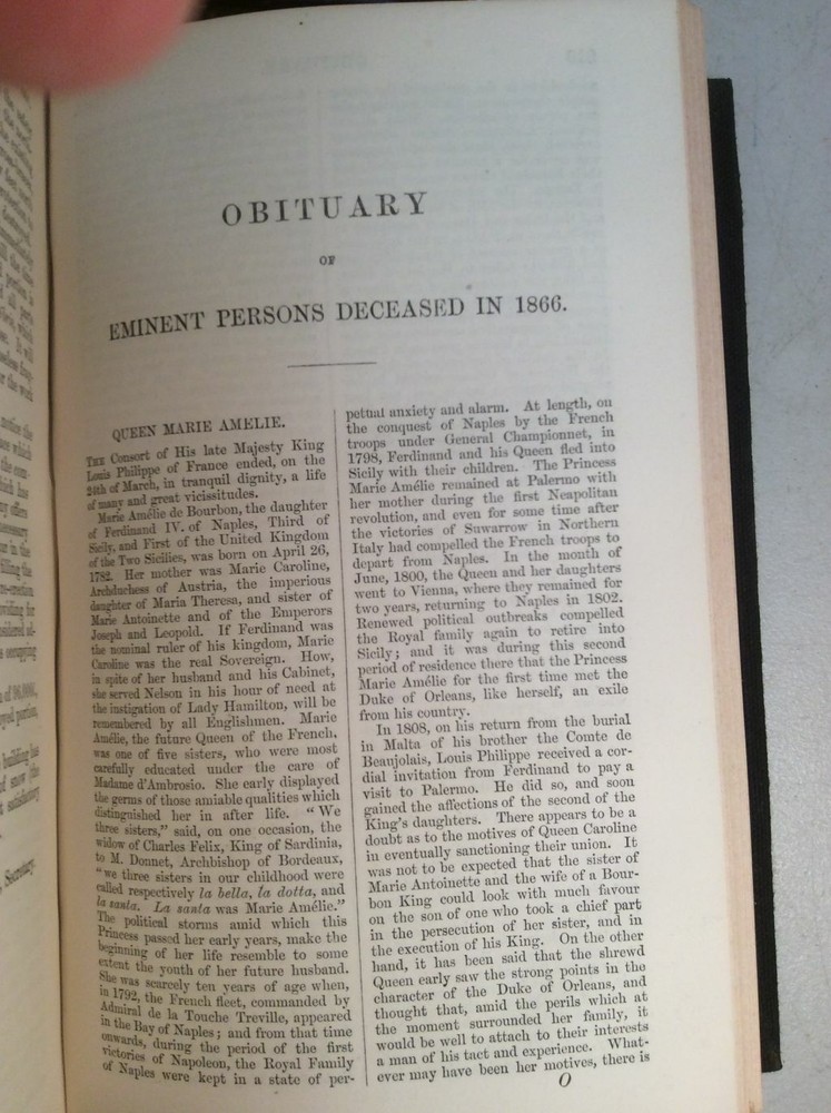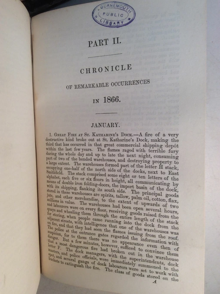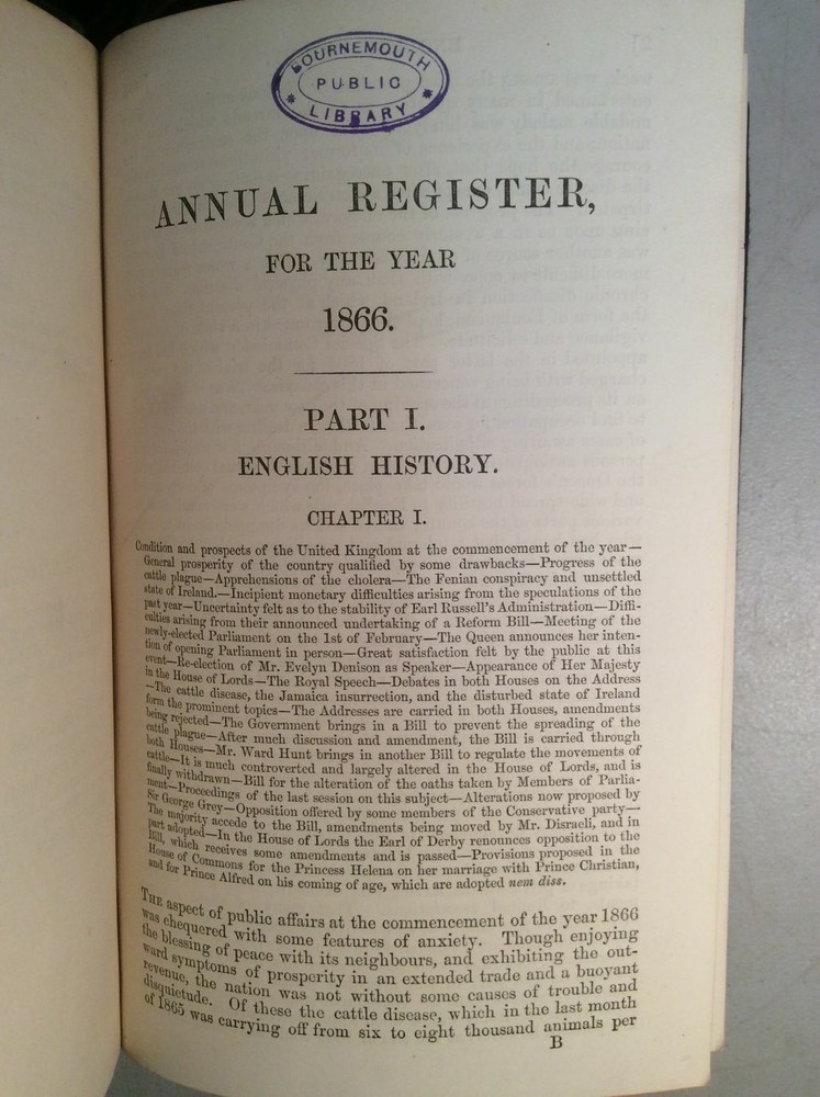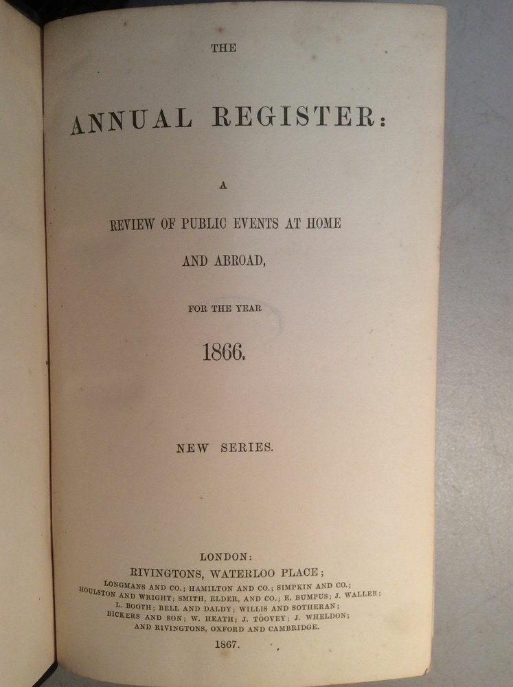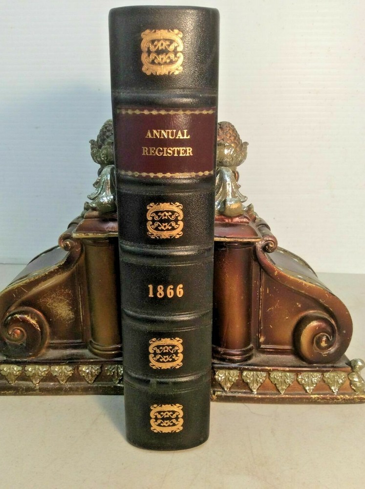 Attention Collectors!!! You are bidding on a rare antique hardcover book titled: The Annual Register - A Review of Public Events At Home And Abroad For the Year 1866. Printed for for Rivingtons, Waterloo Place, London, 1867. Imagine, this book is over 150 years old!!! The book has been professionally and beautifully rebound: quarter-bound in black leather with black cloth covers. Spine has five raised bands. The titling is in gold on red leather spine label and the date (1866) is on a black morocco label. The leather binding is in excellent condition. All pages are clean and tightly bound. The book also has new endpages. No writing in book and no previous owner bookplates. A few pages have small ink stamp from Bournemouth Public Library. There are no other markings. Book remains in very good condition! Nice rare, antique book to add to a collection! Very collectible! Great gift idea! (Inventory: 214) Track Page Views With Auctiva's FREE Counter
