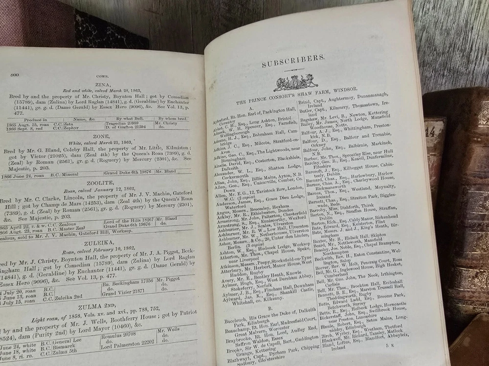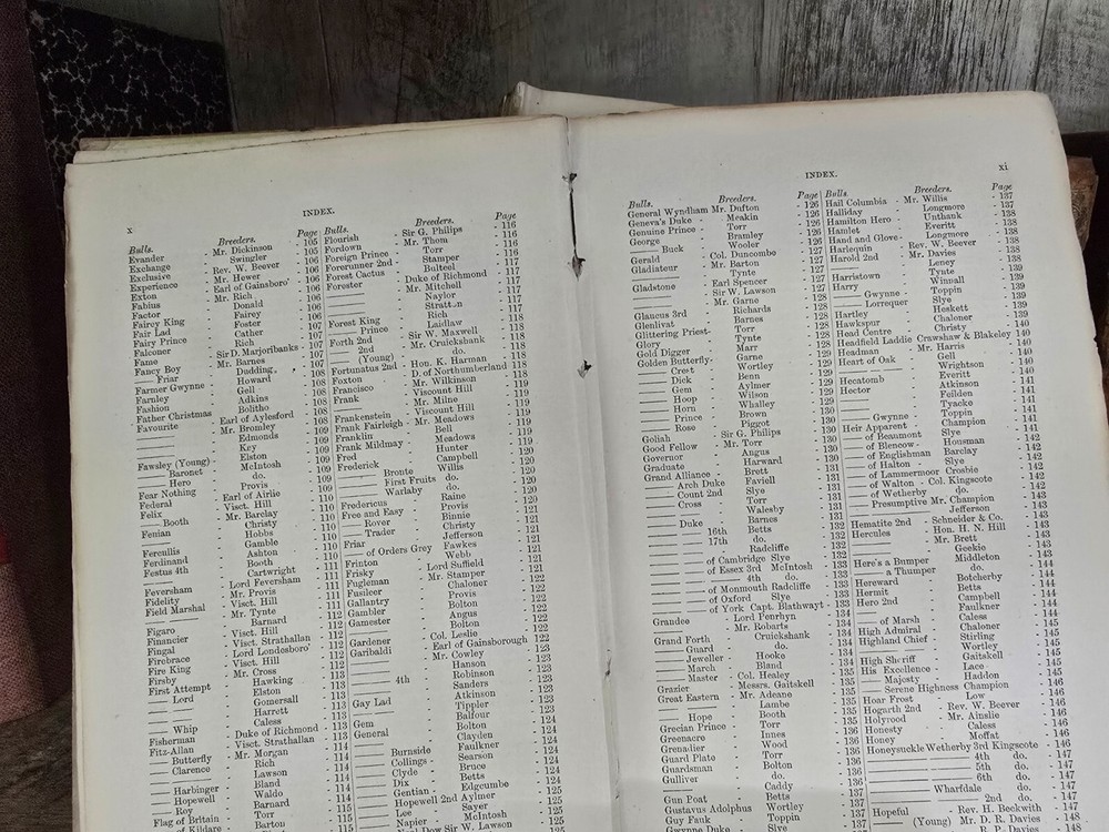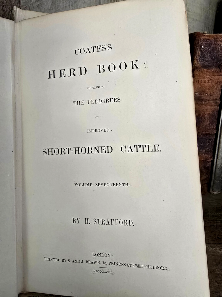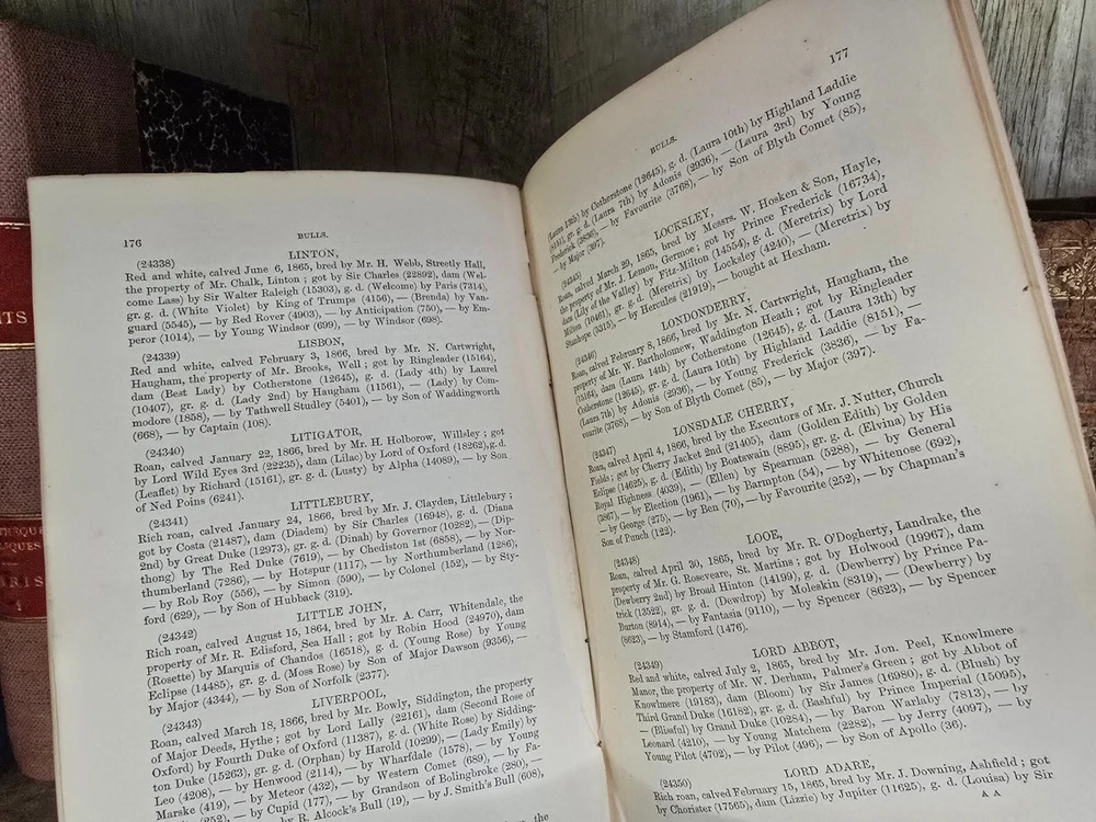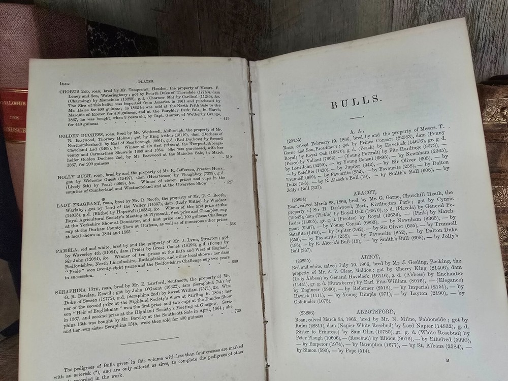 " Coates's Herd Book: Containing the Pedigrees of Improved Short-Horned Cattle " The book titled "Coates's Herd Book: Containing the Pedigrees of Improved Short-Horned Cattle" , specifically Volume Seventeenth , compiled by H. Strafford and published in 1867 in London by S. and J. Brawn . This volume is a comprehensive genealogical record dedicated to short-horned cattle , prominent British cattle breed renowned for its dairy and beef qualities. The herd book meticulously documents the lineage (pedigrees) of registered bulls, including breeder names and birth dates, serving as an essential reference for breeders to trace bloodlines, ensure purity, and improve herd genetics. Summary: Volume XVII of Coates's Herd Book offers an indexed and detailed catalog of hundreds of short-horned bulls , organized alphabetically and accompanied by breeder details. It includes precise information on each bull’s lineage, date of birth , and breeding history. This volume was an indispensable resource for 19th-century livestock breeders, agricultural historians, and geneticists, providing transparency and continuity in cattle breeding practices. The detailed structure reflects the high value placed on pedigree in Victorian agriculture and the foundational role of such registries in modern animal husbandry. Pages: 800 Size: 8.4" x 5.4" x 2" See other $0.99 items