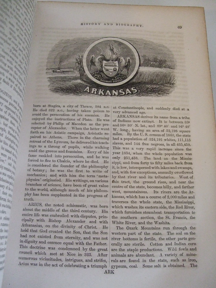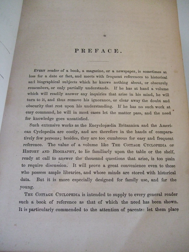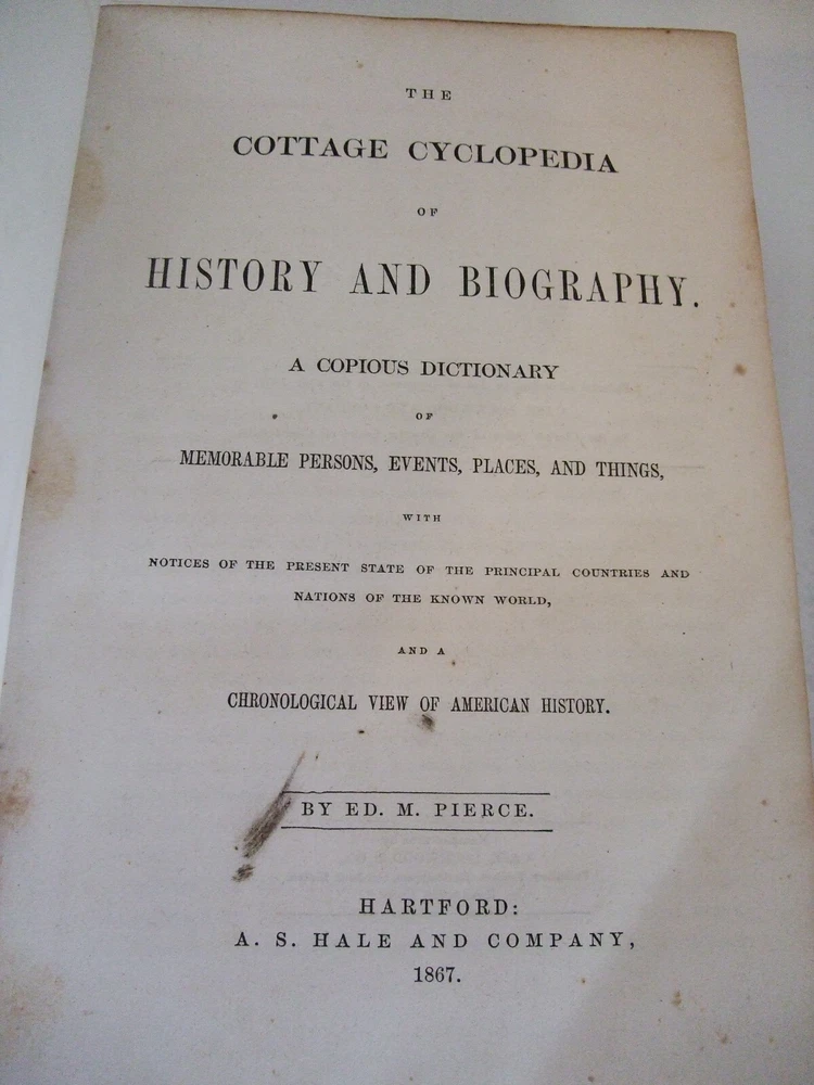 The Cottage Cyclopedia of History and Biography. A Copious Dictionary of Memorable Persons, Events, Places, and Things Pierce, Ed. M. Hartford, CT: A. S. Hale and Company, 1867. Leather, no dust jacket, 1004 pages. 8vo: 9 3/4'' x 6 1/2'' Fair+ to good- condition: Sheep skin leather boards. Boards are detached and rubbed on surface and edges. Back strip and spine are mostly chipped away--the remainder of the spine is taped. Pages are age toned have some foxing. Book with clean interior having no markings, writing, underlining, or highlighting in margins or text block. Inventory number 12312 POSTAGE and PAYMENT OPTIONS Payment is due within 72 hours of winning the auction/Buy It Now Books are shipped within 3 business days. I have no control over delivery time once the package leaves my hands.