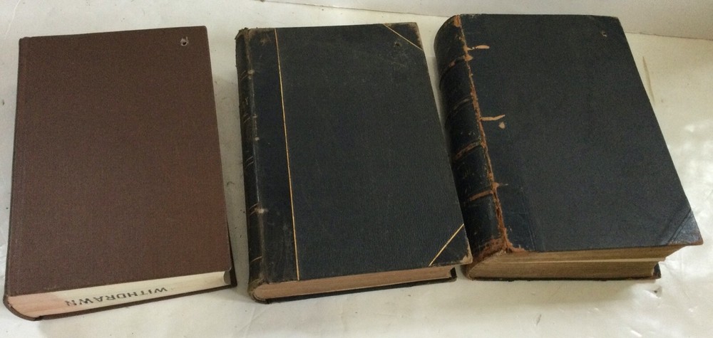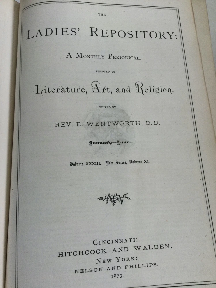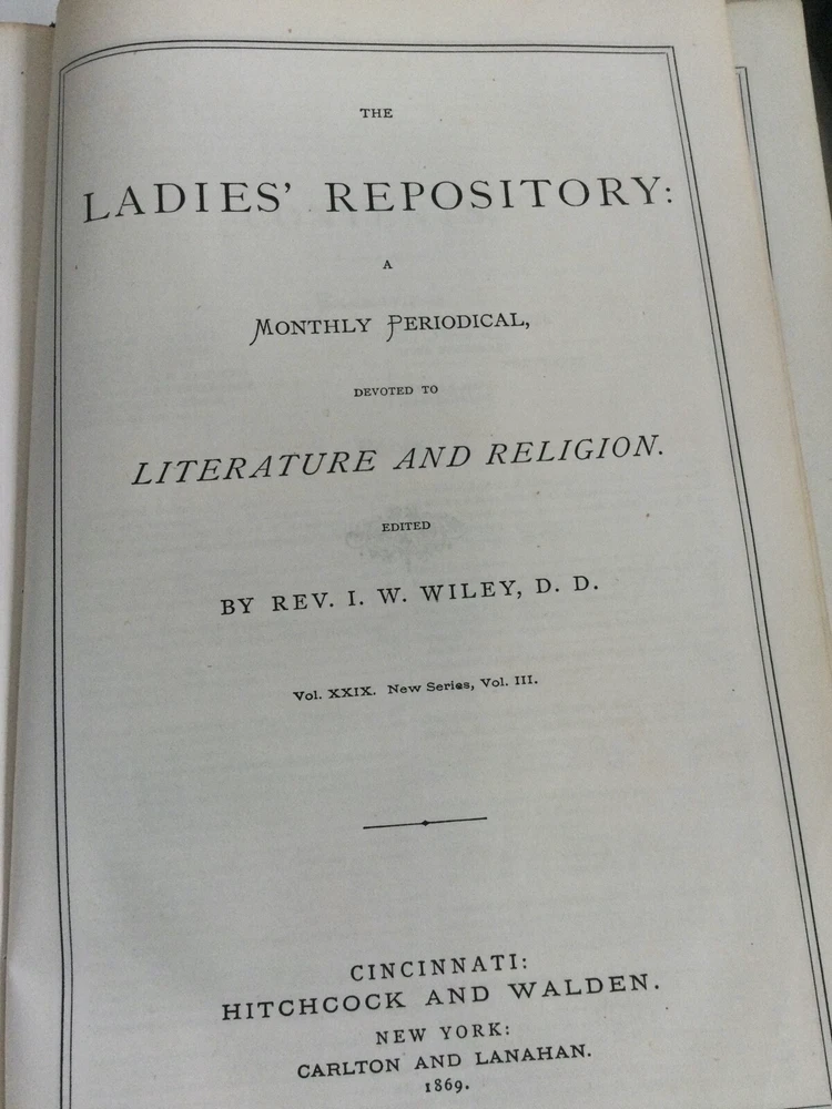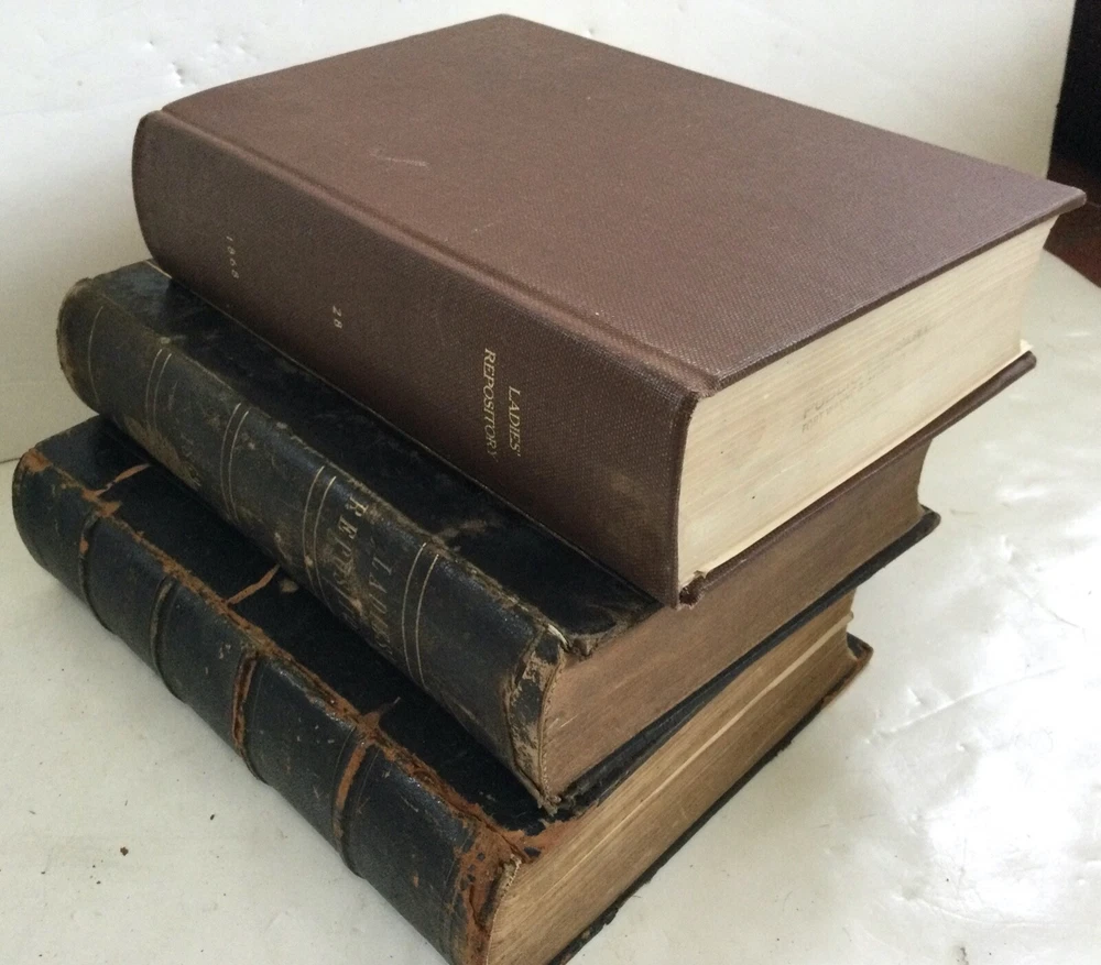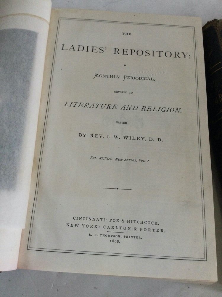 Fresh out of an early Maine estate collection. As found together. Lot of three (3) "Ladies' Repository" 1868, 1869 and 1873. Literature, Religion. Two are leather bound. One (1868) has been re-bound ages ago and has library markings. Some outer spine separation, solid. Each book has a hole in top portion of one cover only. Text good, may have a loose page or two. Larger books measure 10 1/2" x 7 1/2". Engravings. Please see photos as to type and condition. Un-researched. Lot weighs well over 12 lbs. A great lot! Shipping includes insurance and custom packaging to ensure a safe arrival. Please see my other items from the same estate collection, will combine shipping, when possible. Much luck!