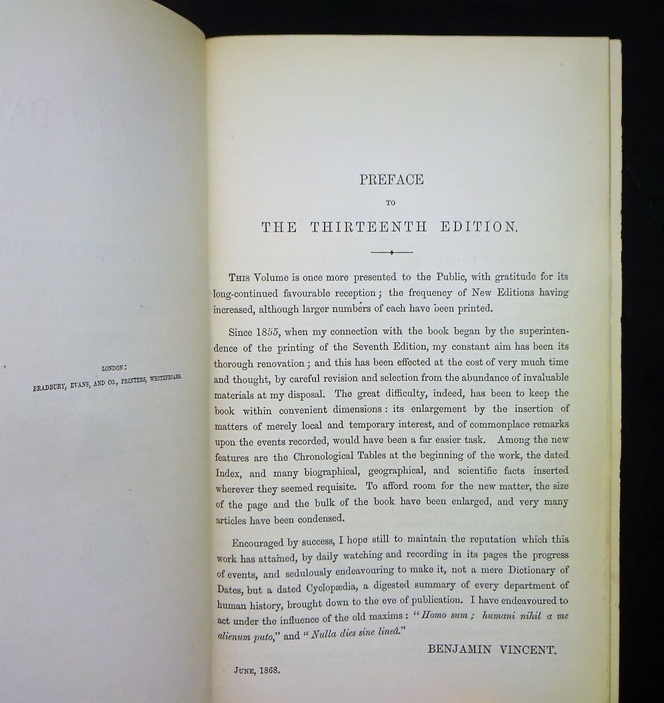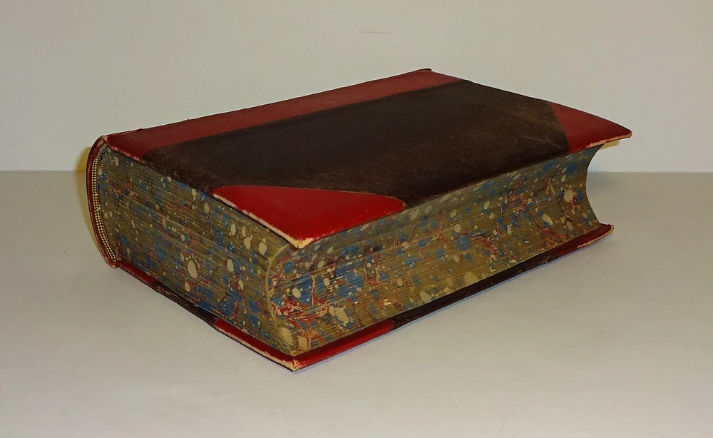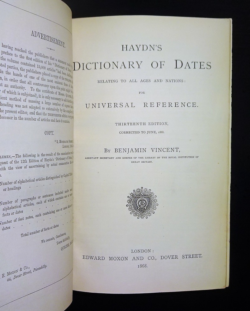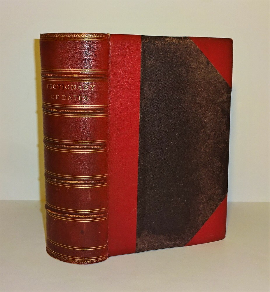 This is a handsome copy of "Haydn's Dictionary of Dates" - Relating to All Ages and Nations for Universal Reference by Benjamin Vincent. 1868 13th edition (stated); Edward Moxon and Co.; London. The book is a massive collection of notable dates and events throughout world history. Beautifully bound in three-quarter leather with marbled end papers, raised bands and gilt lettering on the spine, and marbled page edges on all sides. "Comprehending remarkable occurrences, ancient and modern, the foundation, laws, and governments of countries - their progress in arts, science, and literature - their achievements in arms - and their civil, military, religious, and philanthropic institutions, particularly of the British Empire."