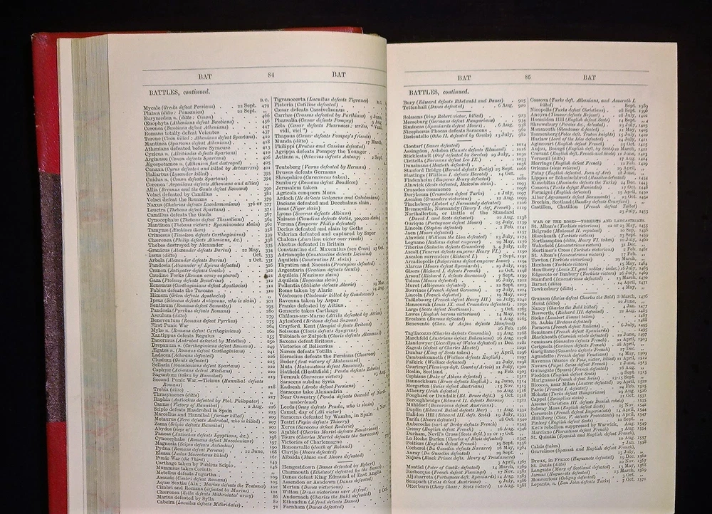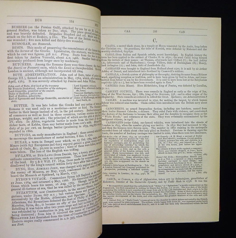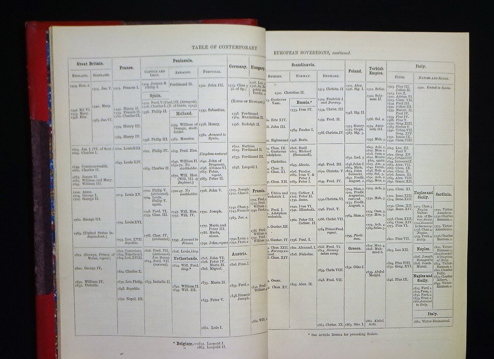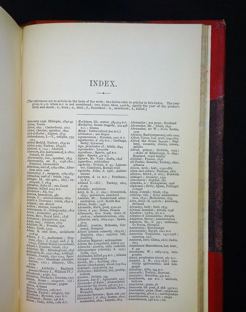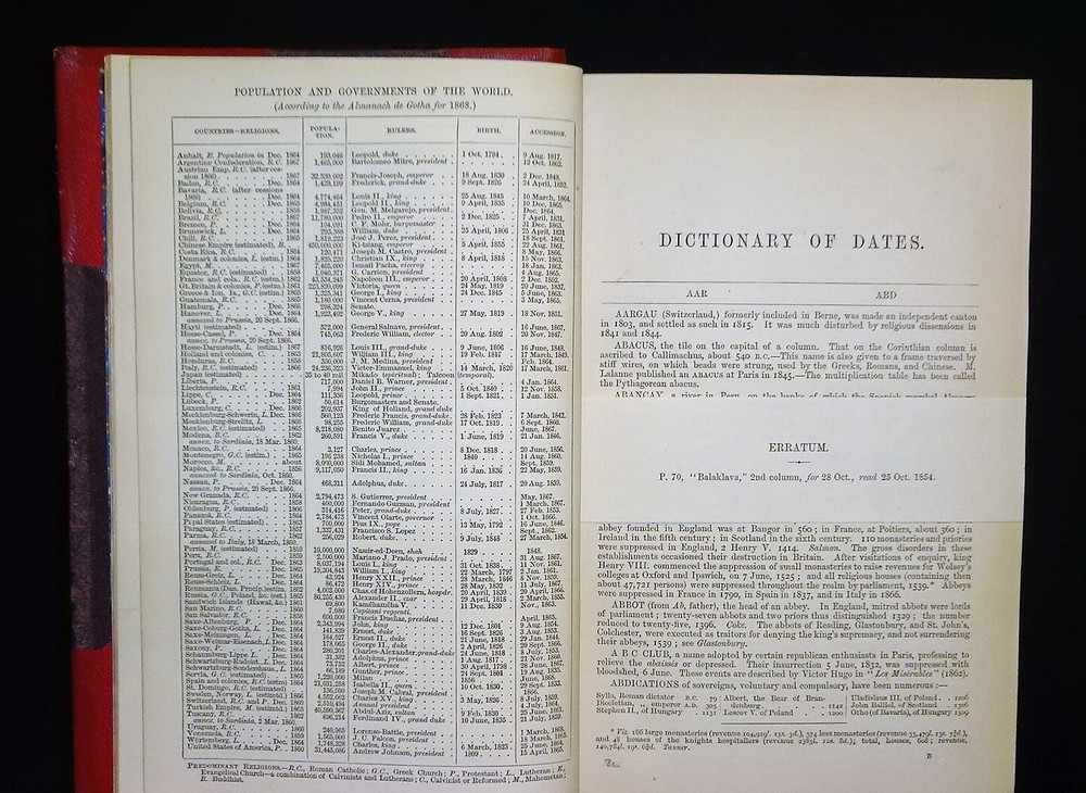 This is a handsome copy of "Haydn's Dictionary of Dates" - Relating to All Ages and Nations for Universal Reference by Benjamin Vincent. 1868 13th edition (stated); Edward Moxon and Co.; London. The book is a massive collection of notable dates and events throughout world history. Beautifully bound in three-quarter leather with marbled end papers, raised bands and gilt lettering on the spine, and marbled page edges on all sides. "Comprehending remarkable occurrences, ancient and modern, the foundation, laws, and governments of countries - their progress in arts, science, and literature - their achievements in arms - and their civil, military, religious, and philanthropic institutions, particularly of the British Empire."