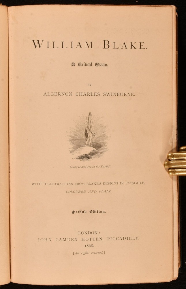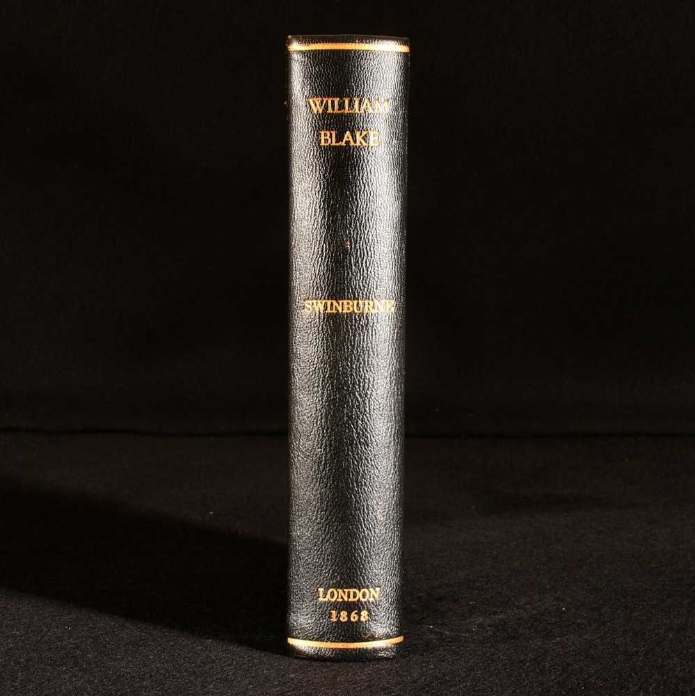 Click here to see our other books! William Blake: A Critical Essay Algernon Charles Swinburne 1868 John Camden Hotten : London 9.5" by 6.5" 2-304, 16pp SUMMARY A lovely second edition of Swinburne's celebrated biography of artist and poet William Blake, analysing both his life and his works, and illustrated throughout. Colour Plates,Early Edition,Illustrated,Leather Binding,Rebound,Signed Binding Overall Condition: Very Good This book weighs 1.5 KG when packed UK Postage: £ 3.99 US Postage: £ 23.99 EU Postage : £ 18.99 European Postage: £ 19.99 Asia Postage: £ 31.99 Worldwide Postage: £ 32.99 DESCRIPTION The second edition of Swinburne's analysis of Blake's works, published in the same year as the first. Illustrated with nine facsimile plates of Blake's work, seven of which are in full colour. Collated, complete. The work is dedicated to Swinburne's Oxford friend Dante Gabriel Rossetti, who encouraged him to write the biography. With a sixteen page publisher's catalogue to the rear. In a signed full morocco binding by David Comstock of Seattle. CONDITION In a full morocco signed binding, with endpapers renewed. Externally, fine. Internally, generally firmly bound, but with one gathering (pages 83-94) working loose. Pages a touch age toned, but generally clean and bright, with only the odd spot. Overall Condition: Very Good GLOSSARY OF TERMS Overall Condition (Dustwrapper condition rating is shown after that for the book itself, where a dustwrapper is present) Fine - Very well preserved copy showing very little wear Very Good Indeed - Only one or two minor faults, really a very attractive copy Very Good - Quite a wide term meaning no major faults but probably several smaller ones often expected given the age of the book, but still a respectable copy Good - Meaning not very good. Some more serious faults as will be described in the condition report under 'condition' Good Only - Meaning one or more faults that could really do with repair Fair - As with good only above but with other faults leaving a compromised copy even after repair Poor - Really bad and possibly seriously incomplete. We only sell books in this condition where their rarity or value makes them attractive none the less. Major defects will be described. GUARANTEE We offer a full money back guarantee on our descriptions. Please ask for details and conditions. We prefer PAYPAL. If you pay via PAYPAL we will post the item off the same or the next working day with the postage you have selected. Please note we cannot accept USD cheques