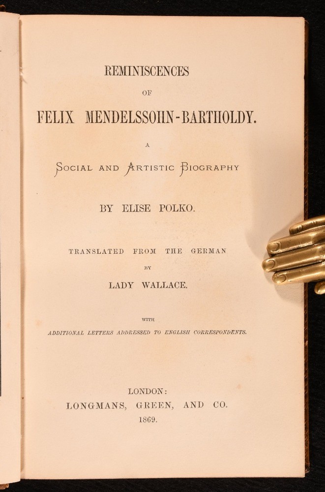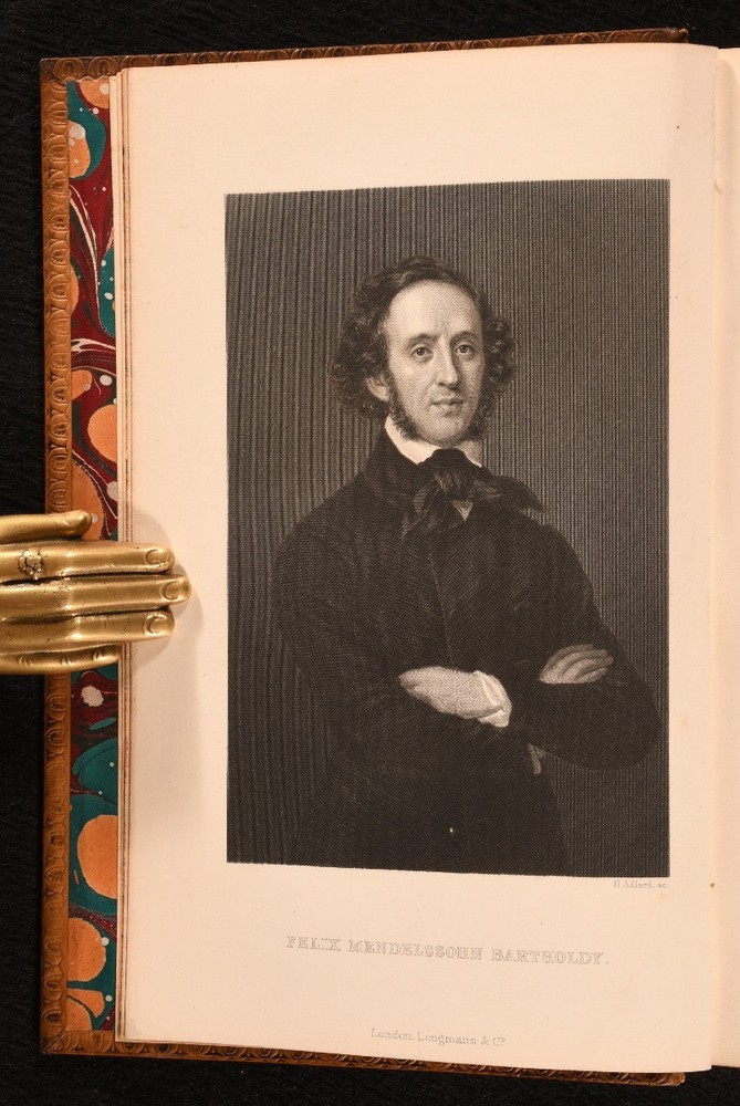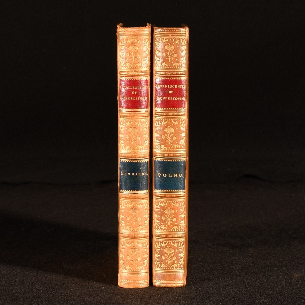 Click here to see our other books! Two Biographies on Felix Mandelssohn-Bartholdy Elise Polko; Lady Wallace [trans]; Eduard Devrient; Natalia Macfarren [trans] 1869 Richard Bentley; Longmans, Green, and Co : London 7.5" by 5" x, 251; vii, 307pp. SUMMARY Two biographies on the German composer Felix Mendelssohn, bound in decorative uniform full calf bindings, and both being the first UK editions of the works, translated from the original German. First Edition,Original Binding Overall Condition: Very Good Indeed This book weighs 1 KG when packed UK Postage: £ 3.99 US Postage: £ 19.99 EU Postage : £ 15.99 European Postage: £ 16.99 Asia Postage: £ 21.99 Worldwide Postage: £ 25.99 DESCRIPTION The first UK edition, translated from the original German. A two volume set. Bound in a uniform full calf binding with gilt details to the spines. Illustrated with monochrome frontispieces, and one coloured plate to 'Reminiscences'. Collated, complete. This set features two biographies on the life of Felix Mendelssohn, the celebrated German composer, and pianist of the early Romantic period. The works also contain some of the composer's correspondences. CONDITION Bound in full calf. Externally very smart , slight marks to the boards, rubbing to the joints and extremities, with front joint starting to the head of the front joint, and minimal loss to the head of the spine to 'Recollections'. Internally firmly bound with spotting to the front and rears, owner's signature to the front blanks, and minimal age toning, Overall Condition: Very Good Indeed GLOSSARY OF TERMS Overall Condition (Dustwrapper condition rating is shown after that for the book itself, where a dustwrapper is present) Fine - Very well preserved copy showing very little wear Very Good Indeed - Only one or two minor faults, really a very attractive copy Very Good - Quite a wide term meaning no major faults but probably several smaller ones often expected given the age of the book, but still a respectable copy Good - Meaning not very good. Some more serious faults as will be described in the condition report under 'condition' Good Only - Meaning one or more faults that could really do with repair Fair - As with good only above but with other faults leaving a compromised copy even after repair Poor - Really bad and possibly seriously incomplete. We only sell books in this condition where their rarity or value makes them attractive none the less. Major defects will be described. GUARANTEE We offer a full money back guarantee on our descriptions. Please ask for details and conditions. We prefer PAYPAL. If you pay via PAYPAL we will post the item off the same or the next working day with the postage you have selected. Please note we cannot accept USD cheques