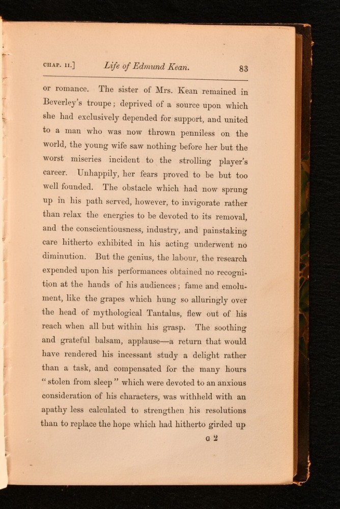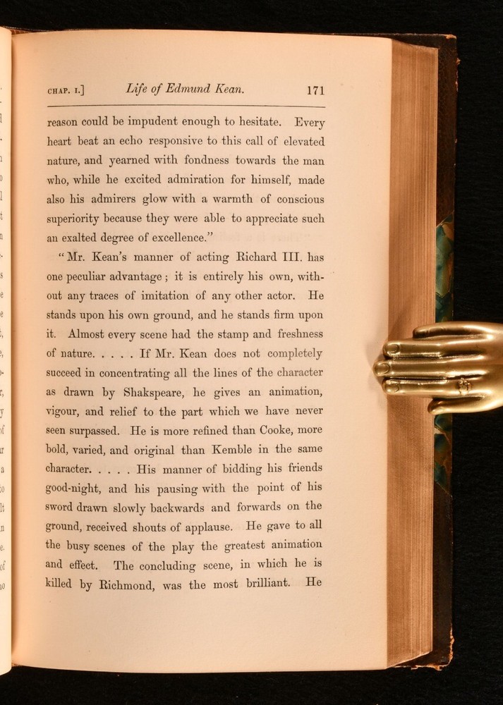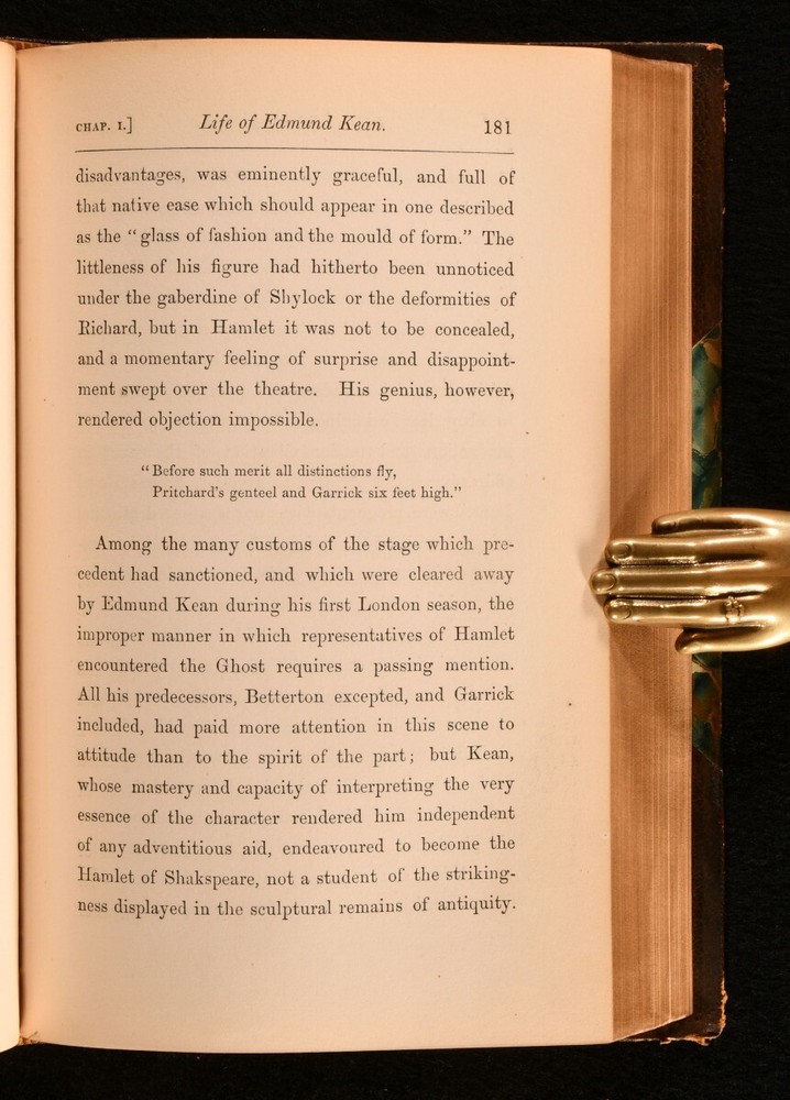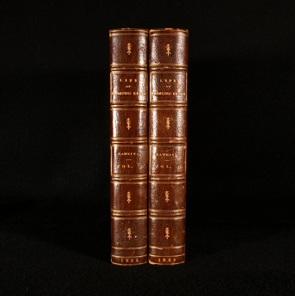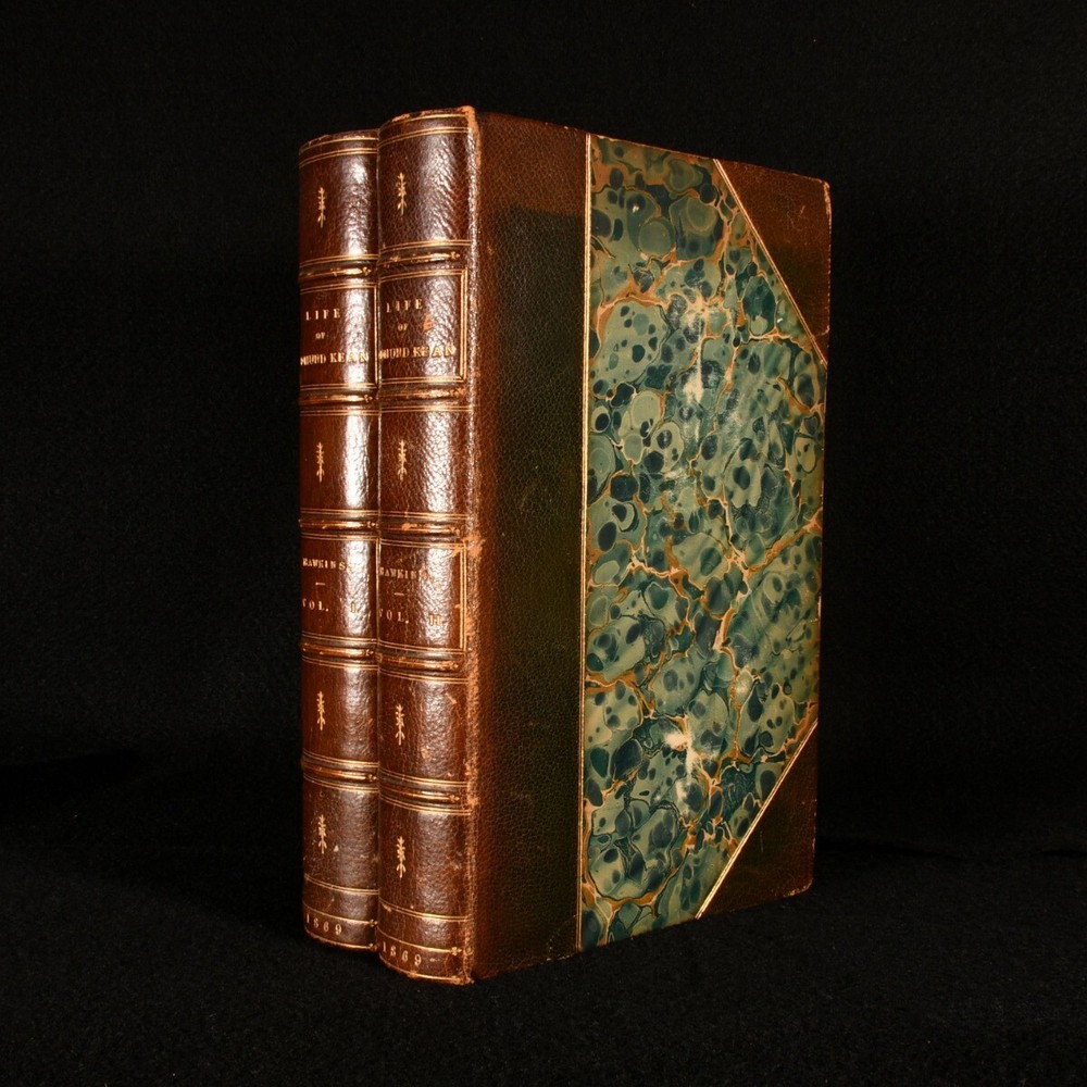 Click here to see our other books! The Life of Edmund Kean F. W. Hawkins 1869 Tinsley Brothers : London 8.5" by 5.5" [7], x-xxiii, [2], 2-420; [4], vi-xiii, [2], 2-430pp SUMMARY A lovely first edition of this biography exploring the life of actor Edmund Kean, from the library of fellow actor Leslie Henson. First Edition,Leather Binding Overall Condition: Very Good This book weighs 2 KG when packed UK Postage: £ 3.99 US Postage: £ 29.99 EU Postage : £ 21.99 European Postage: £ 23.99 Asia Postage: £ 37.99 Worldwide Postage: £ 38.99 DESCRIPTION The first edition of this work. Complete in two volumes. From the library of Leslie Henson, with his bookplate to the verso to the front endpaper of Volume I, and to the front pastedown of Volume II. Henson was an comedian, actor, director, and producer, prominent during the silent film era and the beginning of the Hollywood during the Golden Age. He brought several popular West End Edwardian musical comedies to the stage during the First World War. During the Second World War Henson formed the ENSA, which brought entertainment to the British troops stationed abroad. A biography on the life of the Shakespearean actor Edmund Kean. Kean performed his Shakespeare pieces in London, Paris, Belfast, Quebec, and New York. He was particularity known for his short stature, and for his gossip-inspiring personal life. An eccentric man, Kean worked mostly at Drury Lane, and restored the tragic ending to 'King Lear', which had been previously replaced on stage by a happier ending. Written by F. W. Hawkins. CONDITION In the original half morocco binding with marbled paper to the boards. Externally, generally smart. Spines and extremities are a little faded. Light rubbing to the boards and spines, and a touch of bumping to the extremities. Rubbing is a little heavier to the rear board of Volume I. Front hinge of Volume I is stating but firm. Bookplate to the verso to the front endpaper of Volume I, and to the front pastedown of Volume II. Internally, firmly bound. Pages are lightly age-toned and clean. Page 113/114 of Volume II is detached but present. Overall Condition: Very Good GLOSSARY OF TERMS Overall Condition (Dustwrapper condition rating is shown after that for the book itself, where a dustwrapper is present) Fine - Very well preserved copy showing very little wear Very Good Indeed - Only one or two minor faults, really a very attractive copy Very Good - Quite a wide term meaning no major faults but probably several smaller ones often expected given the age of the book, but still a respectable copy Good - Meaning not very good. Some more serious faults as will be described in the condition report under 'condition' Good Only - Meaning one or more faults that could really do with repair Fair - As with good only above but with other faults leaving a compromised copy even after repair Poor - Really bad and possibly seriously incomplete. We only sell books in this condition where their rarity or value makes them attractive none the less. Major defects will be described. GUARANTEE We offer a full money back guarantee on our descriptions. Please ask for details and conditions. We prefer PAYPAL. If you pay via PAYPAL we will post the item off the same or the next working day with the postage you have selected. Please note we cannot accept USD cheques