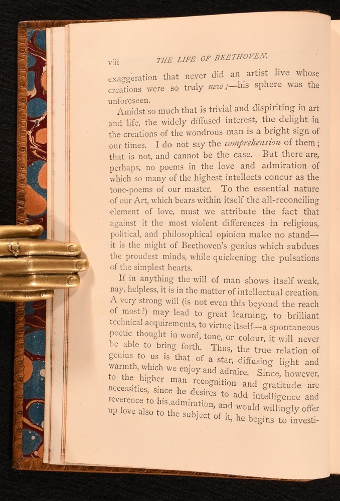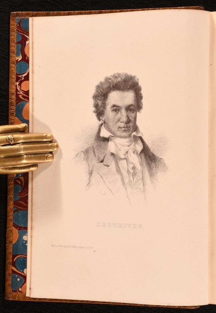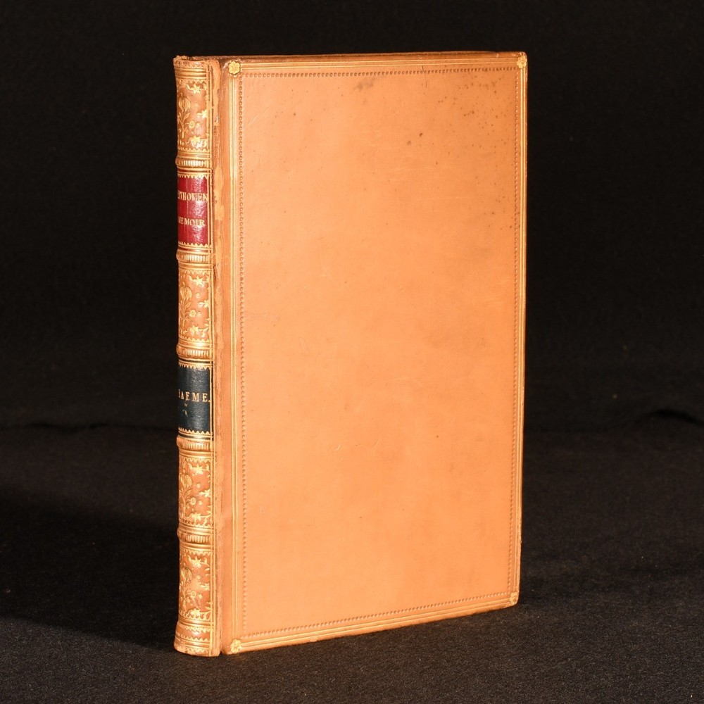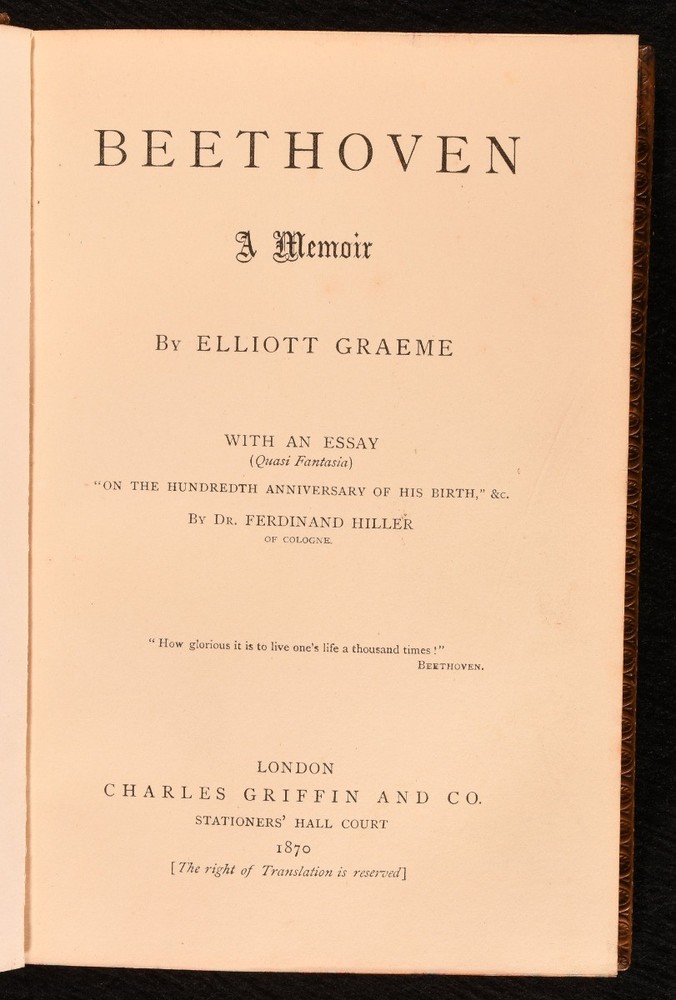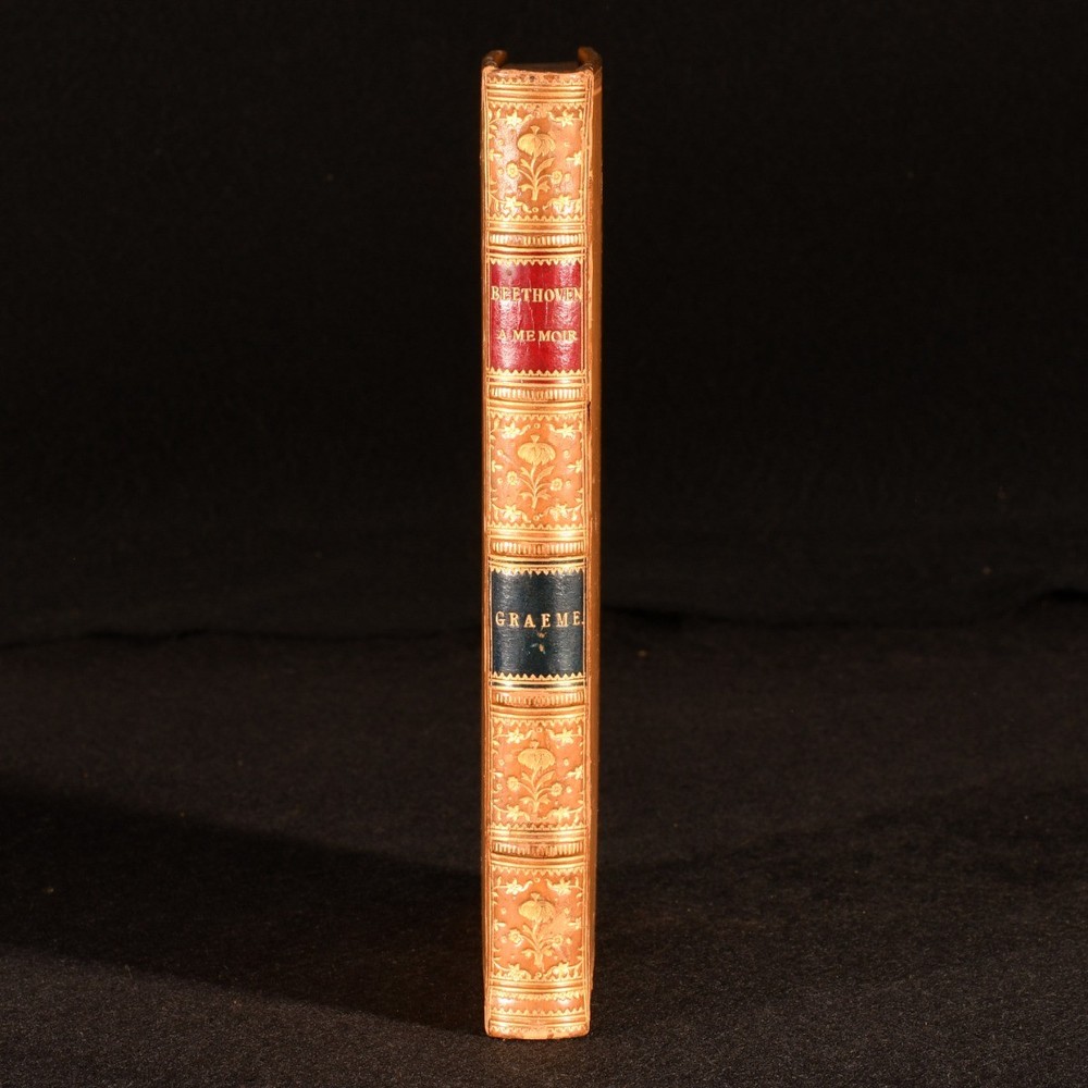 Click here to see our other books! Beethoven: A Memoir Elliott Graeme 1870 Charles Griffin and Co : London 7" by 5" xxi, 184pp. SUMMARY The very scarce first edition of this biographical work by Elliott Graeme on the revered German composer, Beethoven, bound in full calf with gilt decorations. First Edition,Illustrated,Leather Binding,Original Binding,Publishers' Original Binding,Very Scarce Overall Condition: Very Good Indeed This book weighs 0.75 KG when packed UK Postage: £ 3.99 US Postage: £ 19.99 EU Postage : £ 15.99 European Postage: £ 16.99 Asia Postage: £ 21.99 Worldwide Postage: £ 25.99 DESCRIPTION The very scarce first edition. Bound in full calf with gilt decorations to the spine. Illustrated with a monochrome frontispiece, and decorated with head and tail pieces, and illuminated letters. This biography was written by Elliott Graeme, and provides an account of the life of the esteemed German composer, Beethoven. The volume also includes an essay on 'The Hundredth Anniversary of His Birth' by Dr Ferdinand Hiller. CONDITION Bound in full calf. Externally smart, slight rubbing to the joints and extremities, and slight marks to the boards. Internally firmly bound with bright and generally clean pages with light spotting to the blanks, and an owner's stamp to the front blank. Overall Condition: Very Good Indeed GLOSSARY OF TERMS Overall Condition (Dustwrapper condition rating is shown after that for the book itself, where a dustwrapper is present) Fine - Very well preserved copy showing very little wear Very Good Indeed - Only one or two minor faults, really a very attractive copy Very Good - Quite a wide term meaning no major faults but probably several smaller ones often expected given the age of the book, but still a respectable copy Good - Meaning not very good. Some more serious faults as will be described in the condition report under 'condition' Good Only - Meaning one or more faults that could really do with repair Fair - As with good only above but with other faults leaving a compromised copy even after repair Poor - Really bad and possibly seriously incomplete. We only sell books in this condition where their rarity or value makes them attractive none the less. Major defects will be described. GUARANTEE We offer a full money back guarantee on our descriptions. Please ask for details and conditions. We prefer PAYPAL. If you pay via PAYPAL we will post the item off the same or the next working day with the postage you have selected. Please note we cannot accept USD cheques