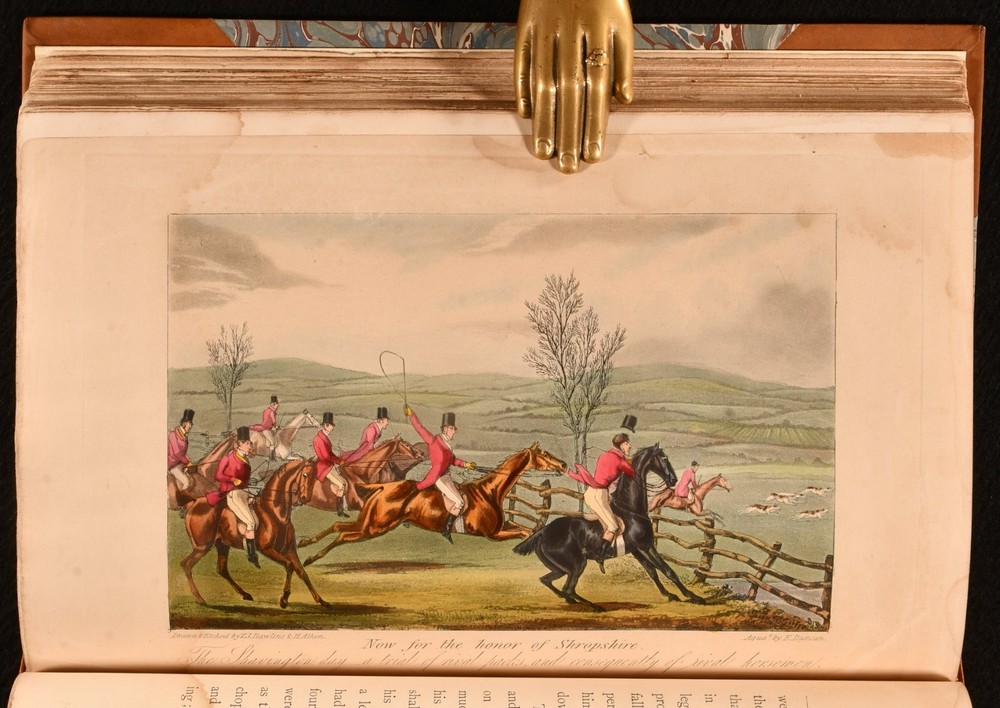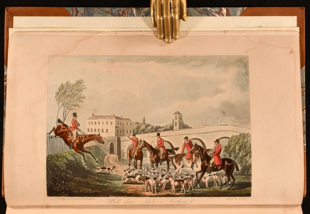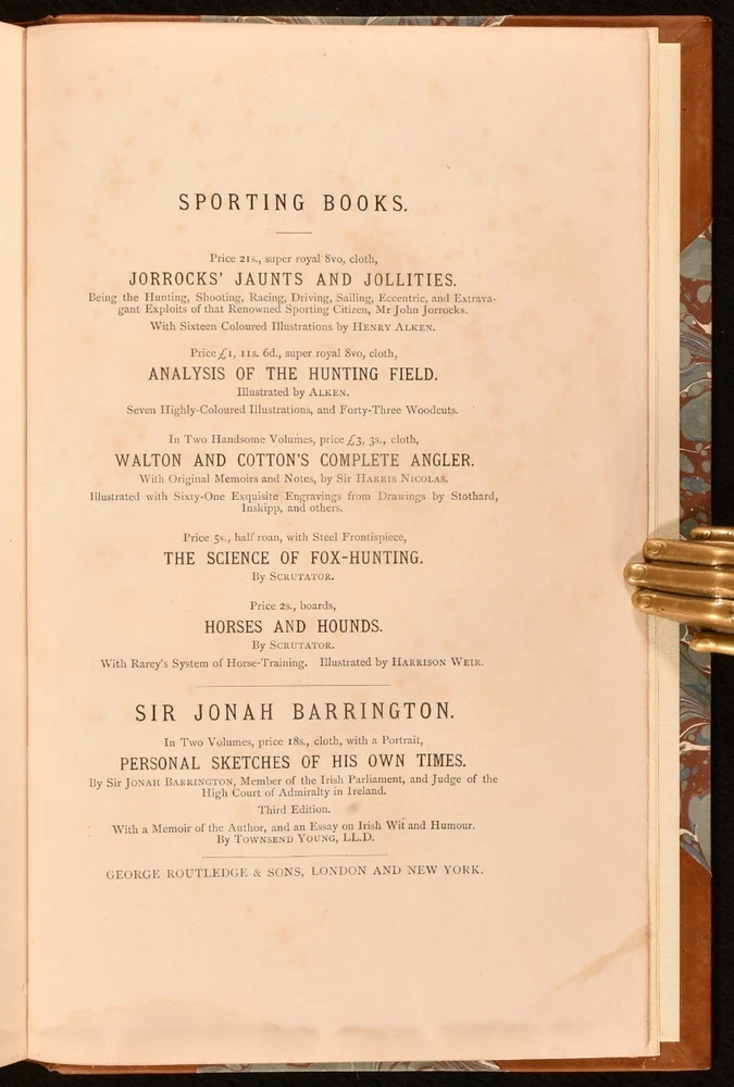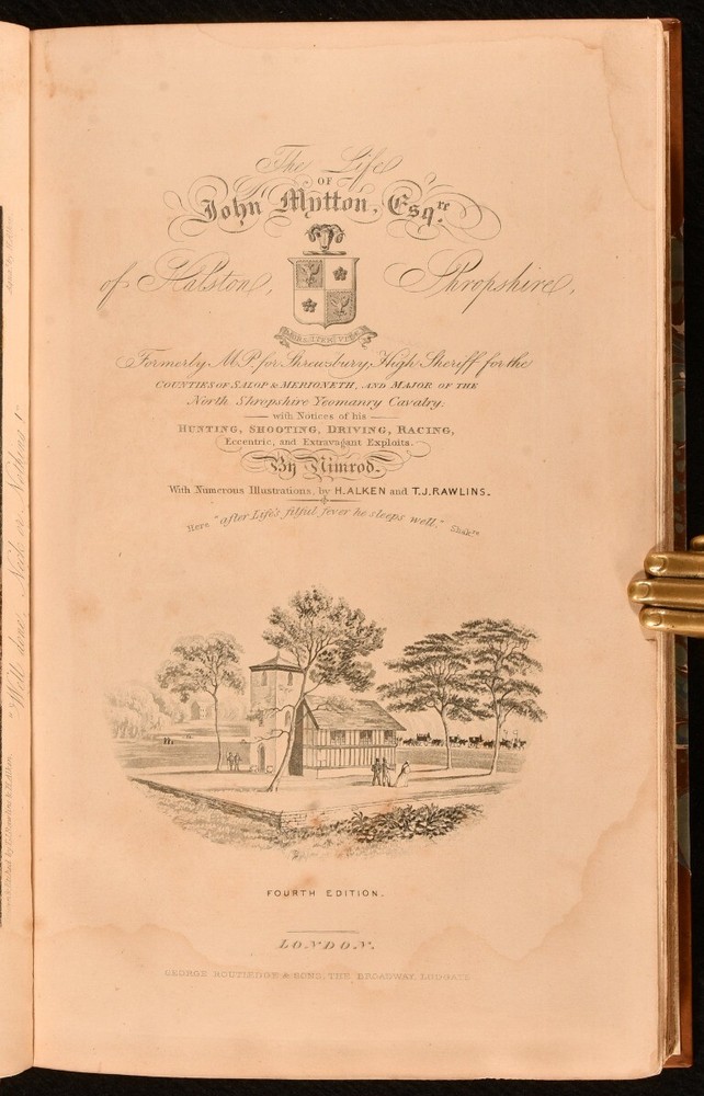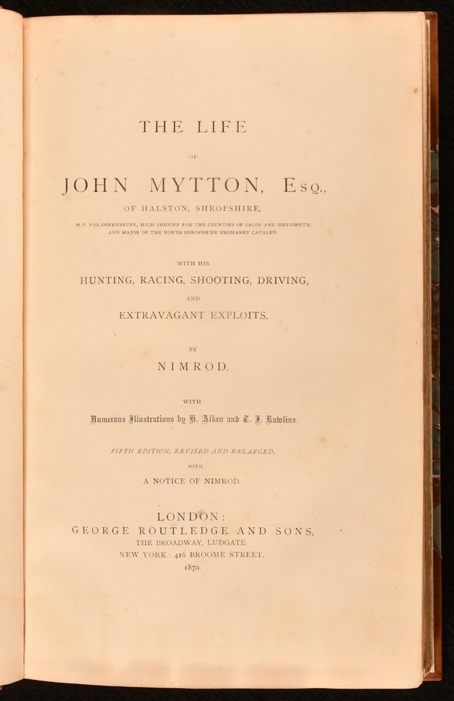 Click here to see our other books! The Life of John Mytton Nimrod [Charles James Apperley] 1870 George Routledge and Sons : London 10.5" by 7" xi [2], 2-234 [2]pp SUMMARY The fifth edition of Nimrod's biography of British eccentric and rake, John 'Mad Jack' Mytton, illustrated with hand coloured plates. Colour Plates,Illustrated,Leather Binding,Rebound Overall Condition: Very Good This book weighs 1 KG when packed UK Postage: £ 3.99 US Postage: £ 22.99 EU Postage : £ 16.99 European Postage: £ 17.99 Asia Postage: £ 22.99 Worldwide Postage: £ 28.99 DESCRIPTION The fifth edition of this work, but with the engraved title page reading 'fourth edition'. Illustrated with an engraved title page, and with eighteen hand coloured plates illustrated by Henry Thomas Alken and T.J. Rawlins. Collated, complete. Known for his eccentric behaviour, this is a wonderful biography of the British Rake John Mytton, a notable figure in Regency era England, who was briefly a Conservative MP. Retaining the original half title, and with two pages of advertisements to the rear. A lovely copy of this beautifully illustrated work. CONDITION Rebound in half calf, with marbled paper covered boards, and endpapers renewed. Externally, fine. Internally, firmly bound. Pages lightly age toned, with tide marks throughout the work to the lower half of the majority of leaves. Light spotting throughout, most concentrated to page perimeters. Overall Condition: Very Good GLOSSARY OF TERMS Overall Condition (Dustwrapper condition rating is shown after that for the book itself, where a dustwrapper is present) Fine - Very well preserved copy showing very little wear Very Good Indeed - Only one or two minor faults, really a very attractive copy Very Good - Quite a wide term meaning no major faults but probably several smaller ones often expected given the age of the book, but still a respectable copy Good - Meaning not very good. Some more serious faults as will be described in the condition report under 'condition' Good Only - Meaning one or more faults that could really do with repair Fair - As with good only above but with other faults leaving a compromised copy even after repair Poor - Really bad and possibly seriously incomplete. We only sell books in this condition where their rarity or value makes them attractive none the less. Major defects will be described. GUARANTEE We offer a full money back guarantee on our descriptions. Please ask for details and conditions. We prefer PAYPAL. If you pay via PAYPAL we will post the item off the same or the next working day with the postage you have selected. Please note we cannot accept USD cheques