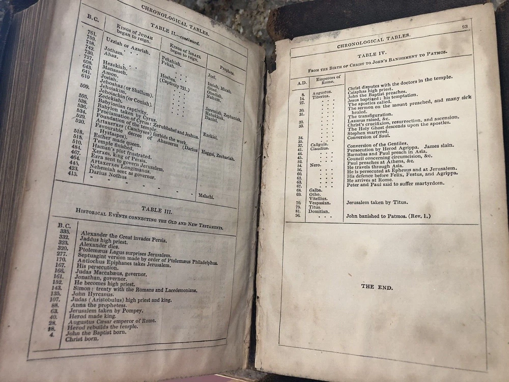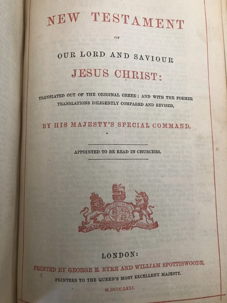 1871 (MDCCCLXXI) Bible References. Gilded edges Note from previous owner. Includes a map of the Roman Empire, in color. 4 1/4" x 6 1/2" x 2" Bible weighs approximately 1 pound 7 ounces. More photos are available,upon request.