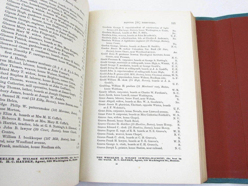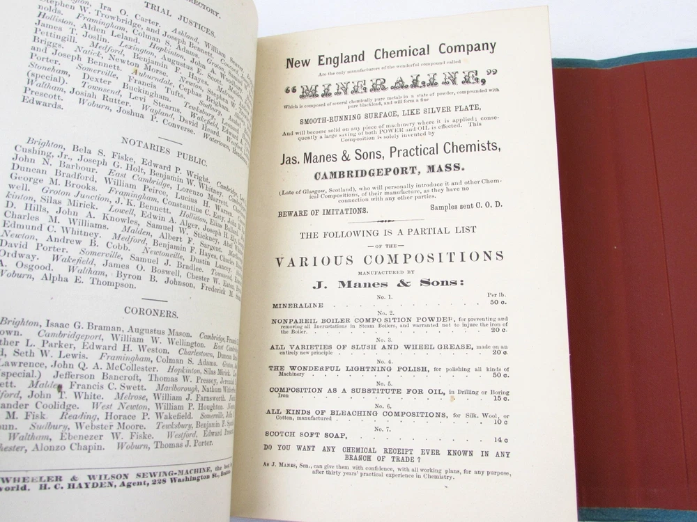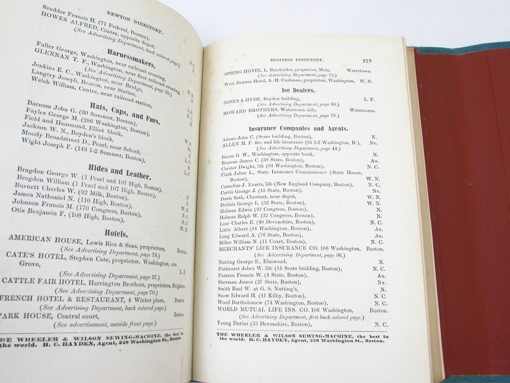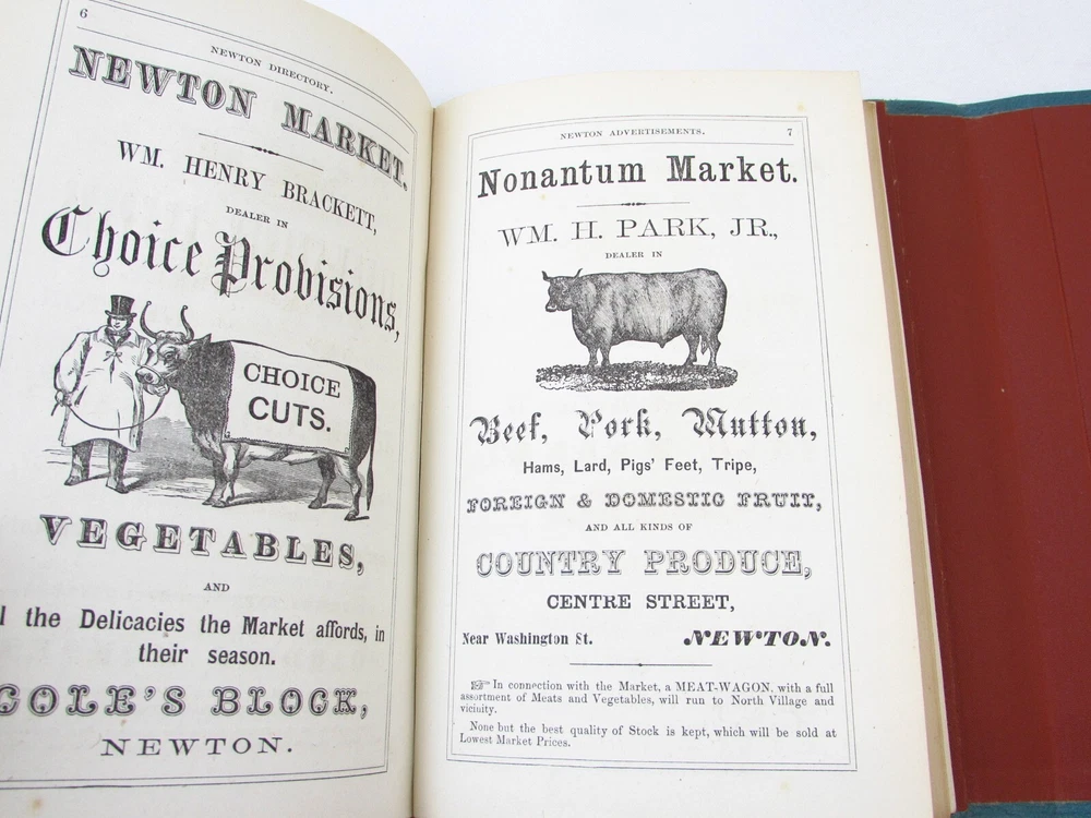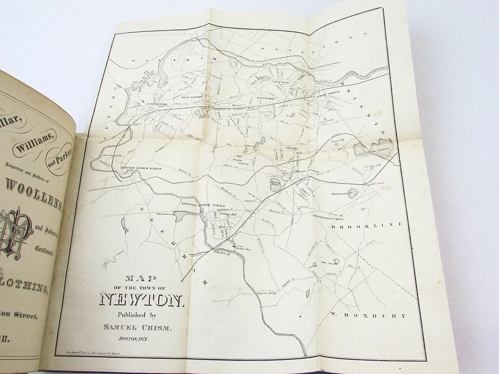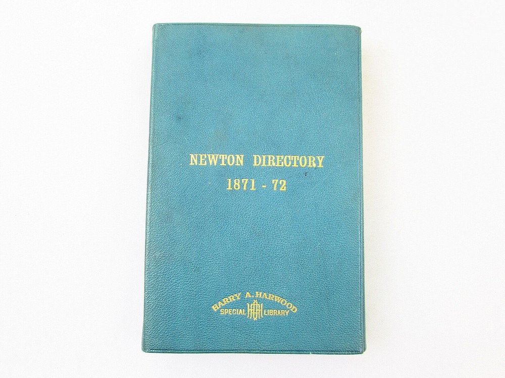 ______________________________________________________________________________________________ 1871-72 Newton Directory - Containing a General Directory of the Citizens and a Business Directory - Published by Samuel Chism - Copyright 1871 - Leather binding with gilt lettering I believe this was rebound in leather between ~1910-1930 based on knowledge of the estate collection this came from. The binding is relatively unusual, as it includes a third protective flap. Over 100 pages of advertisements with many illustrations. Includes cloth-backed, fold-out map. Moderate handling wear and evidence of age, very clean/tight overall. See photos. FREE Shipping within the U.S. via USPS Media Mail!!! Expedited and International shipping available. Please let me know if you have any questions and I'll be glad to help.