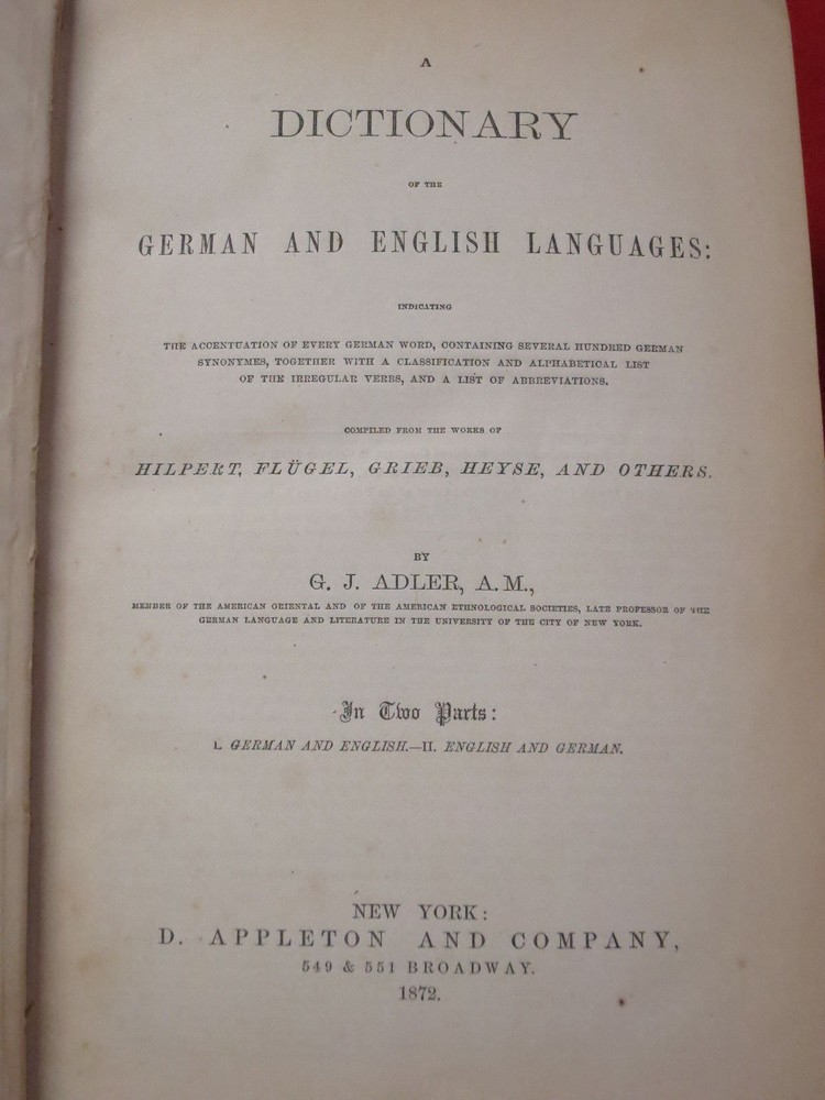 Dictionary Of The GERMAN AND ENGLISH LANGUAGES G.J. Adler D. Appleton And Company Check out my other items ! Be sure to add me to your favorites list !