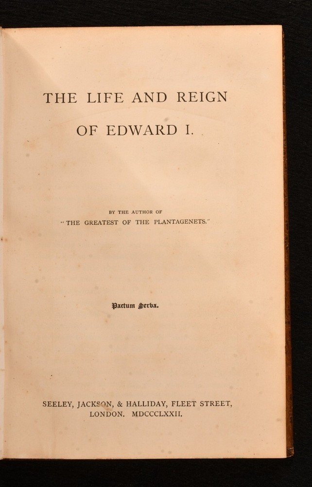 Click here to see our other books! The Life and Reign of Edward I Robert Benton Seeley 1872 Seeley, Jackson, & Halliday : London 8" by 5.5" [2], xvi,352, [2pp.] SUMMARY A smart, leather-bound copy of Robert Benton Seeley's biographical work on Edward I. First Edition,Leather Binding,Scarce Overall Condition: Very Good This book weighs 0.75 KG when packed UK Postage: £ 3.99 US Postage: £ 19.99 EU Postage : £ 15.99 European Postage: £ 16.99 Asia Postage: £ 21.99 Worldwide Postage: £ 25.99 DESCRIPTION First edition, rebound in a full calf binding. Written by publisher and author, Robert Benton Seeley. This biographical work covers the life and reign of Edward I, who was King of England from 1272 until 1307. With chapters on Edward's childhood, the war with France in 1297 and the troubles in Scotland during his reign. With a frontispiece of Edward I, after the engraving by Vertue, from the statue at Carnarvon Castle. CONDITION Rebound in a full calf binding. Externally, smart, with light rubbing to the joints. Damp staining to the boards, mainly to the rear and a touch to the lower front. Light bumping to the extremities and the odd mark to the leather. Internally firmly bound. Pages bright and clean with the occasional spot. Small tide mark to the first few pages. Overall Condition: Very Good GLOSSARY OF TERMS Overall Condition (Dustwrapper condition rating is shown after that for the book itself, where a dustwrapper is present) Fine - Very well preserved copy showing very little wear Very Good Indeed - Only one or two minor faults, really a very attractive copy Very Good - Quite a wide term meaning no major faults but probably several smaller ones often expected given the age of the book, but still a respectable copy Good - Meaning not very good. Some more serious faults as will be described in the condition report under 'condition' Good Only - Meaning one or more faults that could really do with repair Fair - As with good only above but with other faults leaving a compromised copy even after repair Poor - Really bad and possibly seriously incomplete. We only sell books in this condition where their rarity or value makes them attractive none the less. Major defects will be described. GUARANTEE We offer a full money back guarantee on our descriptions. Please ask for details and conditions. We prefer PAYPAL. If you pay via PAYPAL we will post the item off the same or the next working day with the postage you have selected. Please note we cannot accept USD cheques
