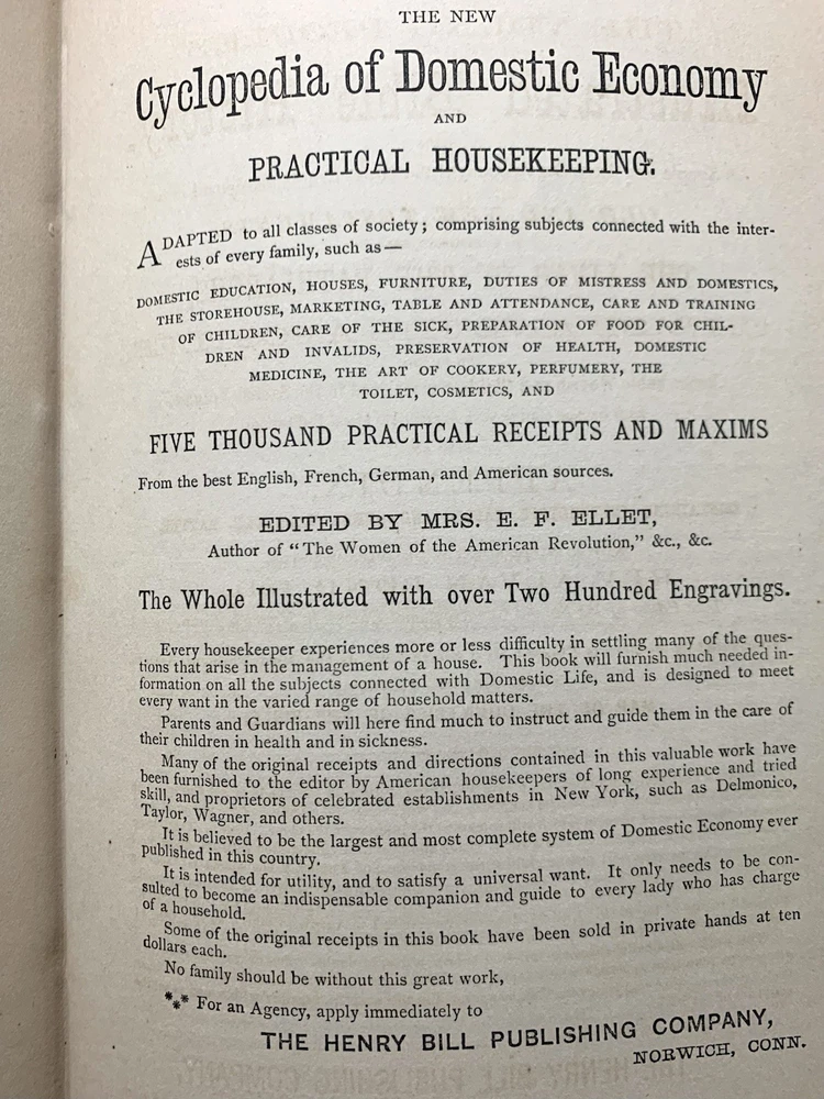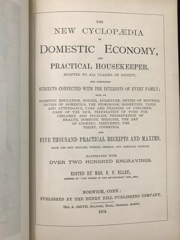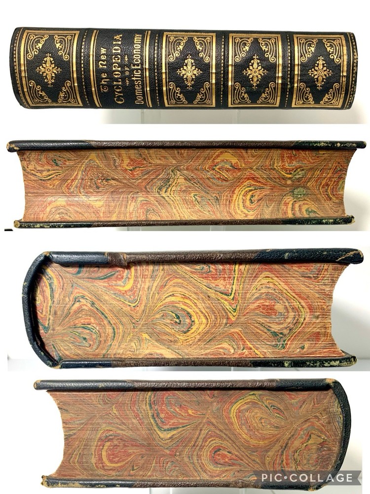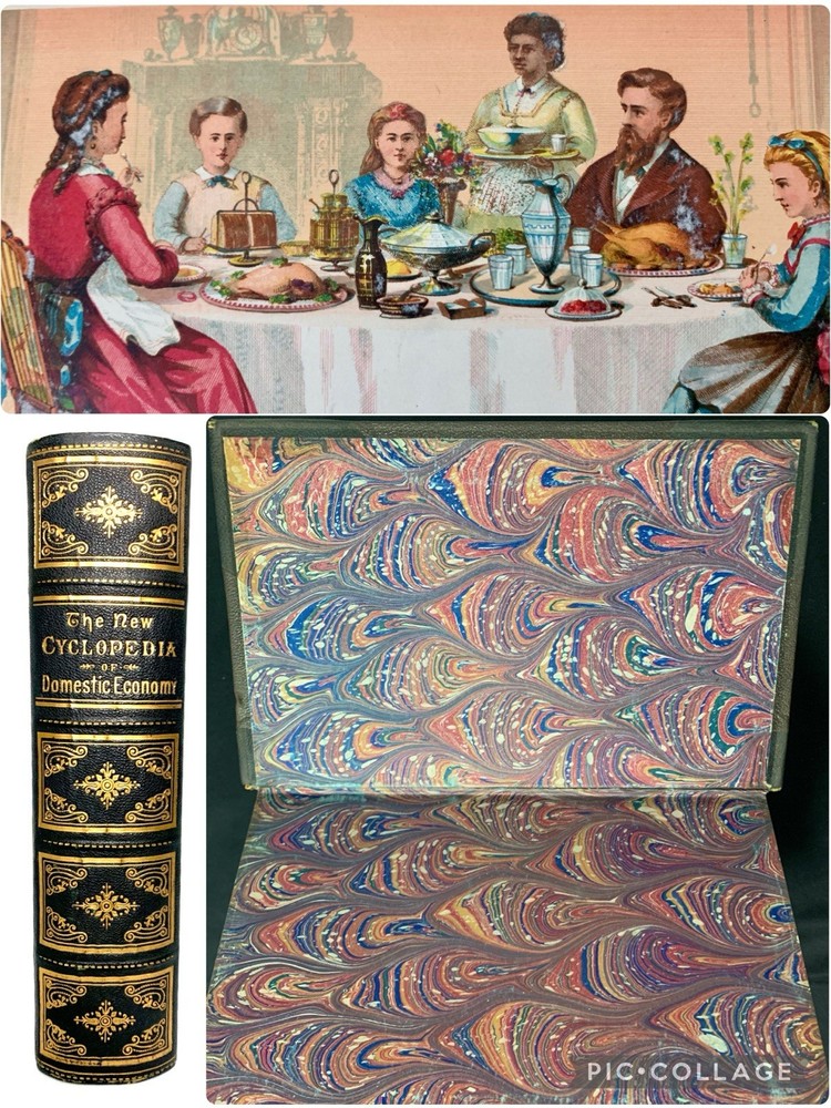 Author/Editor: Ellet, Mrs. E.F. 2. Title: The New Cyclopedia of Domestic Economy 3. Place: Norwich, Conn. 4. Date: 1873 5. Publisher: Henry Bill Publishing Co. 6. Binding: Finely bound in ¾ leather with gilt stamped decorated compartments and title, gilt applied to spine and corner edges 7. IIlustrated: “with over 200 engravings” plus 2 color plates. 8. Pages: 603 (including Index) plus 9 pages of publisher’s ads including one for this book and an engraving of the publisher’s establishment. 9. Endpapers: Beautifully marbled endpapers and edges. 10. Dust Jacket: N/A 11. Condition: corners are bumped and worn, slight spots of wear on exterior hinges, bump at lower left interior (also shows a small bit on exterior) front cover and at upper left interior of rear cover. Lower left corner of rear endpaper is lightly rubbed. Color plate frontispiece has some small foreign substance appearing on the servant and father. The binding is solid and appears the book perhaps was never read. Very clean with no marks of any kind. Please see photos for more details. Purchases within four days are eligible for combined shipping.