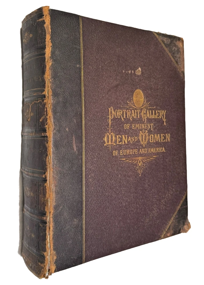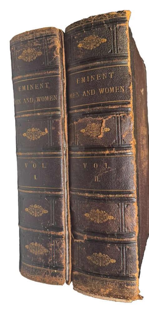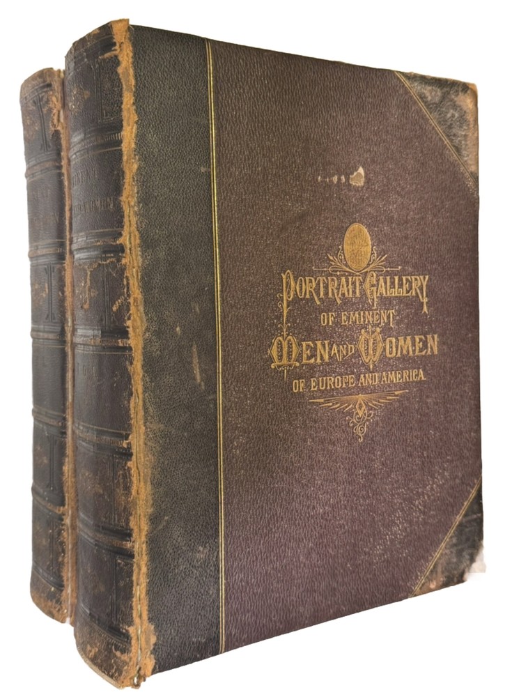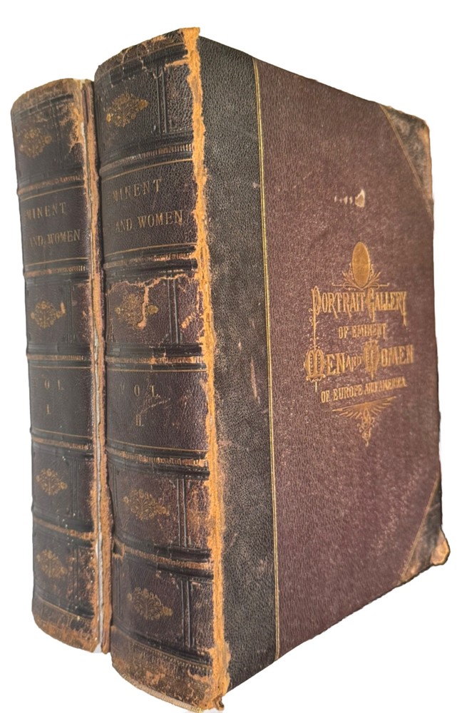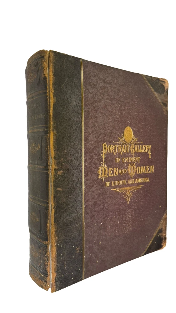Portrait Gallery of Eminent Men and Women of Europe and America: Embracing History, Statesmanship, Naval and Military Life, Philosophy, The Drama, Science, Literature and Art with Biographies by Evert A. Duyckinck. Published in 1873 by Johnson, Wilson and Company in New York City. Complete in two volumes. Illustrated with hundreds of highly finished, beautiful full-page steel engravings from the original portraits by the most celebrated artists. Each engraving is tissue-guarded. Large, heavy quartos. Each volume is 11.25” x 8.5” x2.5” thick. Fine leather binding: 1/2 dark brown Moroccan leather over what appears to be 1/2 brown pebble leather. Gilt lettering and design work. 5 raised spine bands. Full gilt page edges. This would have been an exceptionally expensive book set during its time. Condition: OVERALL GOOD Exterior: FAIR and could do with a rebind or professional repair. Front board is detached on Volume I. Hinges and joints are weak and/or splitting in both volumes. Heavily rubbed boards, spine and corners. Cracks in spine leather. Interior: VERY GOOD - Volume I front pastedown has ex-libris bookplate. One of the blank front free endpapers appears to have been cut down to 1/2 size and reattached. There are occasional areas of smudges or stains or spots of water dampening or a small tear along the margin but mostly quite clean and fresh looking with minimal toning and no writing. Mostly foxing free except for the rare spot or two, mostly on the endpapers. ABOUT THE AUTHOR Evert Augustus Duyckinck (pronounced DIE-KINK) (November 23, 1816 – August 13, 1878) was an American publisher and biographer. He was associated with the literary side of the Young America movement in New York. In 1845, he assisted Edgar Allan Poe in printing his Tales collection and selected which stories to include. The collection was a critical success, though Poe was somewhat disappointed by Duyckinck's choices. In 1847 he became the editor of The Literary World, a weekly review of books written with his brother George Long Duyckinck until 1853. The two brothers became the unofficial leaders of the New York literary scene in the 1840s into the 1850s. Herman Melville, a close friend of Duyckinck's with whom he corresponded often, refers in his novel Mardi (1849) to Duyckinck's highbrow magazine Arcturus by naming a ship in the book Arcturion. Please see pictures as they are an important part of the condition description. As a fellow book collector, I know how frustrating it can be when items aren’t accurately described or poorly packaged for shipping. That is why I (1) take a lot of pictures and try to describe condition issues as accurately as possible and (2) pack your book purchases with the utmost care before shipping. I have been selling and buying on eBay for over 10 years and have a 100% satisfaction rating, and offer a 100% satisfaction guarantee 30-day return policy. Please follow me as I have thousands of highly collectible books to list in the coming weeks and months!