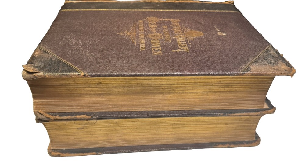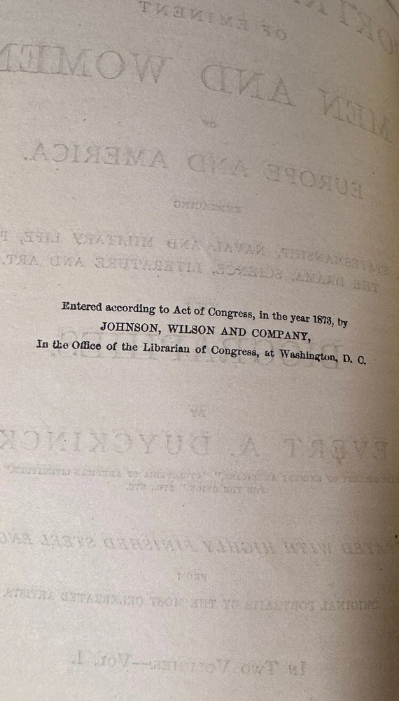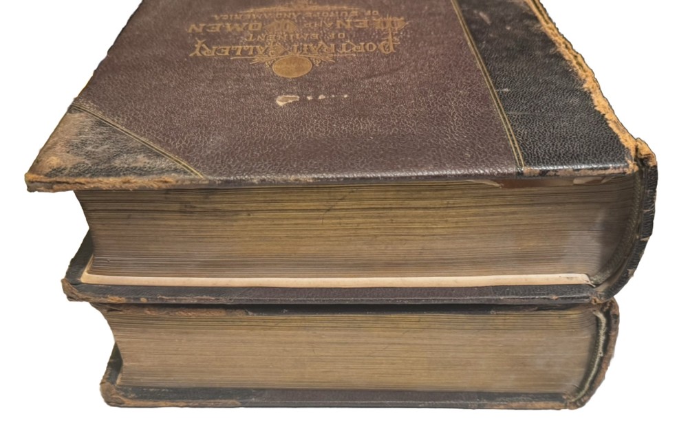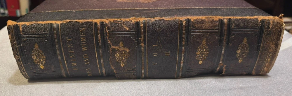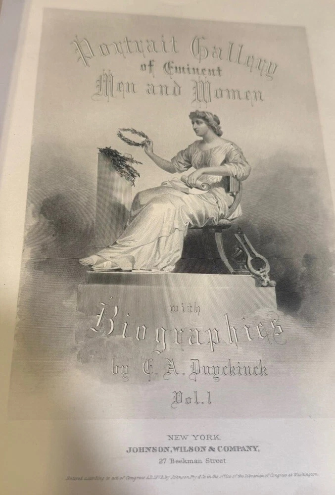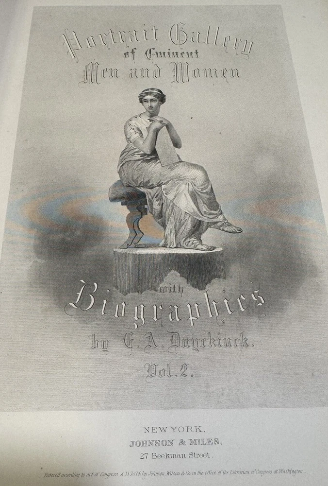 Portrait Gallery of Eminent Men and Women of Europe and America: Embracing History, Statesmanship, Naval and Military Life, Philosophy, The Drama, Science, Literature and Art with Biographies by Evert A. Duyckinck. Published in 1873 by Johnson, Wilson and Company in New York City. Complete in two volumes. Illustrated with hundreds of highly finished, beautiful full-page steel engravings from the original portraits by the most celebrated artists. Each engraving is tissue-guarded. Large, heavy quartos. Each volume is 11.25” x 8.5” x2.5” thick. Fine leather binding: 1/2 dark brown Moroccan leather over what appears to be 1/2 brown pebble leather. Gilt lettering and design work. 5 raised spine bands. Full gilt page edges. This would have been an exceptionally expensive book set during its time. Condition: OVERALL GOOD Exterior: FAIR and could do with a rebind or professional repair. Front board is detached on Volume I. Hinges and joints are weak and/or splitting in both volumes. Heavily rubbed boards, spine and corners. Cracks in spine leather. Interior: VERY GOOD - Volume I front pastedown has ex-libris bookplate. One of the blank front free endpapers appears to have been cut down to 1/2 size and reattached. There are occasional areas of smudges or stains or spots of water dampening or a small tear along the margin but mostly quite clean and fresh looking with minimal toning and no writing. Mostly foxing free except for the rare spot or two, mostly on the endpapers. ABOUT THE AUTHOR Evert Augustus Duyckinck (pronounced DIE-KINK) (November 23, 1816 – August 13, 1878) was an American publisher and biographer. He was associated with the literary side of the Young America movement in New York. In 1845, he assisted Edgar Allan Poe in printing his Tales collection and selected which stories to include. The collection was a critical success, though Poe was somewhat disappointed by Duyckinck's choices. In 1847 he became the editor of The Literary World, a weekly review of books written with his brother George Long Duyckinck until 1853. The two brothers became the unofficial leaders of the New York literary scene in the 1840s into the 1850s. Herman Melville, a close friend of Duyckinck's with whom he corresponded often, refers in his novel Mardi (1849) to Duyckinck's highbrow magazine Arcturus by naming a ship in the book Arcturion. Please see pictures as they are an important part of the condition description. As a fellow book collector, I know how frustrating it can be when items aren’t accurately described or poorly packaged for shipping. That is why I (1) take a lot of pictures and try to describe condition issues as accurately as possible and (2) pack your book purchases with the utmost care before shipping. I have been selling and buying on eBay for over 10 years and have a 100% satisfaction rating, and offer a 100% satisfaction guarantee 30-day return policy. Please follow me as I have thousands of highly collectible books to list in the coming weeks and months!