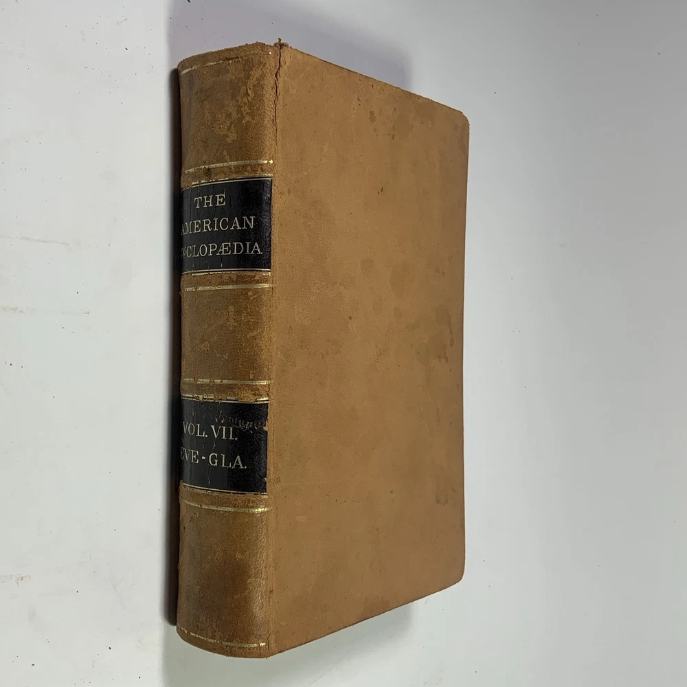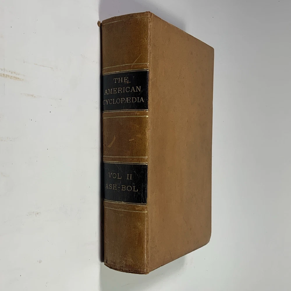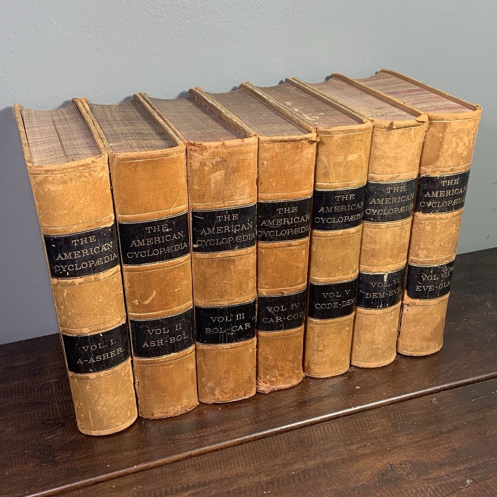 This is a partial set of The American Cyclopaedia , volumes I through VII, published by D. Appleton & Co. The set includes: Volume I (1873) Volume II (1873) Volume III (1873) Volume IV (1879) Volume V (1879) Volume VI (1874) Volume VII (1874) These are the first seven volumes in sequence, though from varying years of publication. All are original 19th-century editions, leather-bound with marbled page edges. Condition: The leather covers show typical wear for their age, including corner and edge damage, surface peeling, and some splitting along the spine joints. All covers remain securely attached. Page edges also show discoloration and wear from age and handling. Inside, the pages are aged but in good, readable condition. Most are unmarked, though some volumes may contain prior owner notations such as pricing, acquisition dates, names, or dates completed. A solid partial set for collectors, historical research, or period decor. Feel free to reach out with questions or additional photos. Free shipping within the continental U.S. only. The American Cyclopaedia, D. Appleton, antique encyclopedia, Victorian reference books, leather-bound books, partial set 1800s, collectible history, vintage nonfiction, historical library decor