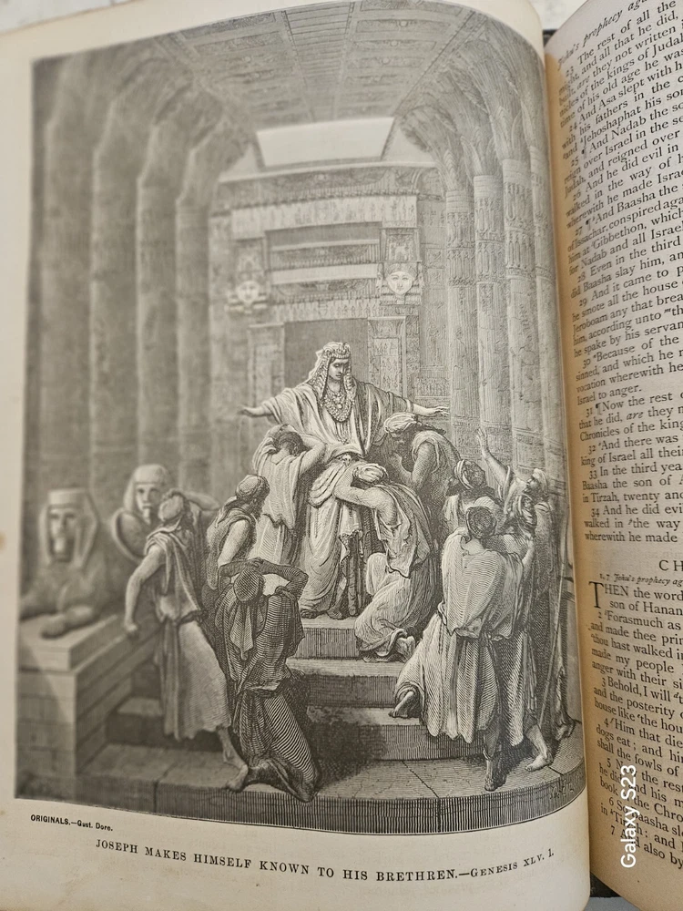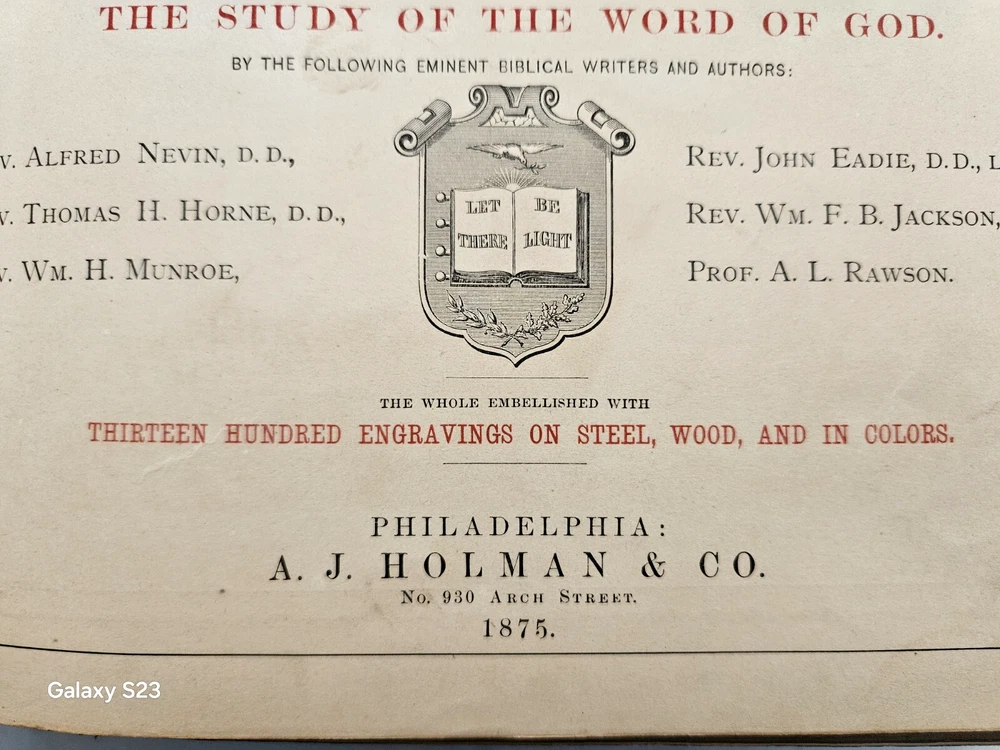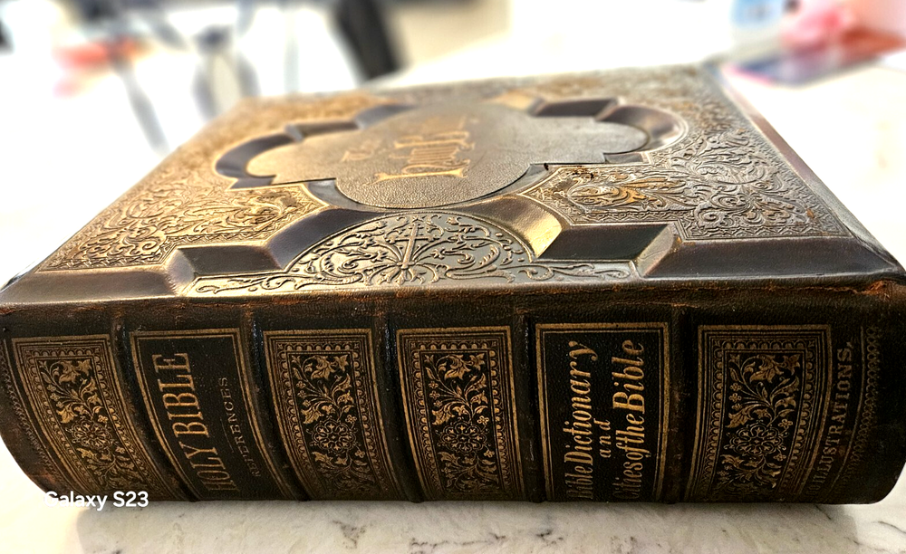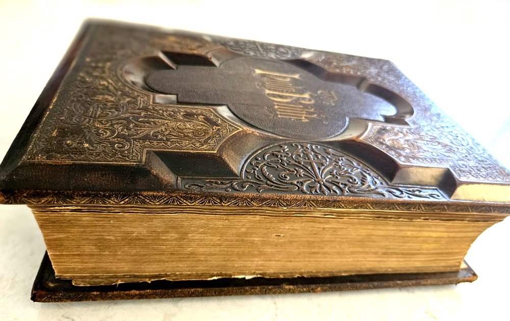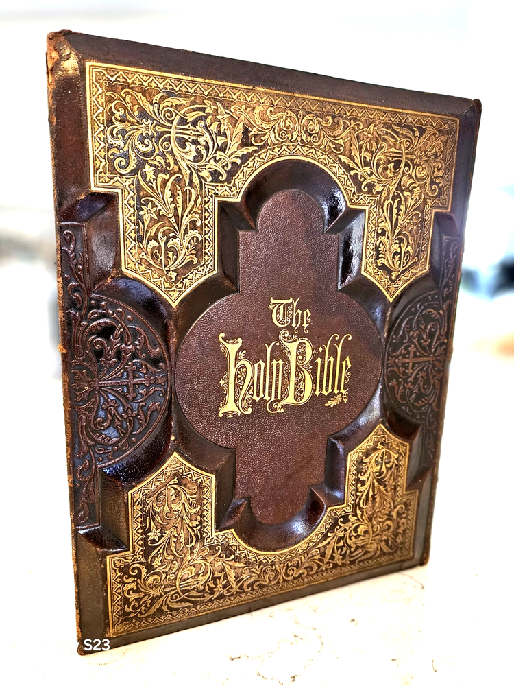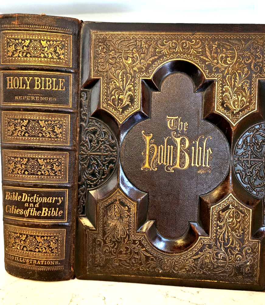 1874 Philadelphia publication 13x10.5x4.25 embossed leather 1300 Gustave Dore and other great artists full page engraves-etchings. Not many colored pictures being a bit older than 1980 publications... Binding is very firm, covers good, spine in great condition. few pages on the front side has been taped and attached. please ask for more pictures if need to get a full idea of the condition... its 160 year old bible!