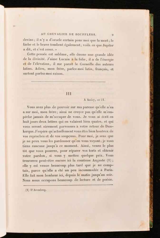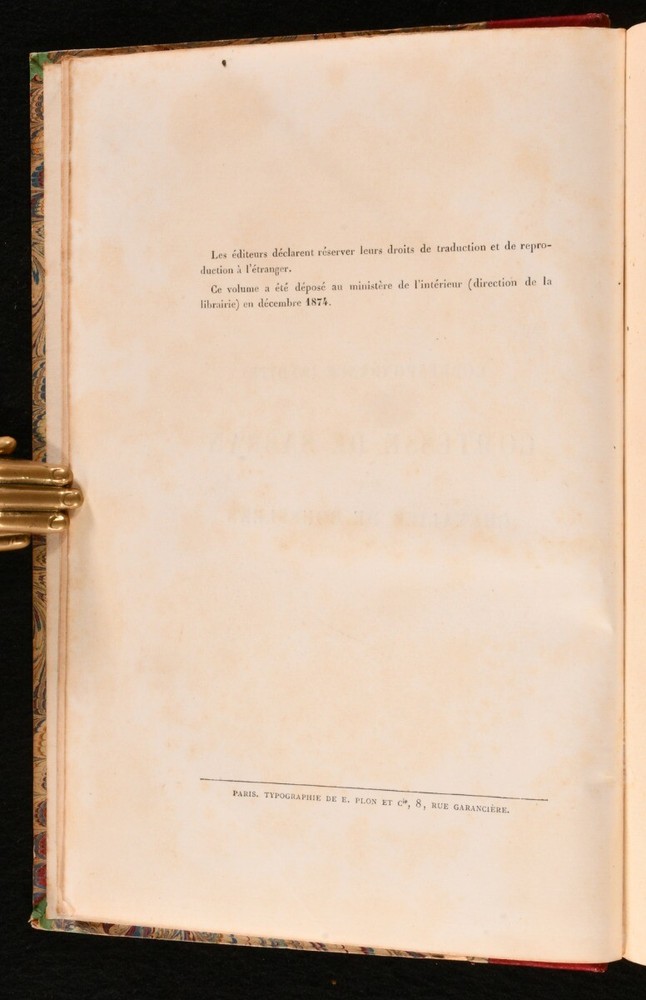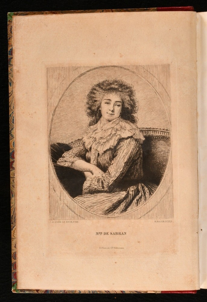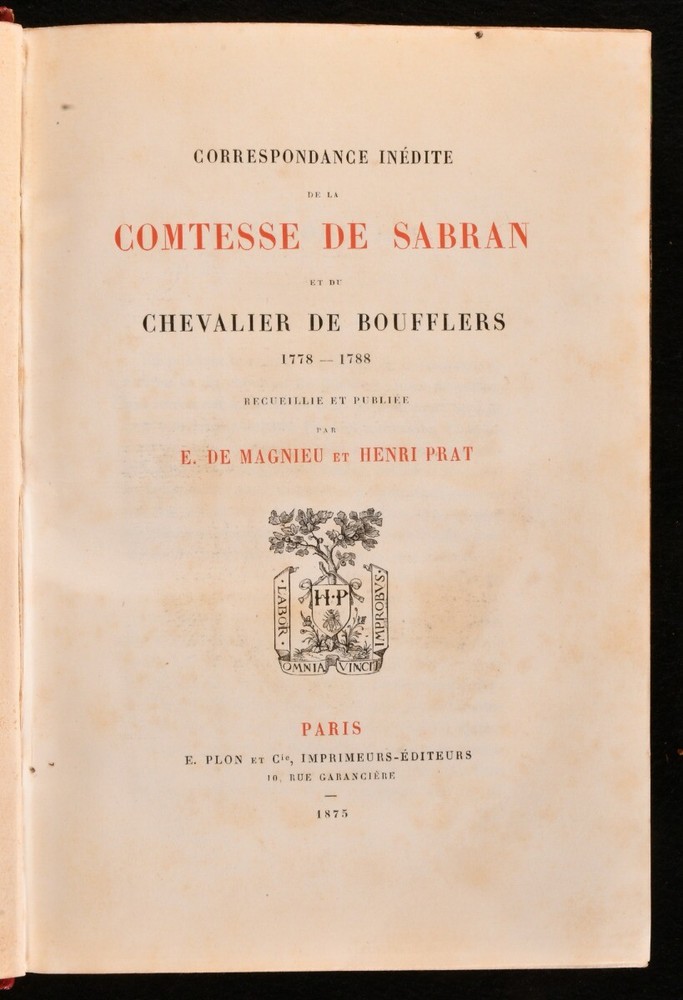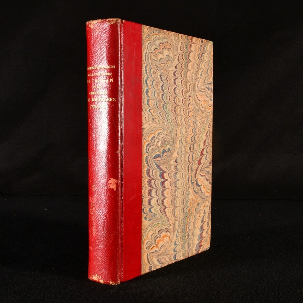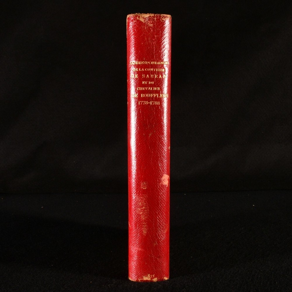 Click here to see our other books! Correspondance Inedite de la Comtesse de Sabran et du Chevalier de Boufflers 1778-1788 Comtesse de Sabran; Chevalier de Boufflers; E. de Magnieu (ed); Henri Prat (ed) 1875 E. Plon : Paris 9.5" by 6.5" xvi, 526 [1]pp SUMMARY A leather bound, first edition copy of letters from the Comtesse de Sabran and the Chevalier de Boufflers, written during the French Revolution. First Edition,Leather Binding Overall Condition: Very Good This book weighs 1 KG when packed UK Postage: £ 3.99 US Postage: £ 22.99 EU Postage : £ 18.99 European Postage: £ 19.99 Asia Postage: £ 22.99 Worldwide Postage: £ 28.99 DESCRIPTION The first edition of this work. Illustrated with a frontispiece depicting the Comtesse de Sabran. Correspondance inédite de la Comtesse et de Sabran du Chevalier de Boufflers is a collection of letters written in 1778-1788 during the French Revolution. These letters provided a point of view from the side of the aristocrats as they watched the gruesome events unfolding around them. The Comtesse de Sabran (1749-1827), also known as Francoise Eleonore Dejean de Manville, was a French socialite and letter writer who eventually married the Chevalier de Boufflers. These letters show the gradual maturing of their relationship. Collated, complete. CONDITION In quarter morocco binding, with marbled boards. Externally, smart, with some light rubbing to the spine. Internally, firmly bound. Age-toning to the frontispiece and a few instances of scattered spotting to the pages, though many pages remain bright and clean. Overall Condition: Very Good GLOSSARY OF TERMS Overall Condition (Dustwrapper condition rating is shown after that for the book itself, where a dustwrapper is present) Fine - Very well preserved copy showing very little wear Very Good Indeed - Only one or two minor faults, really a very attractive copy Very Good - Quite a wide term meaning no major faults but probably several smaller ones often expected given the age of the book, but still a respectable copy Good - Meaning not very good. Some more serious faults as will be described in the condition report under 'condition' Good Only - Meaning one or more faults that could really do with repair Fair - As with good only above but with other faults leaving a compromised copy even after repair Poor - Really bad and possibly seriously incomplete. We only sell books in this condition where their rarity or value makes them attractive none the less. Major defects will be described. GUARANTEE We offer a full money back guarantee on our descriptions. Please ask for details and conditions. We prefer PAYPAL. If you pay via PAYPAL we will post the item off the same or the next working day with the postage you have selected. Please note we cannot accept USD cheques