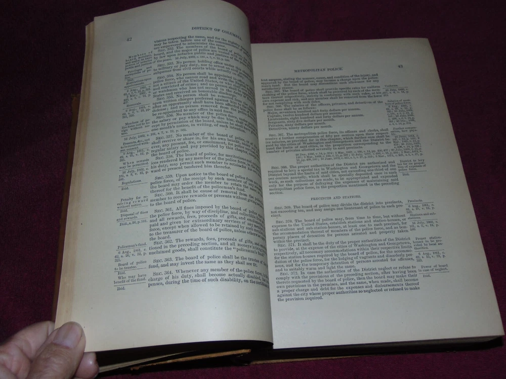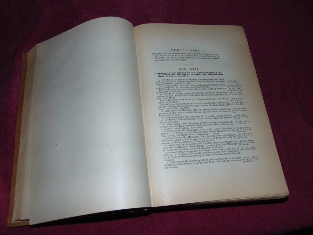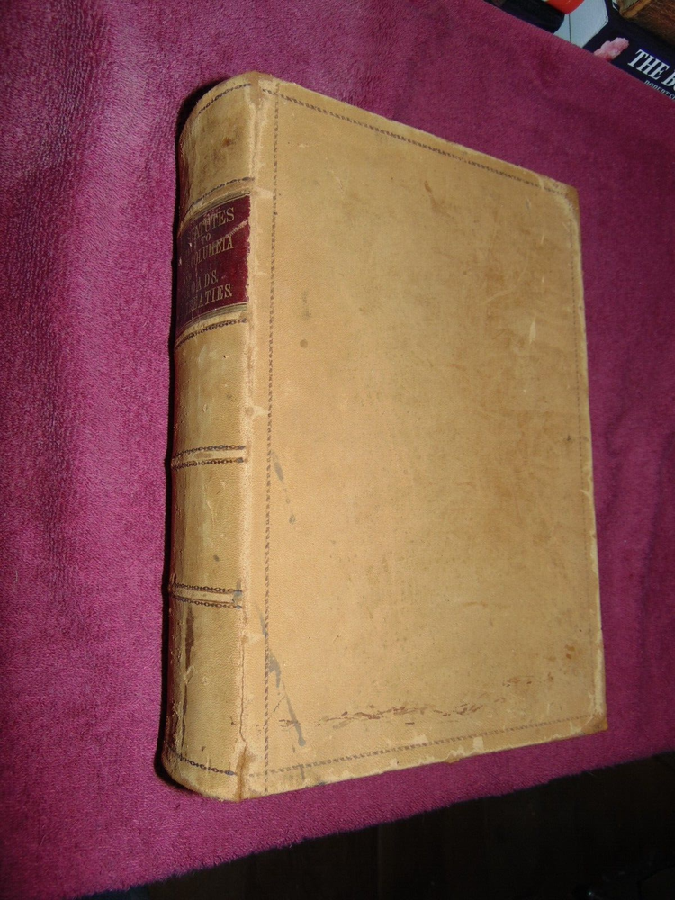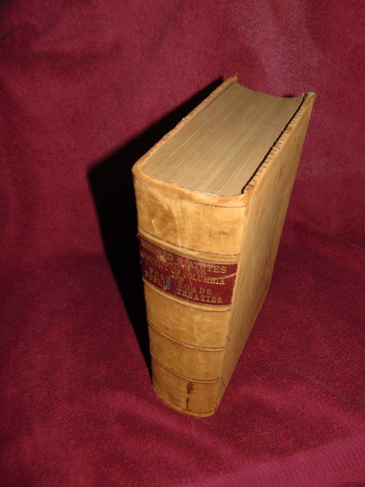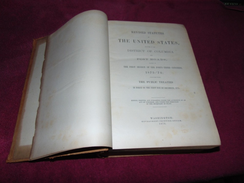 ORIGINAL 1875 SUEDE LEATHER-ON -BOARD HARDBACK BOOK: REVISED STATUTES OF THE UNITED STATES, RELATING TO THE DISTICT OF COLUMBIA AND POST ROADS, PASSED AT THE FIRST SESSION OF THE FORTY-THIRD CONGRESS, 1873-'74; TOGETHER WITH THE PUBLIC TREATIES IN FORCE ON THE FIRST DAY OF DECEMBER, 1873" (WASHINGTON: GOVERNMENT PRINTING OFFICE) ... .............. 1,446 CLEAN, TIGHTLY-BOUND PAGES ................ MEASURES 8" X 11 3/4" X 3" THICK .................. WEIGHS 8 1/2 POUNDS ................... LEATHER BOARDS HAVE SCUFFING, BUMPED CORNERS ...................... OVERALL GOOD, SOLID BOOK. ----------------------------------------- WILL BE SECURELY SHIPPED IN CARDBOARD FOR A SAFE JOURNEY TO YOUR HOME.